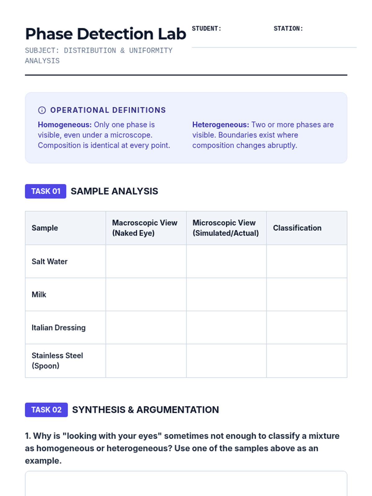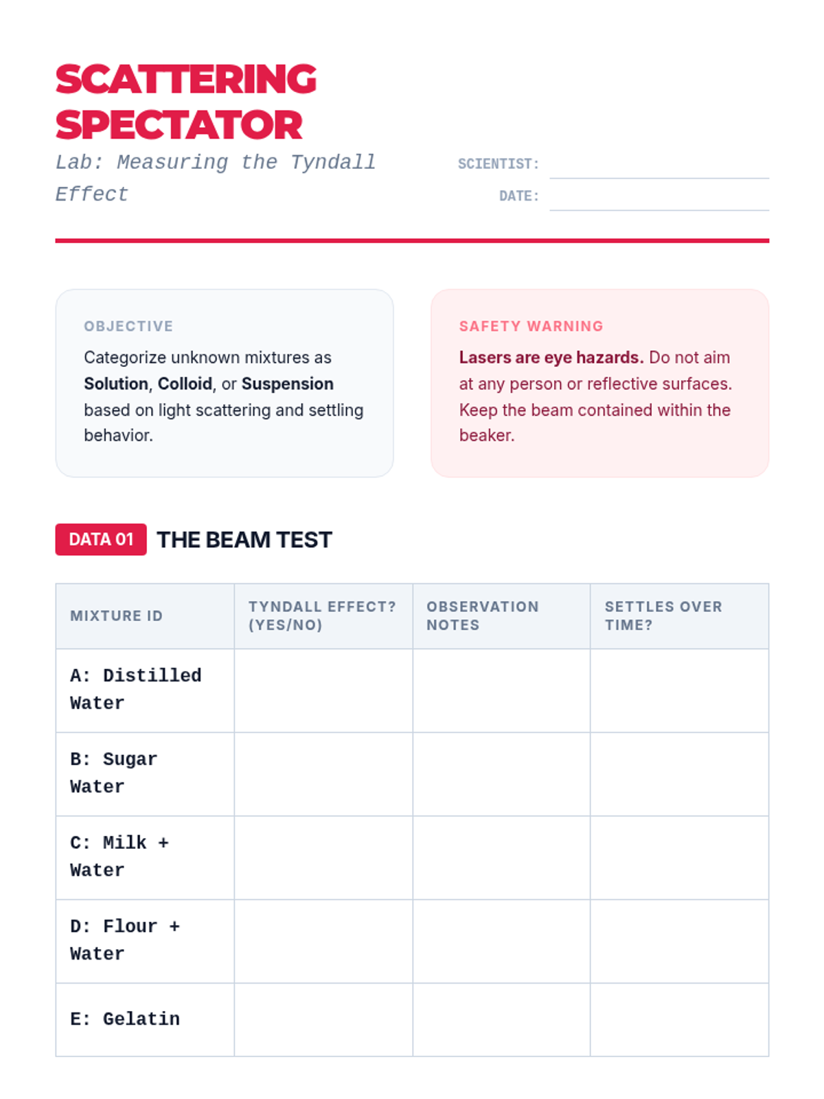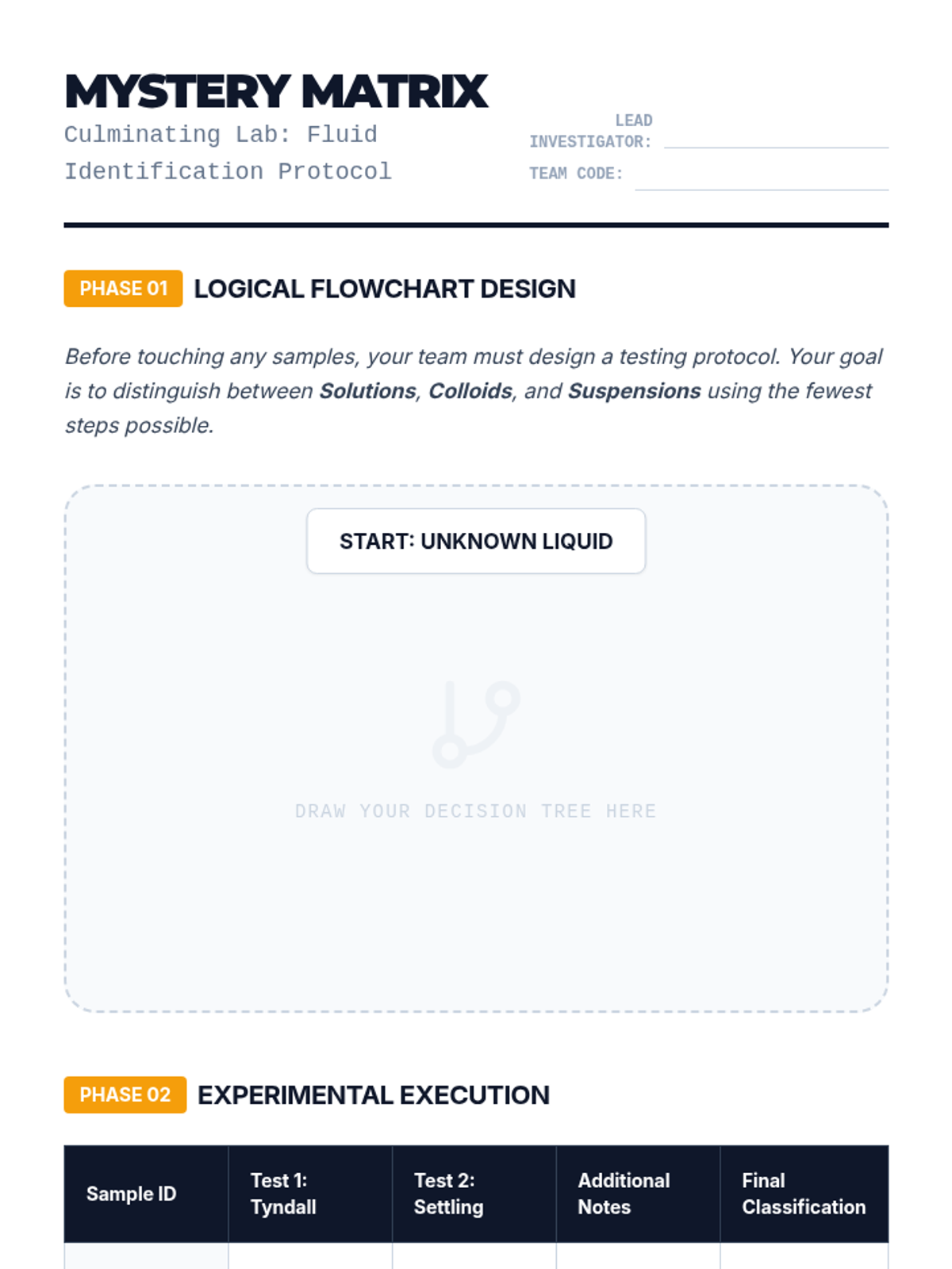 An inquiry-based exploration of matter classification, focusing on the physical properties of homogeneous and heterogeneous mixtures. Students use particle modeling, the Tyndall effect, and solubility analysis to distinguish between solutions, colloids, and suspensions.