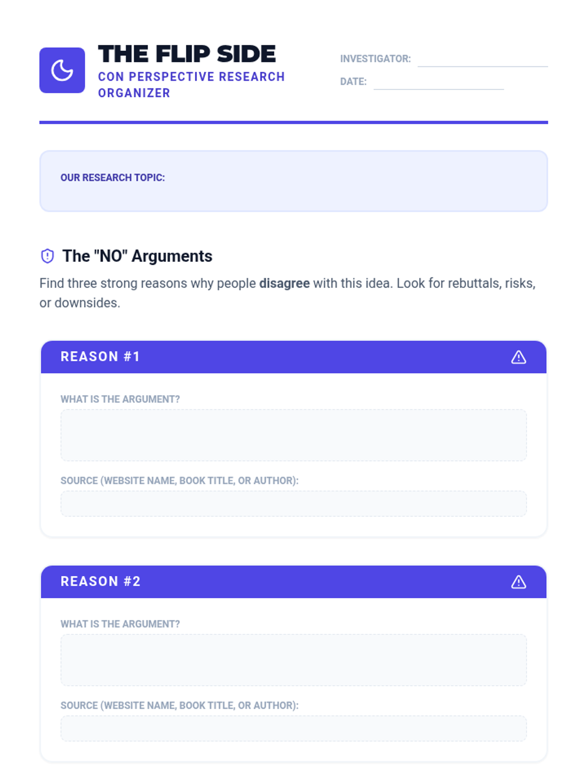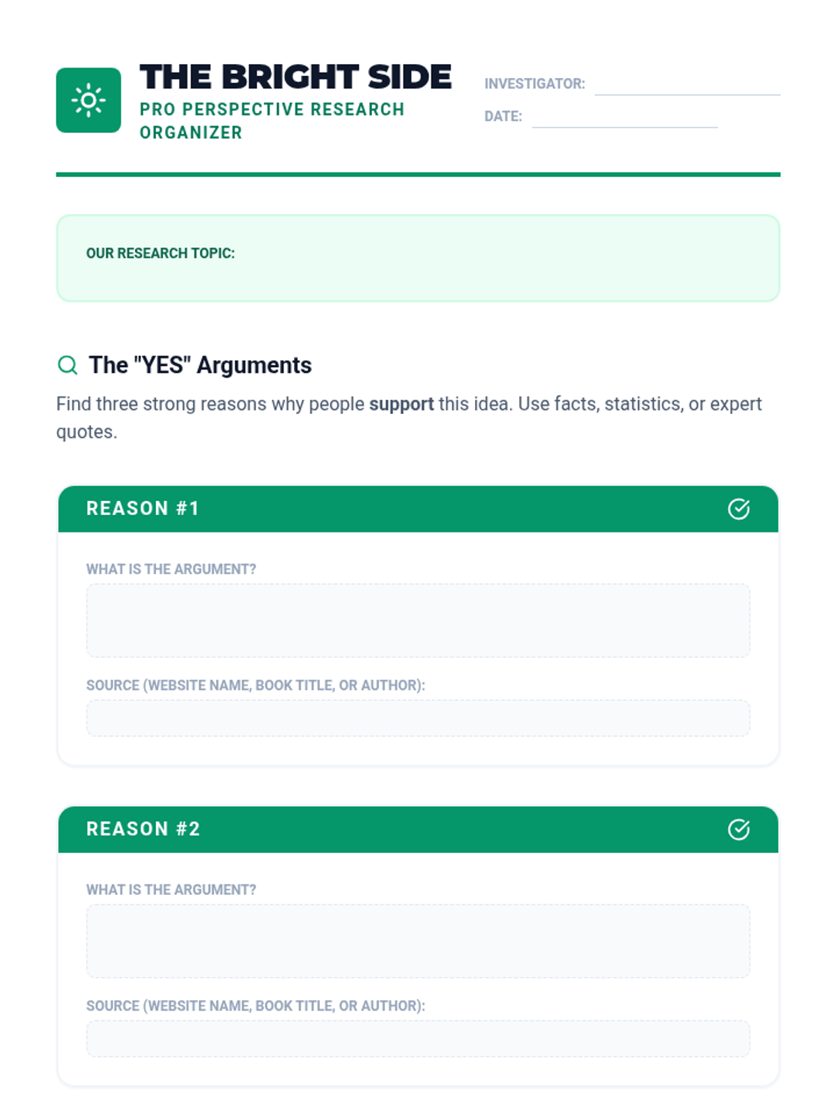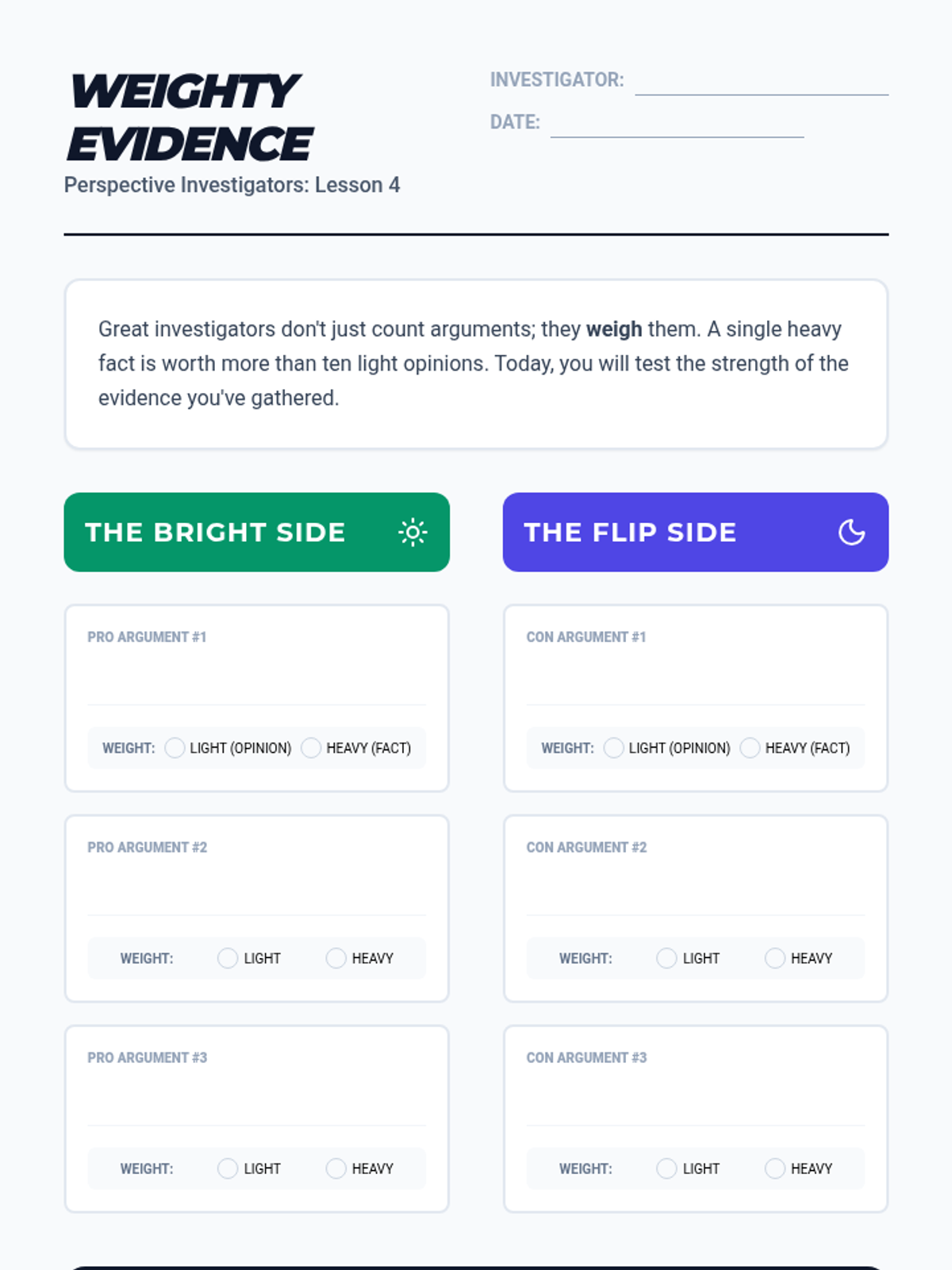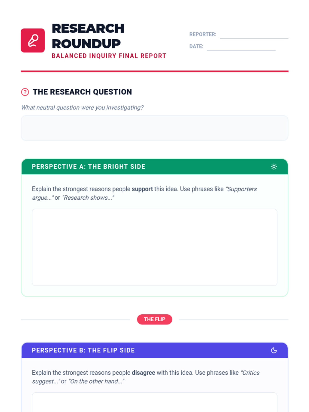 This inquiry-based sequence teaches 4th-grade students to broaden their research to include multiple viewpoints. Students move from asking neutral questions to investigating both 'Pro' and 'Con' sides of an issue, evaluating evidence strength, and synthesizing their findings into a balanced report.