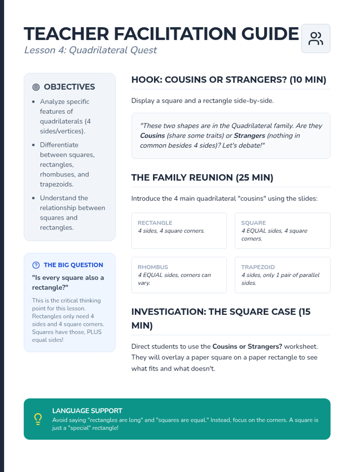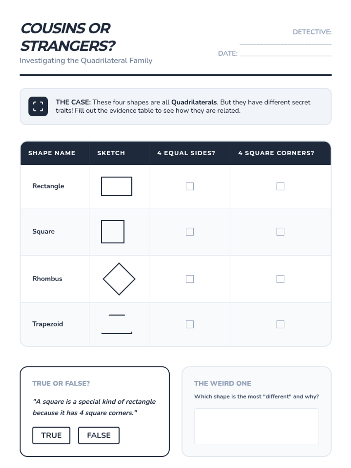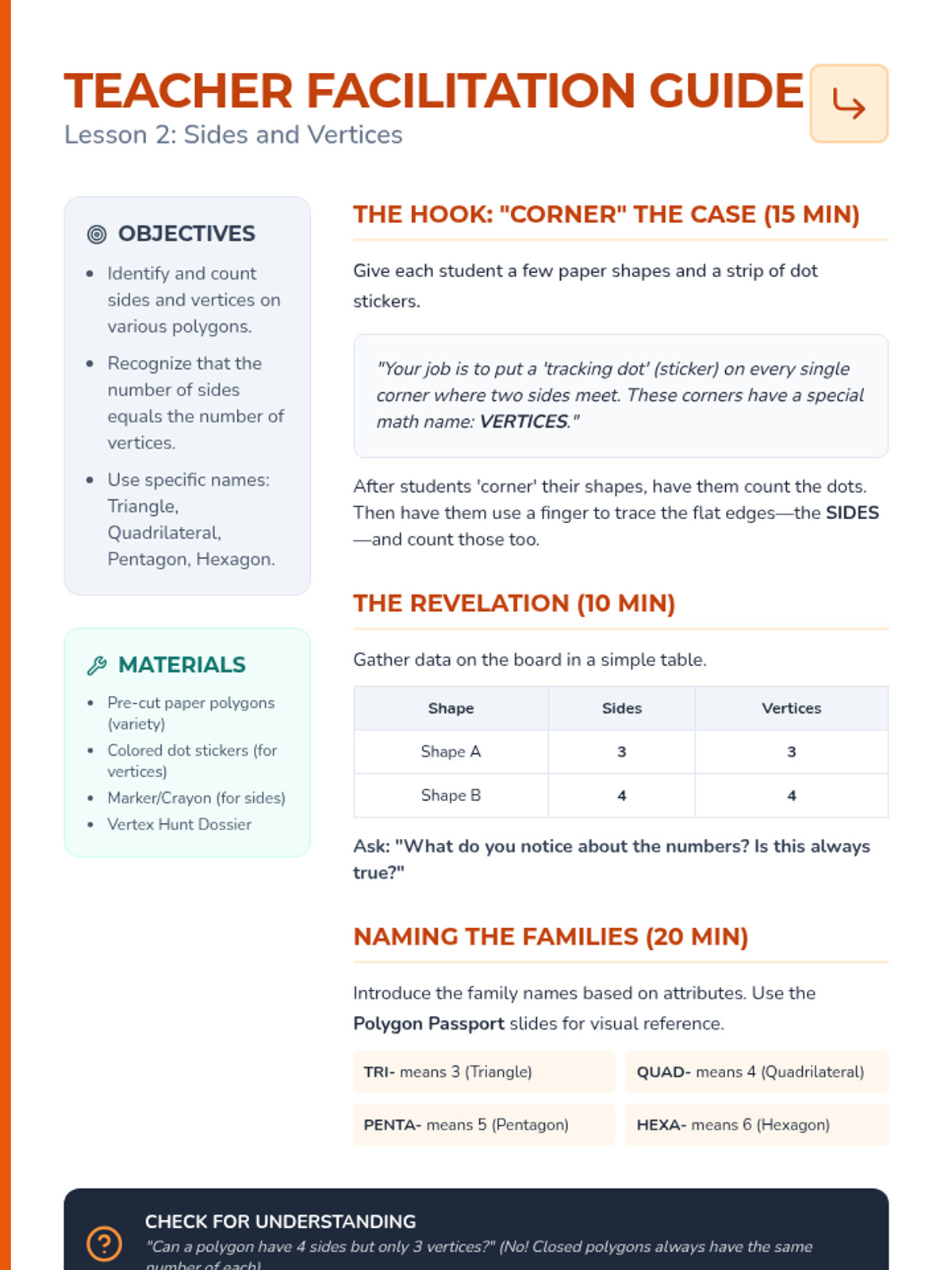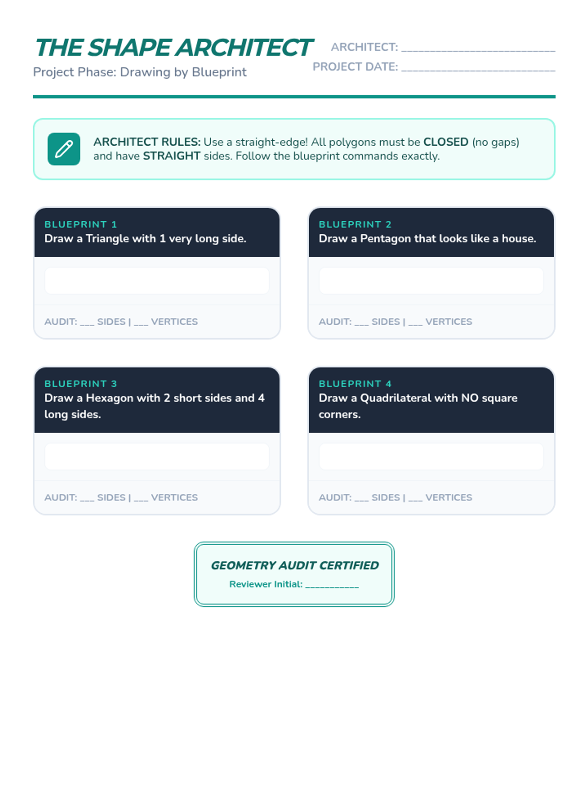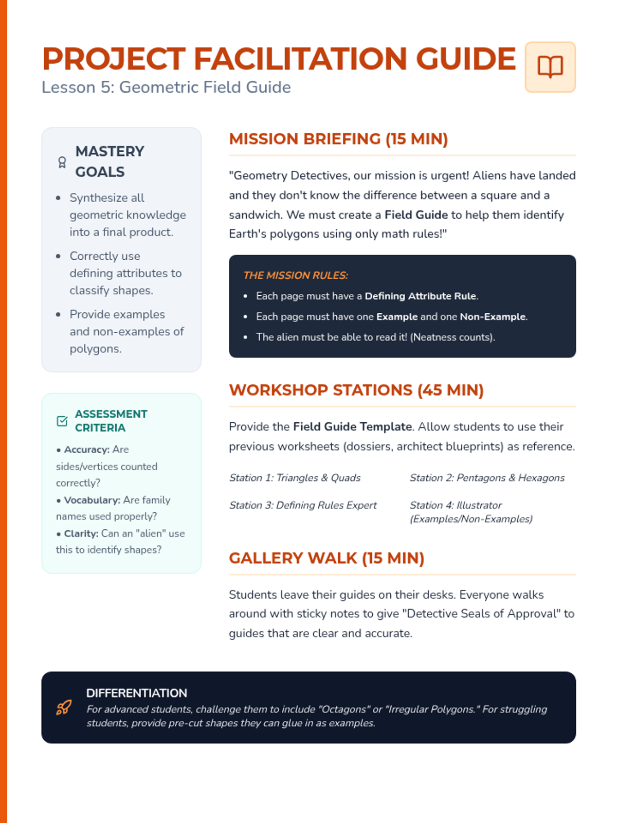 This inquiry-based geometry unit for 2nd grade focuses on defining attributes of two-dimensional polygons. Students move from sorting shapes by observation to drawing them by specific geometric rules, ultimately creating a comprehensive field guide of polygons.
