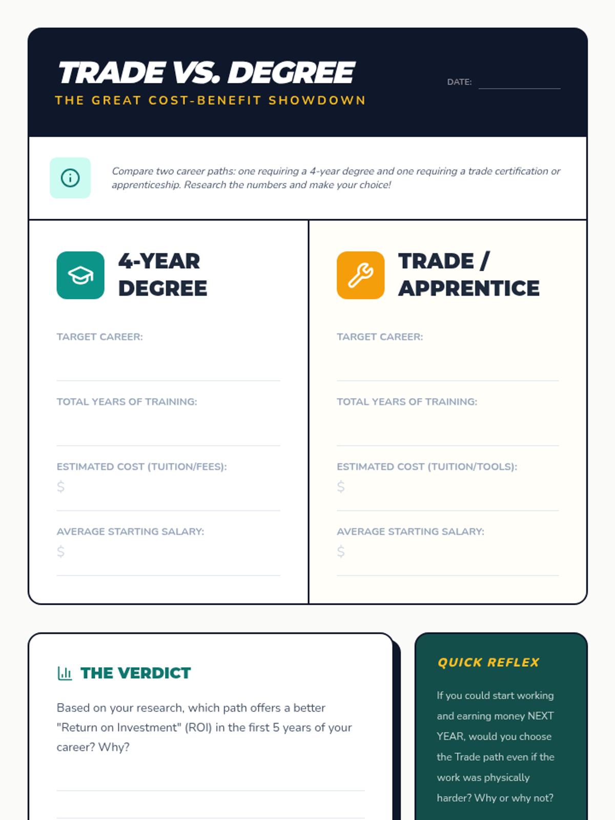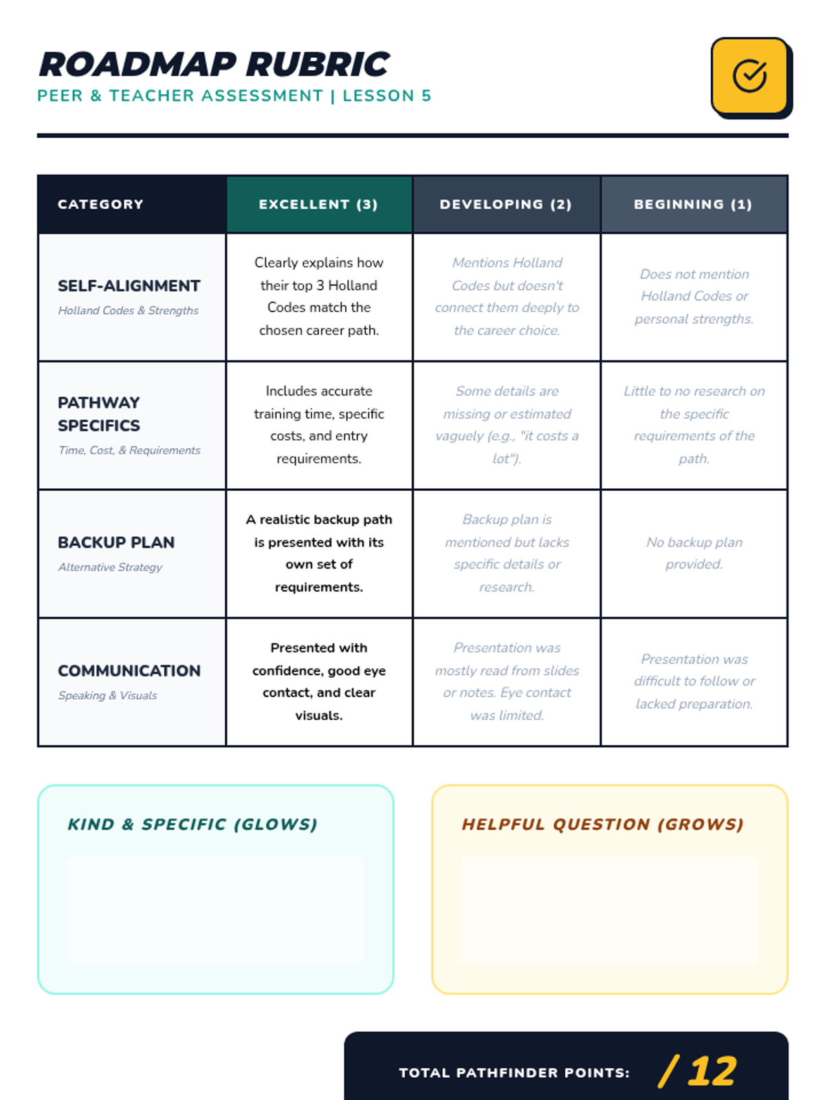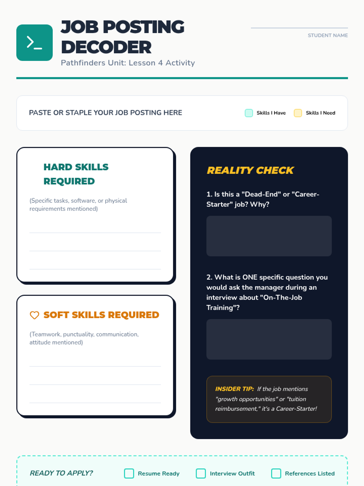 A comprehensive 9th-grade transition planning unit that guides students through self-assessment and the investigation of higher education, vocational training, and direct workforce entry pathways. Students align their personal strengths with future opportunities to create a viable post-secondary roadmap.