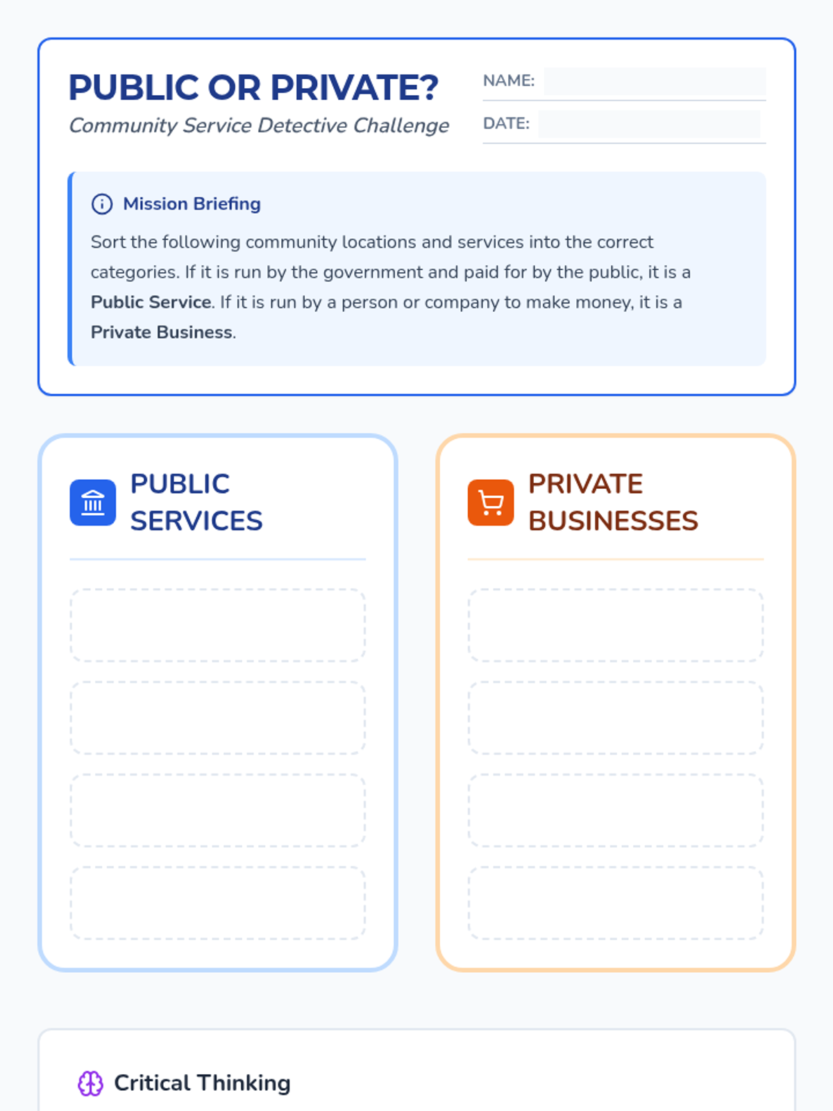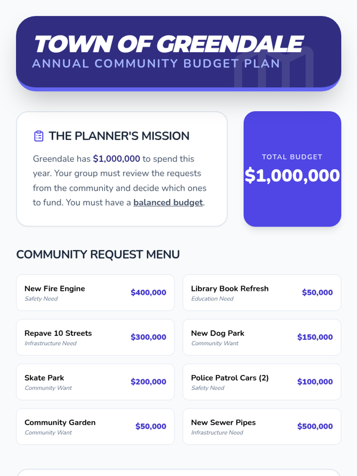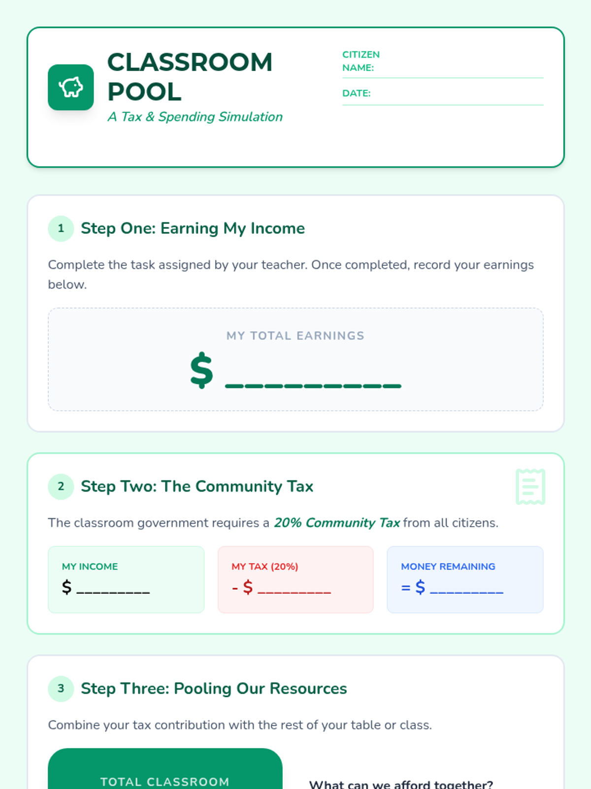 A project-based exploration of local government services, funding, and community planning. Students learn how taxes fund public works, safety, and infrastructure, culminating in a town budgeting simulation.
