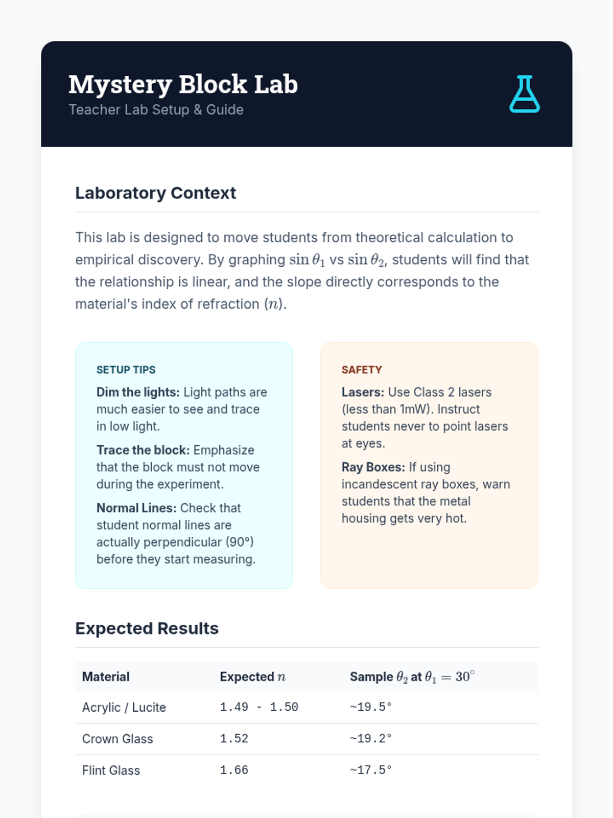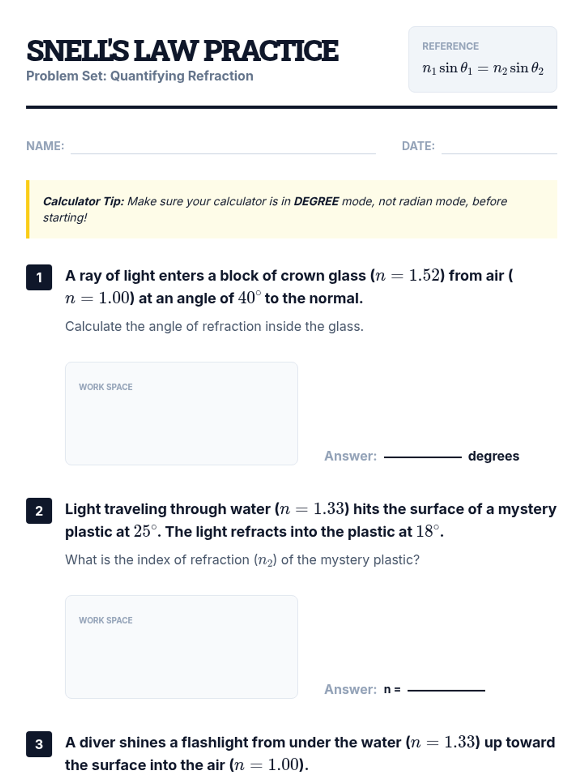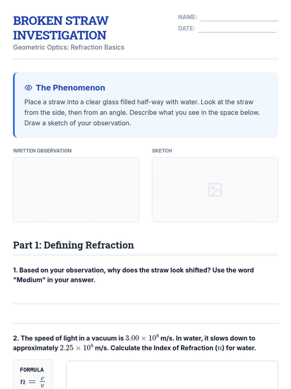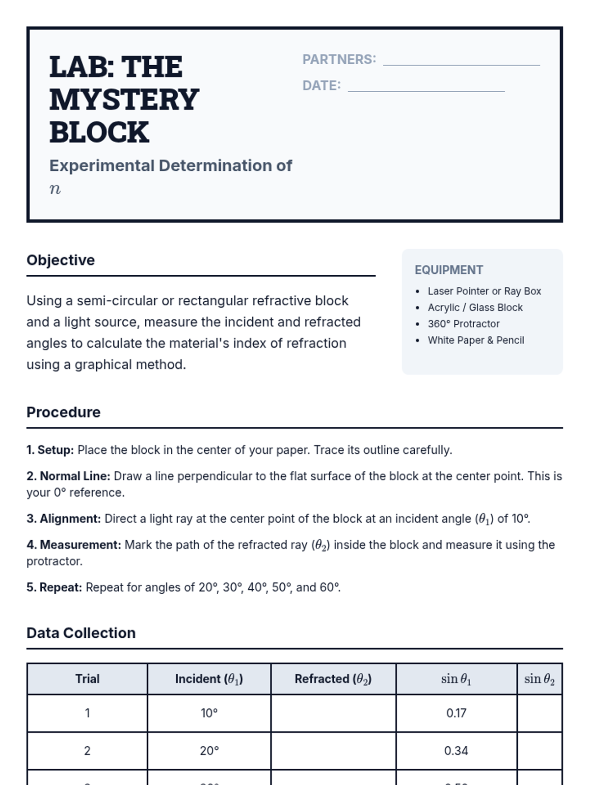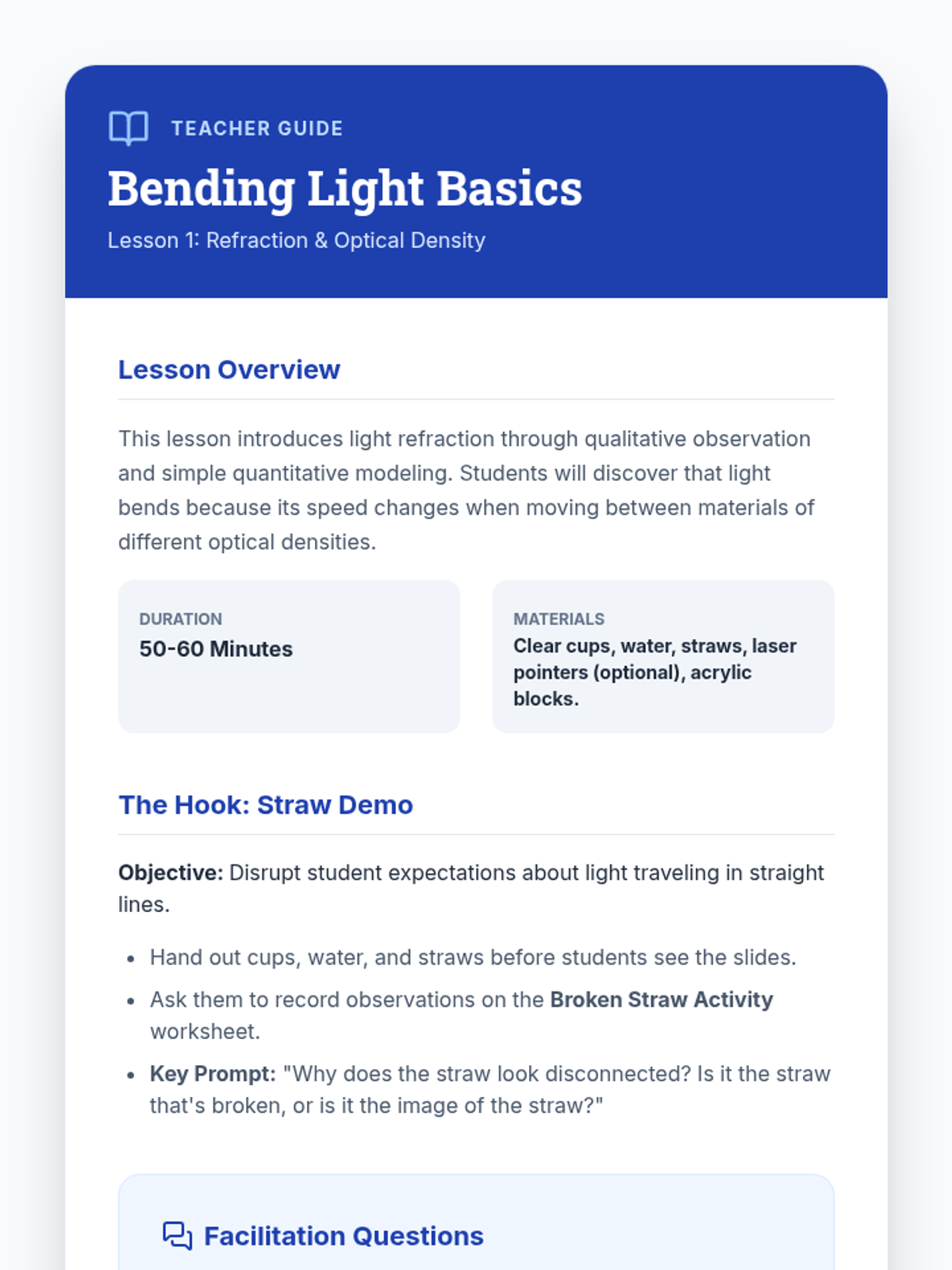 This inquiry-driven sequence explores the physics of refraction, Snell's Law, and Total Internal Reflection. Students progress from qualitative observations to complex mathematical modeling, culminating in an understanding of how light powers modern fiber optic communication.
