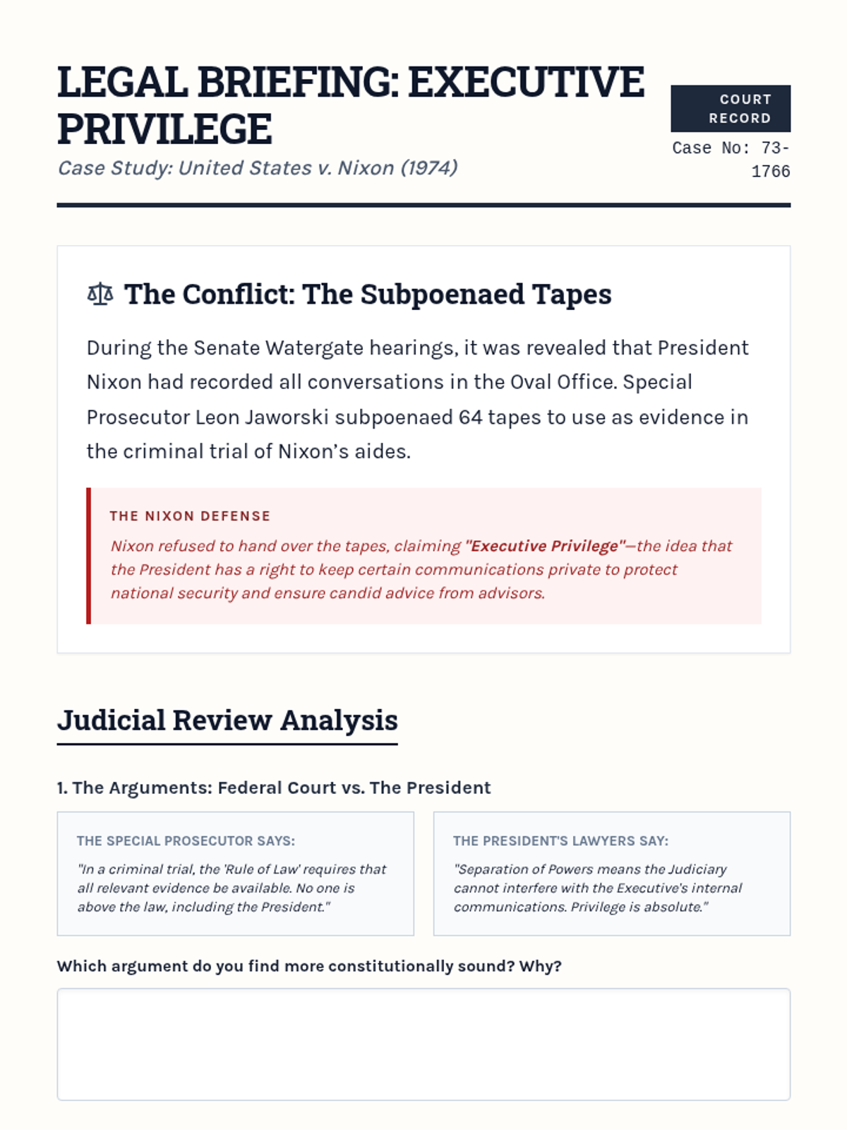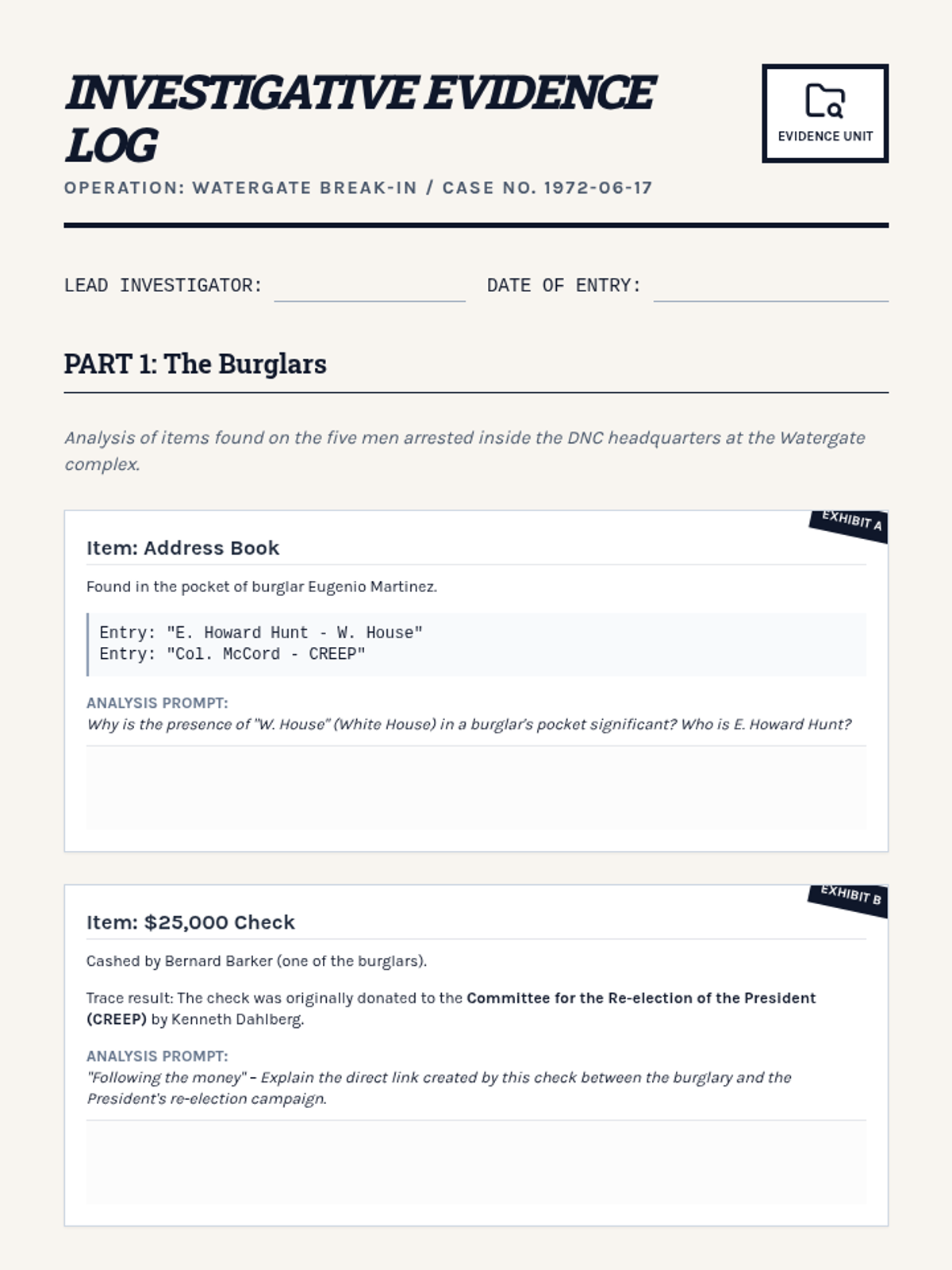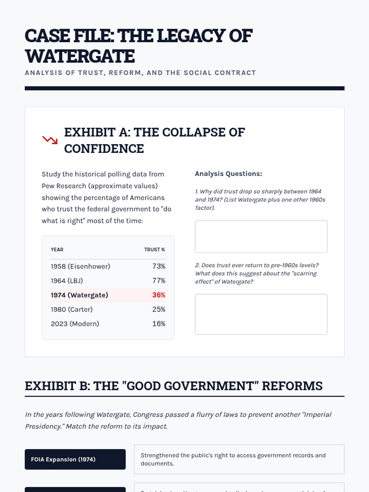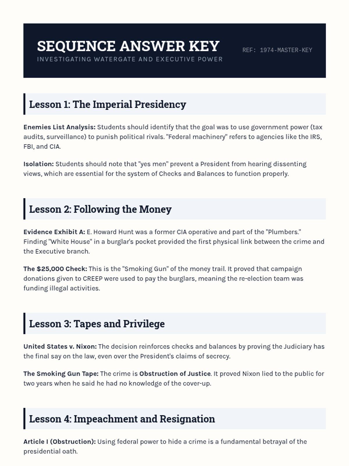 A comprehensive 5-lesson unit exploring the Watergate scandal, its constitutional implications, and its lasting impact on American trust in government. Students act as investigators to analyze the expansion of executive power and the role of checks and balances.