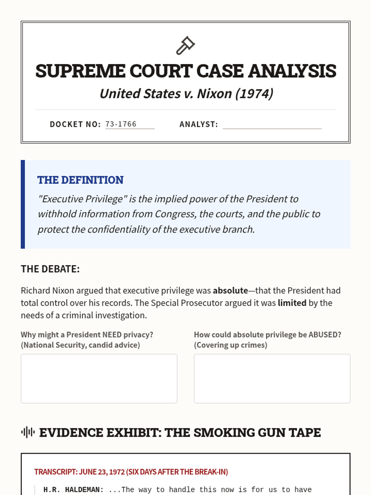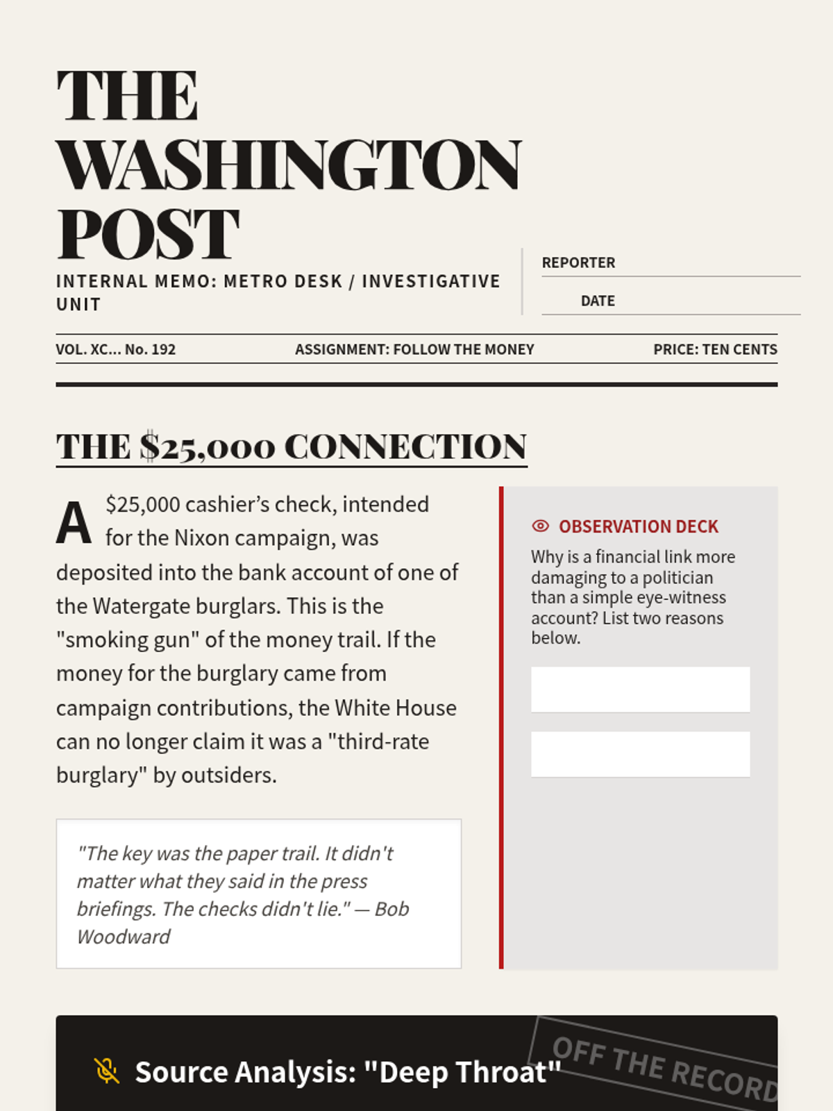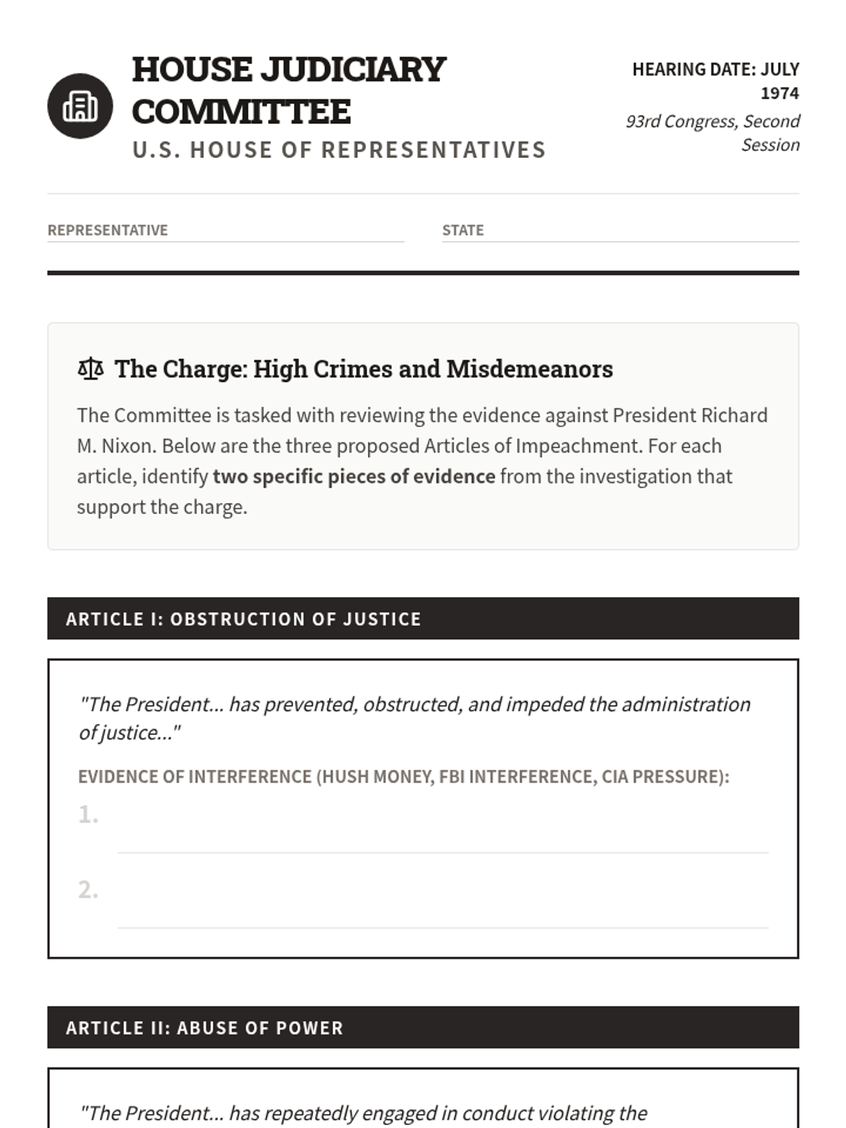 An investigative case study of the Watergate scandal, examining the roles of the press, the courts, and Congress in maintaining the system of checks and balances during a constitutional crisis. Students act as investigators and legal analysts to understand the erosion of executive power and public trust in the 1970s.