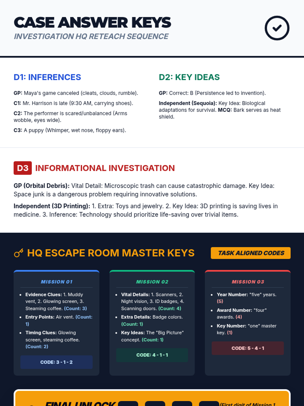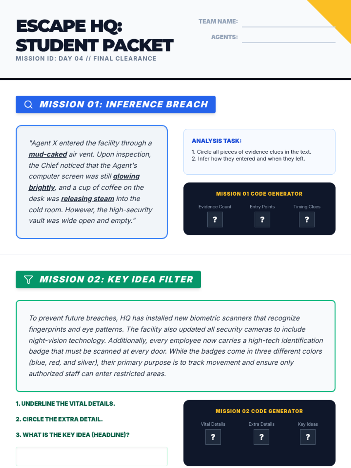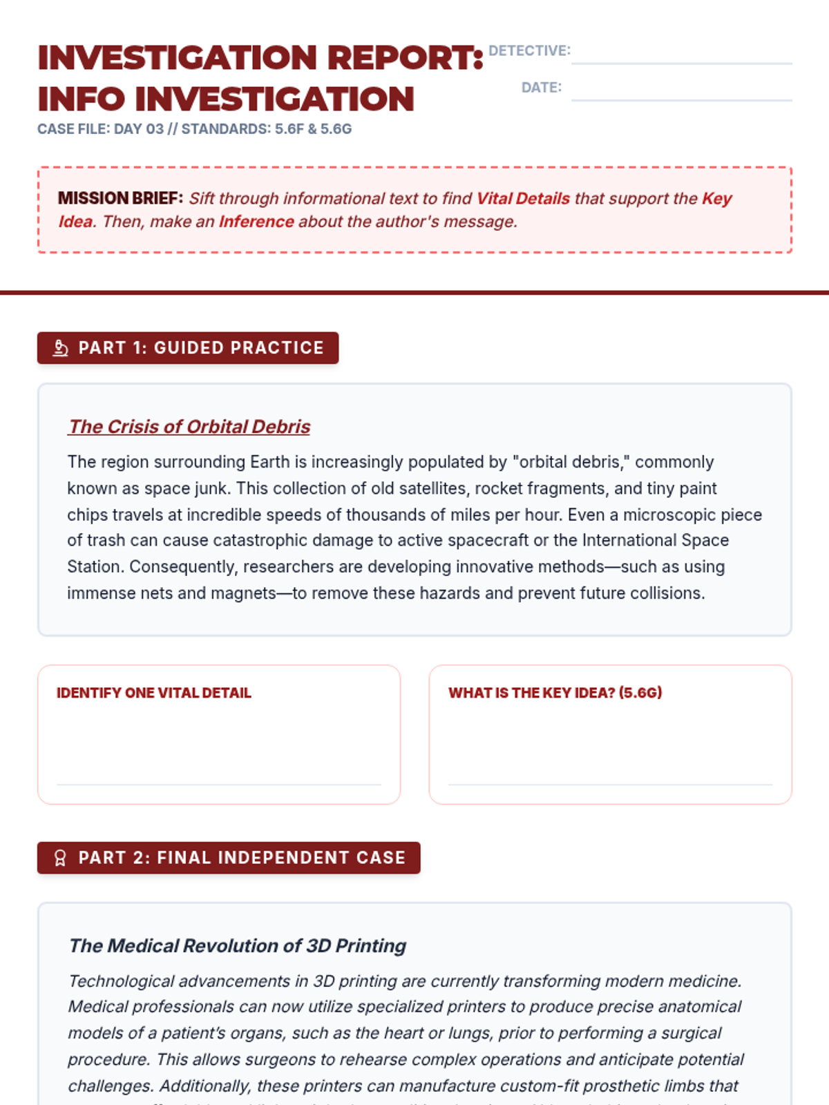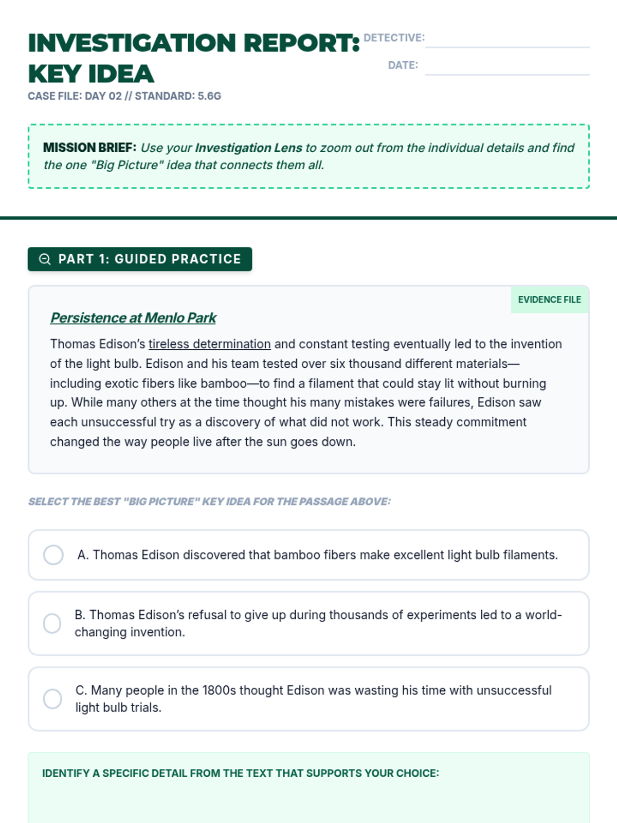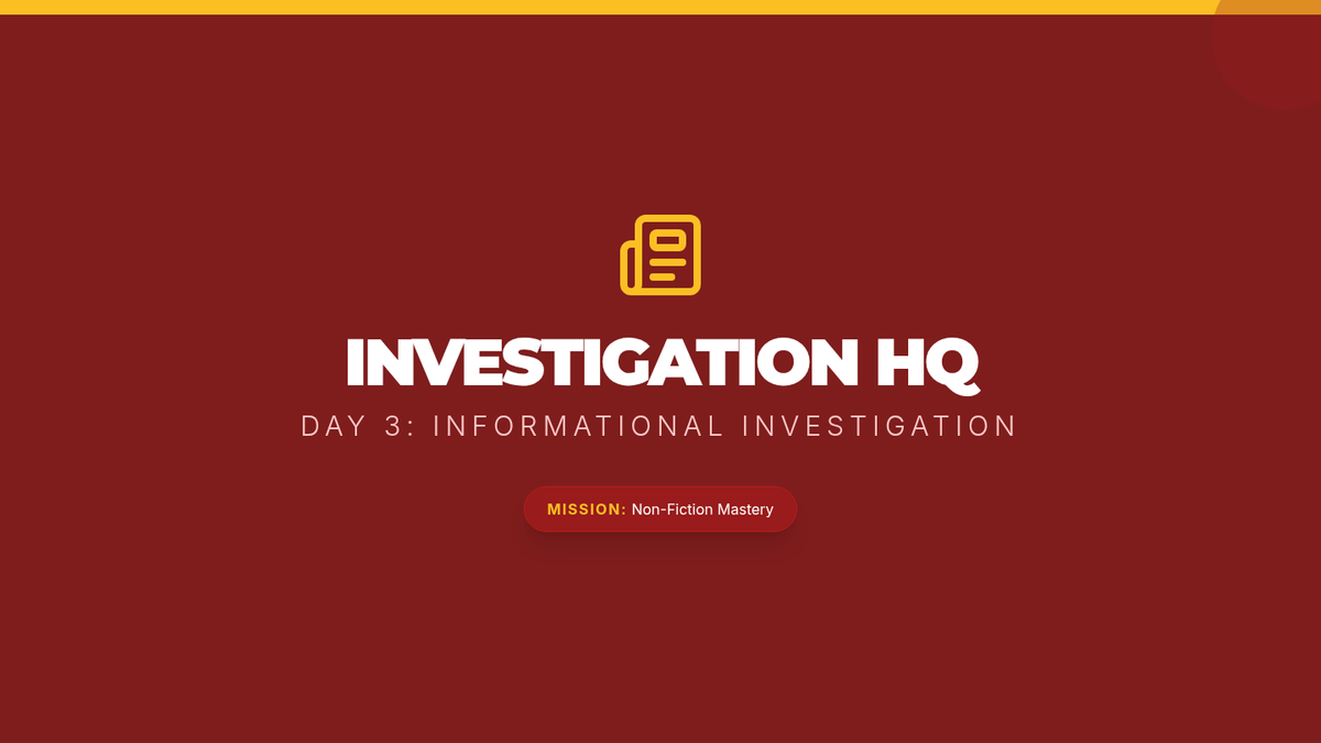 A 4-day intensive reteach sequence focusing on making inferences (5.6F) and evaluating key ideas (5.6G) through a detective-themed 'Investigation HQ' approach. Students will use evidence and critical details to solve textual mysteries and identify central themes.