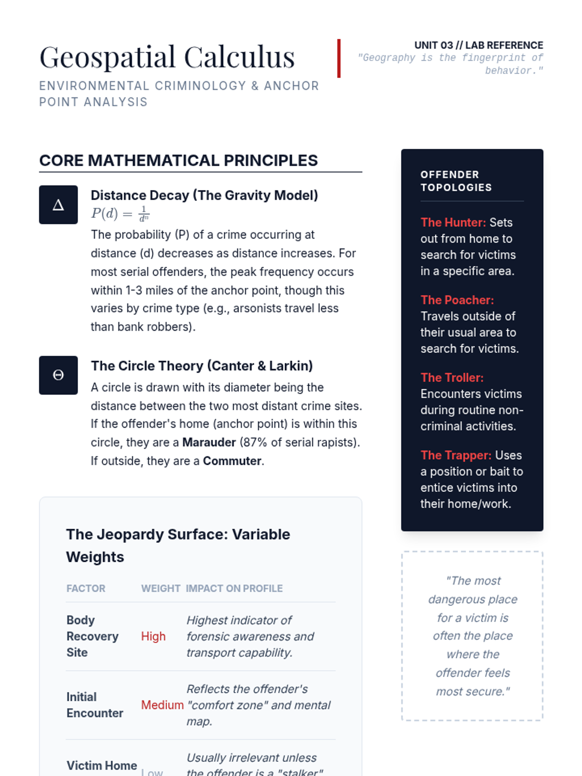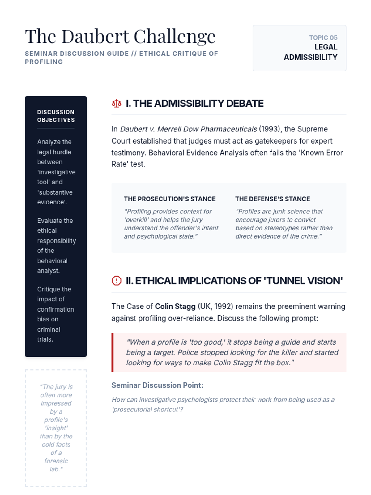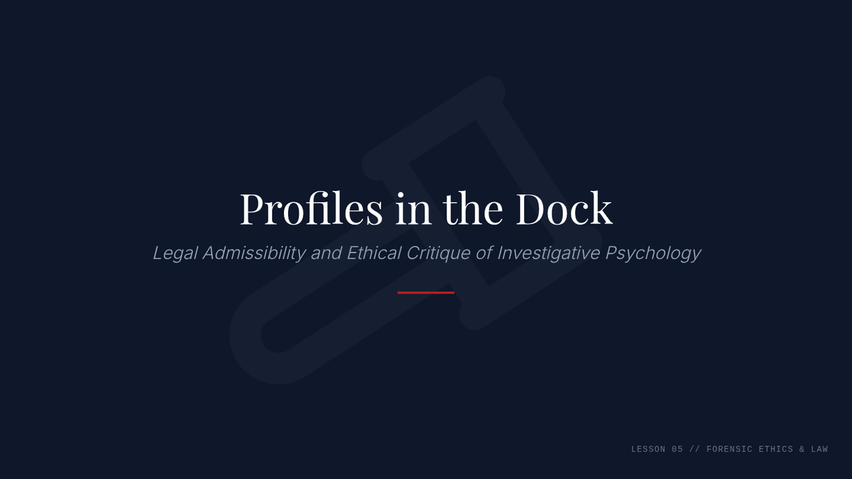 A graduate-level exploration of forensic psychology, focusing on the transition from traditional FBI profiling to empirical investigative psychology and behavioral evidence analysis. Students analyze crime scene behavior, geographical patterns, and the legal admissibility of profiling techniques.