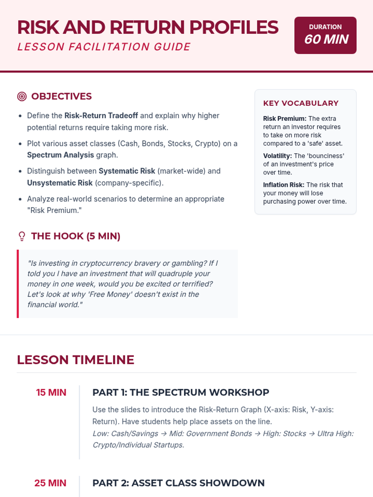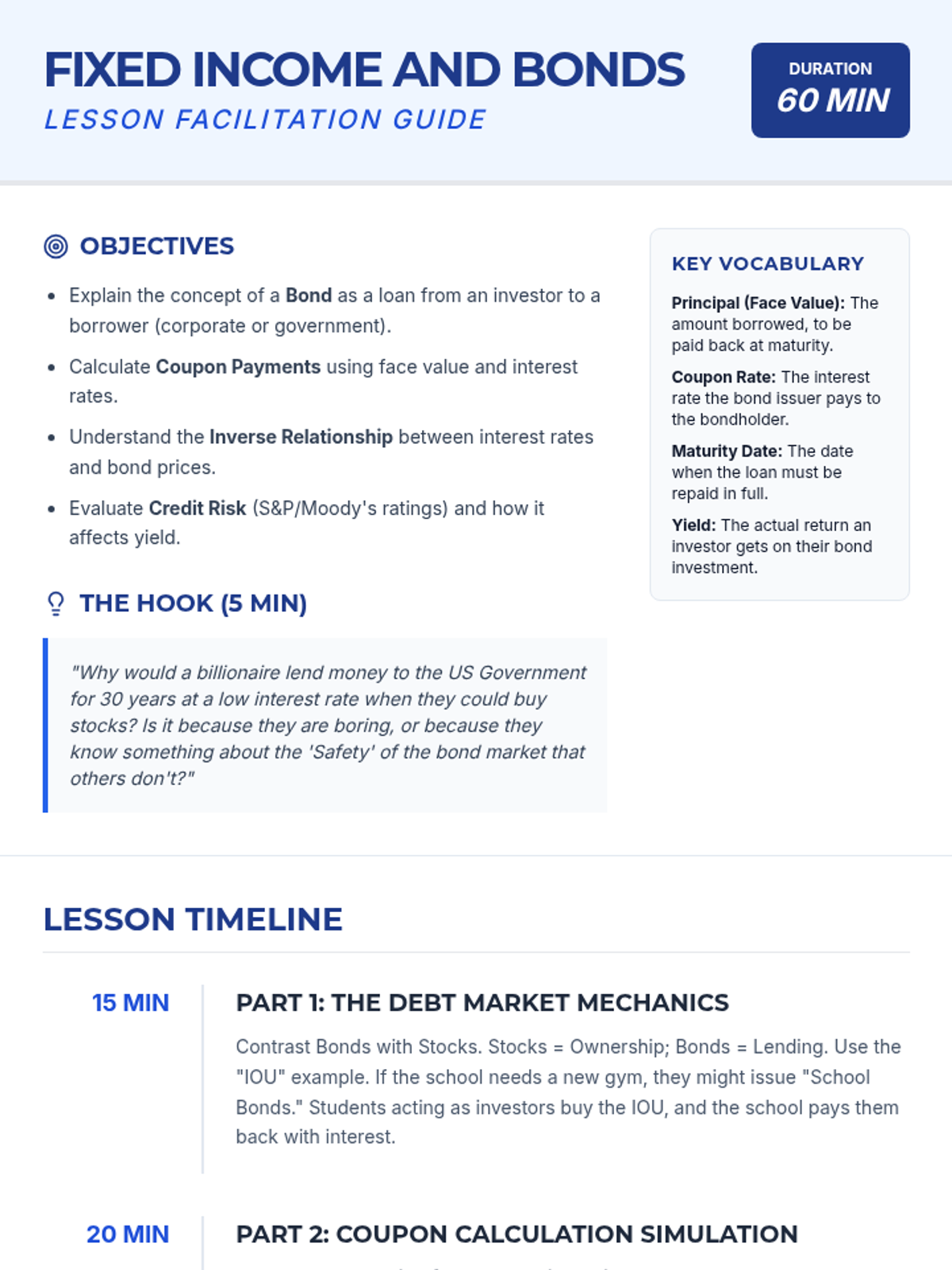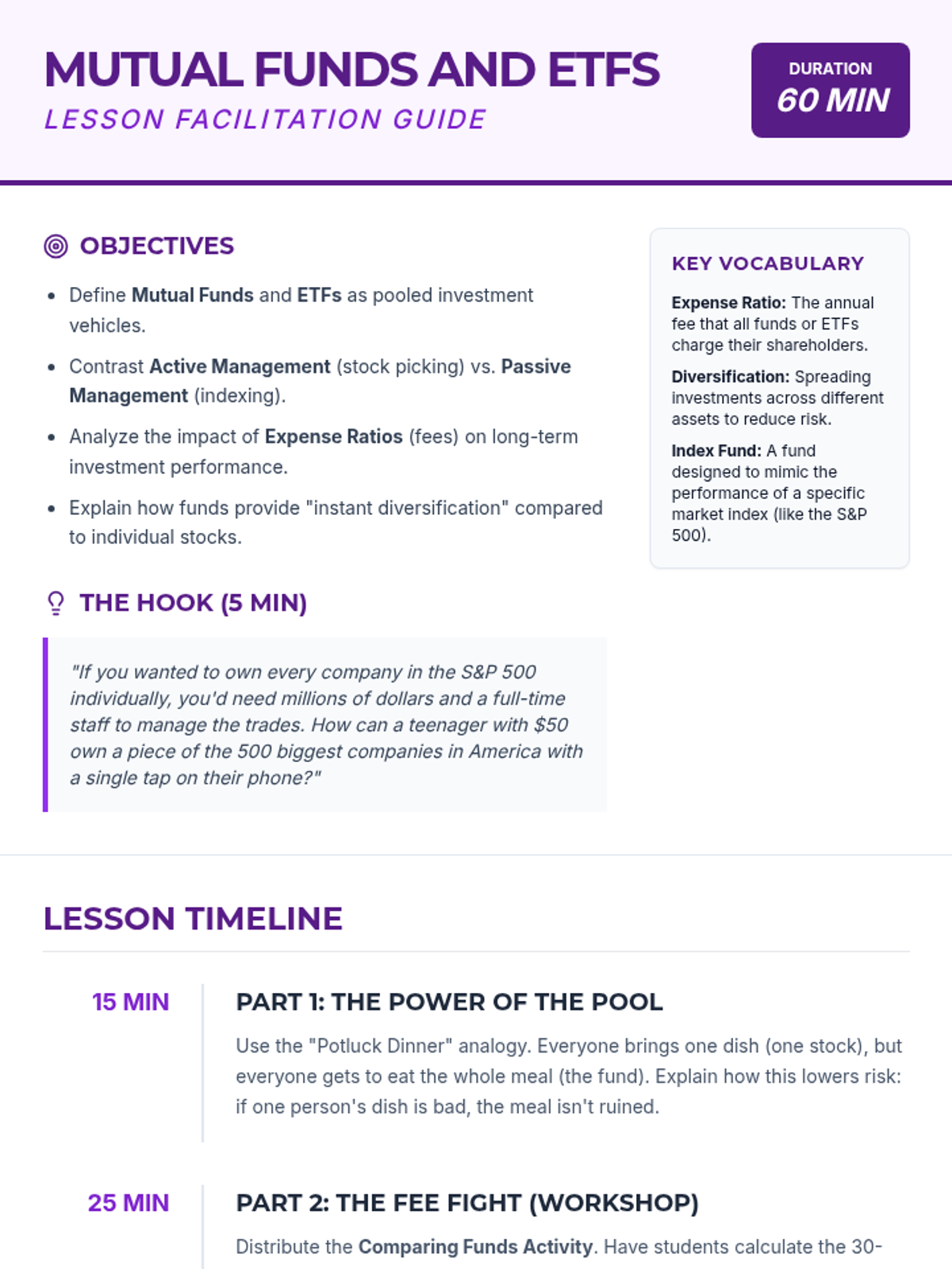 A comprehensive 10th-grade unit on the mechanics of investing, focusing on stocks, bonds, and mutual funds. Students move from basic ownership concepts to complex risk-return analysis through case studies and simulations.