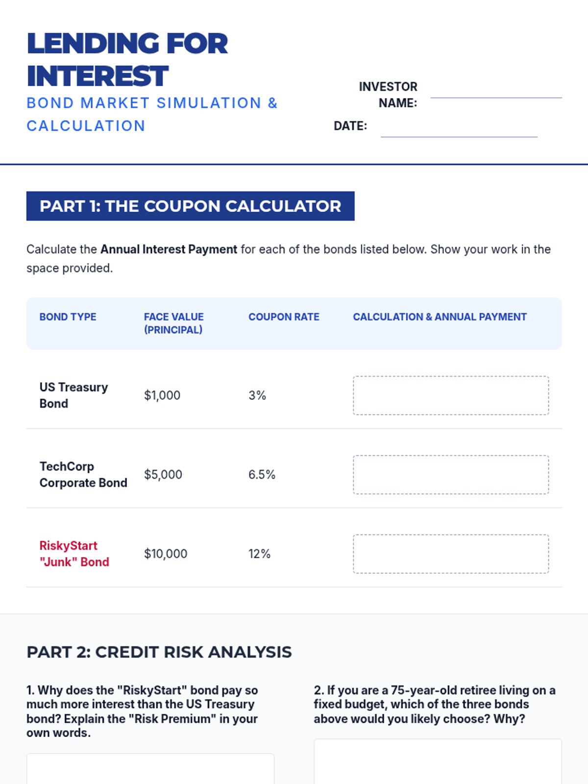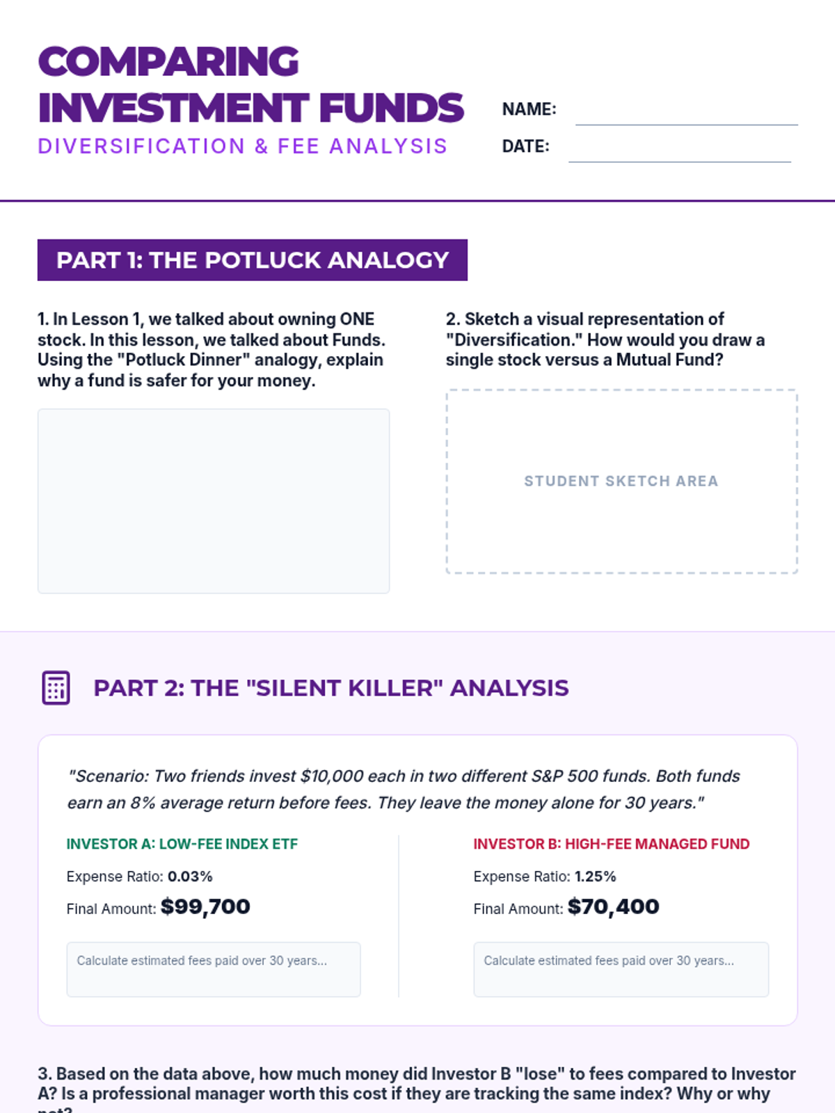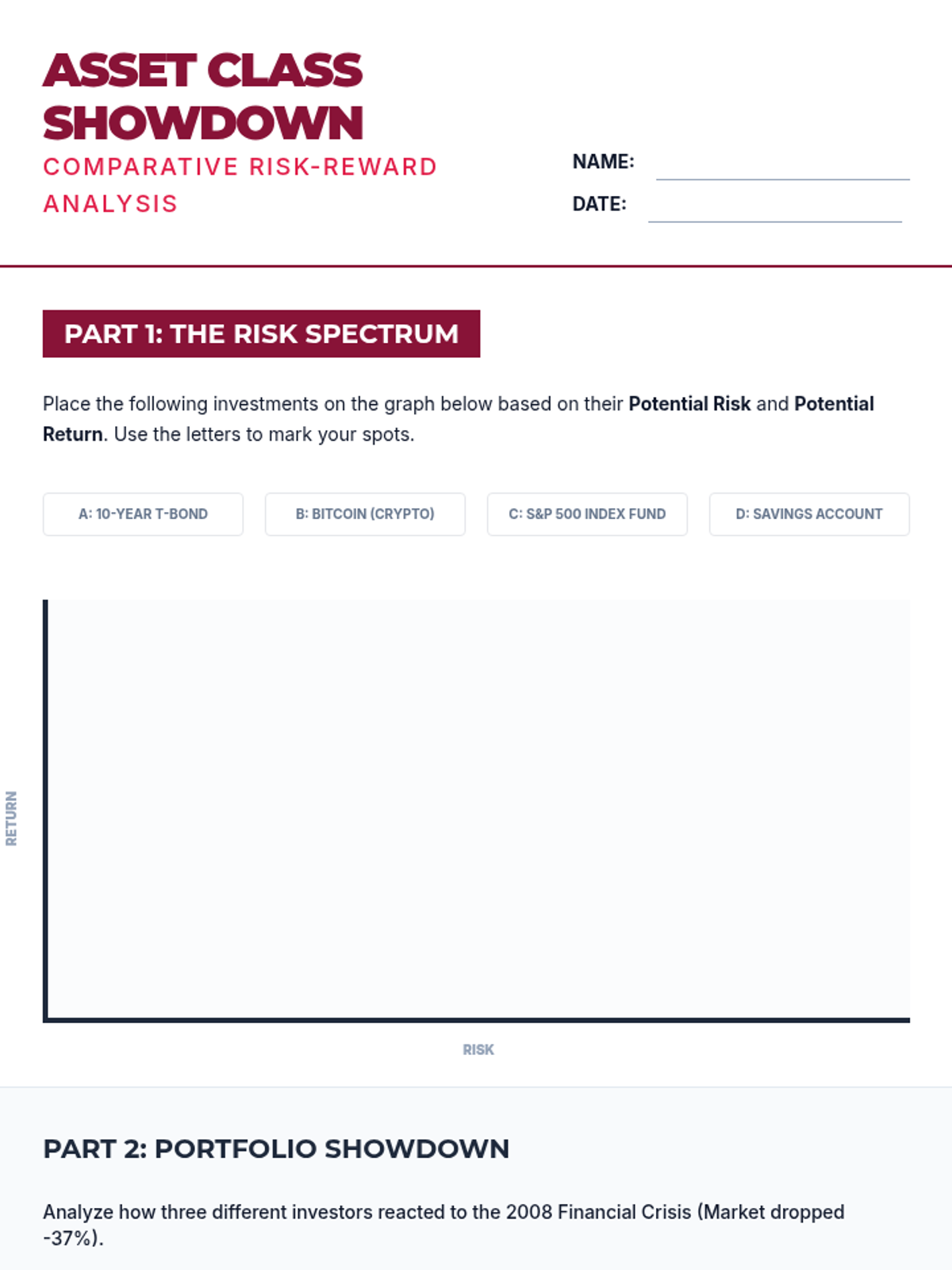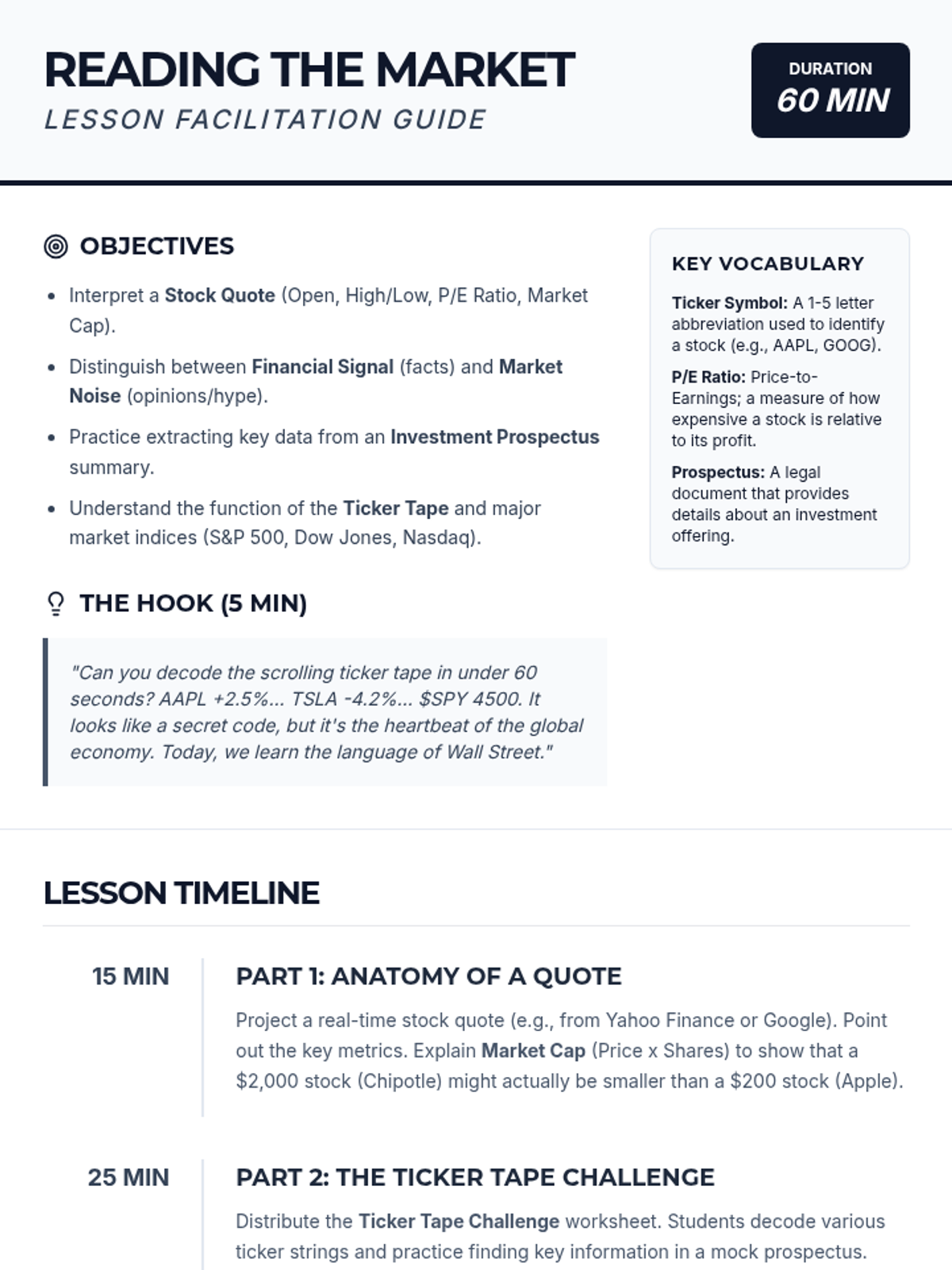 A comprehensive 10th-grade unit on the mechanics of investing, focusing on stocks, bonds, and mutual funds. Students move from basic ownership concepts to complex risk-return analysis through case studies and simulations.