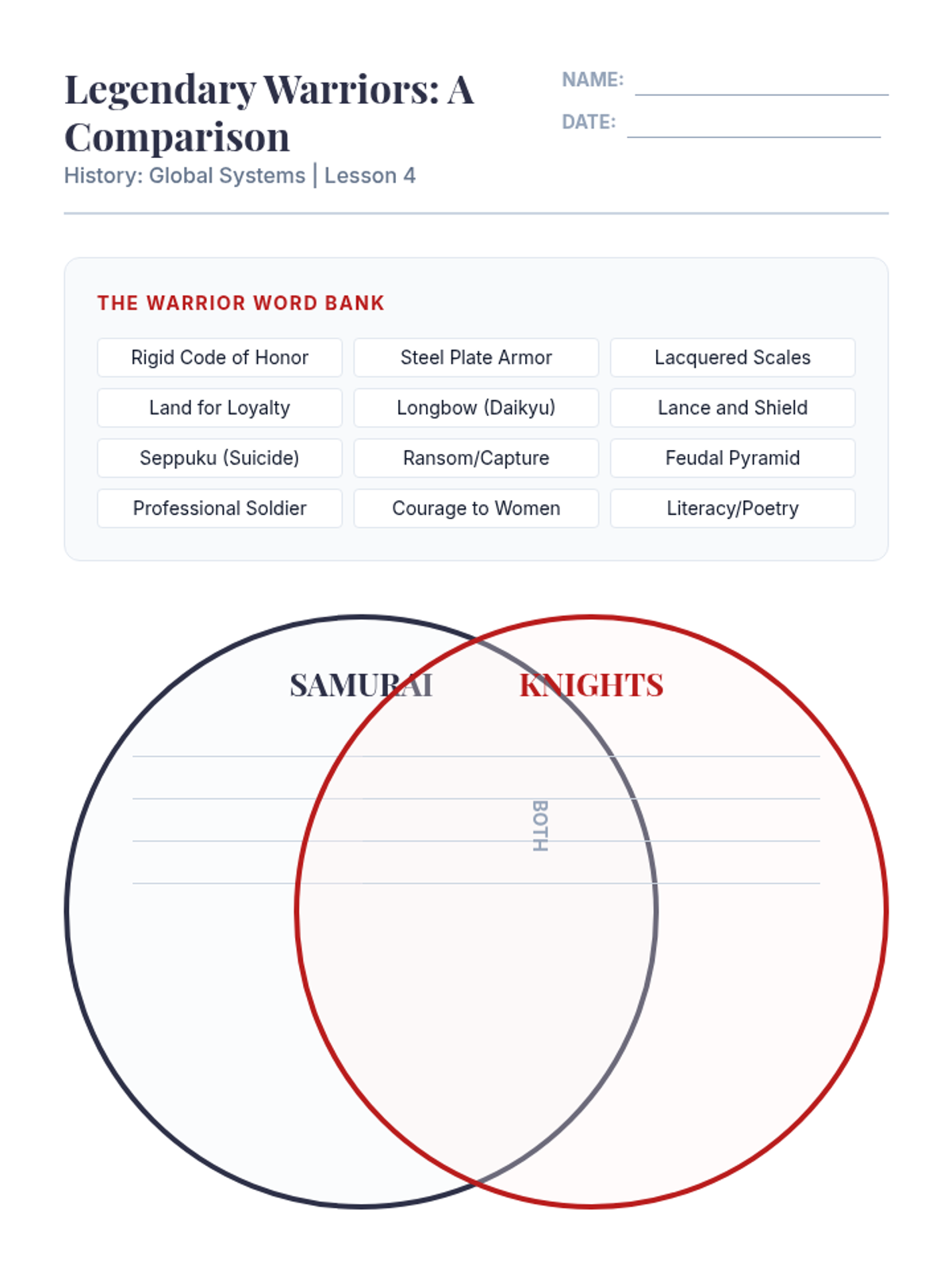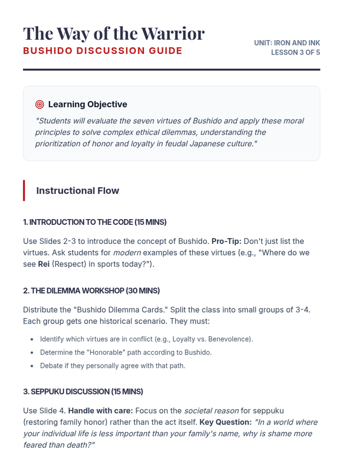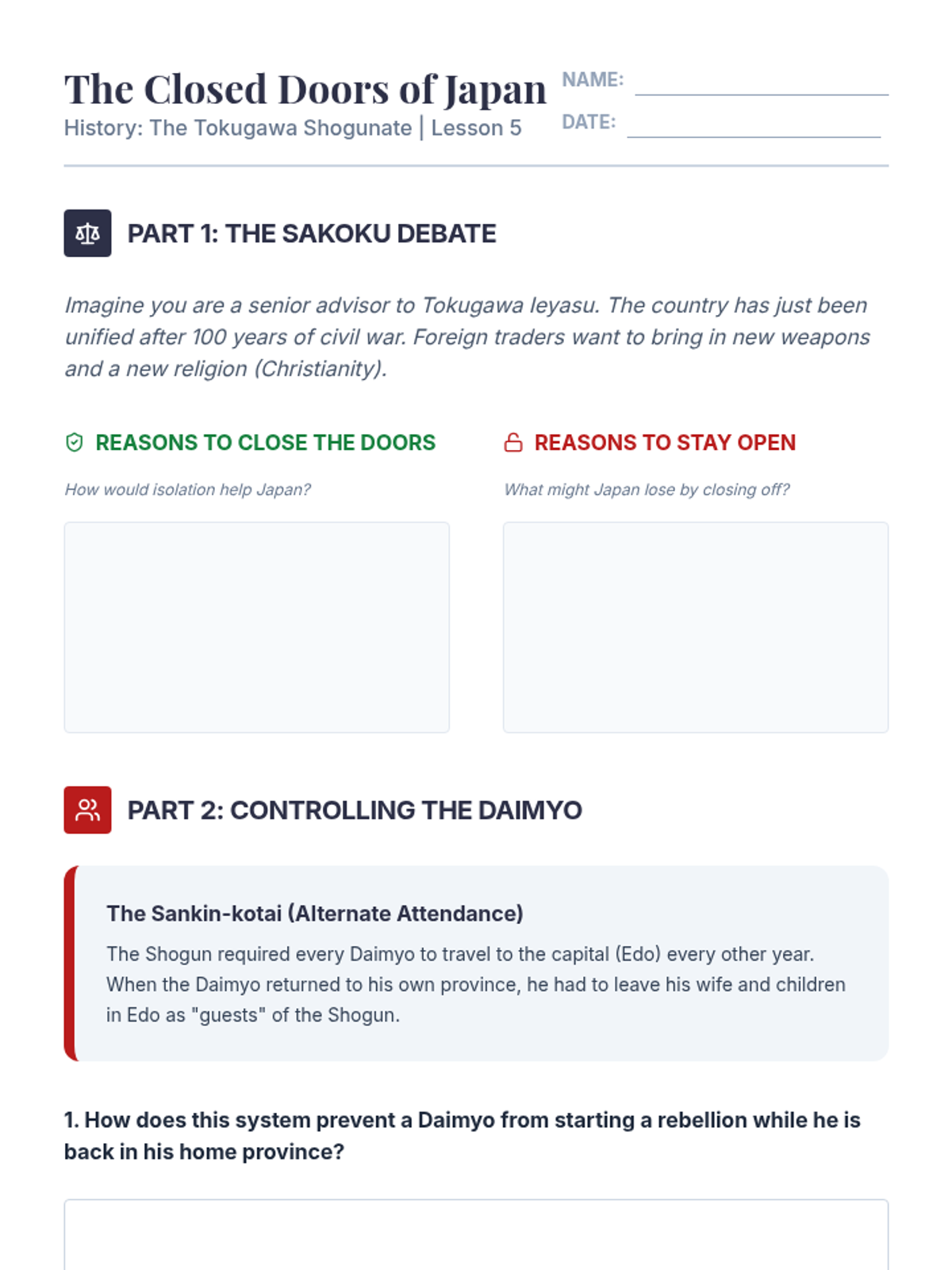 A 5-lesson unit for 7th-grade Social Studies exploring the transition from Heian culture to the Shogunate, the rigid feudal hierarchy, the Bushido code, and Japan's eventual isolation under the Tokugawa. Students use simulations, primary source analysis, and comparative studies to understand the impact of rigid social structures.