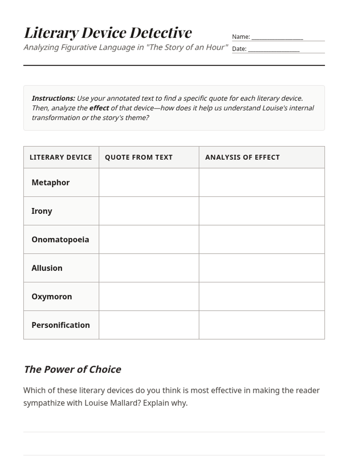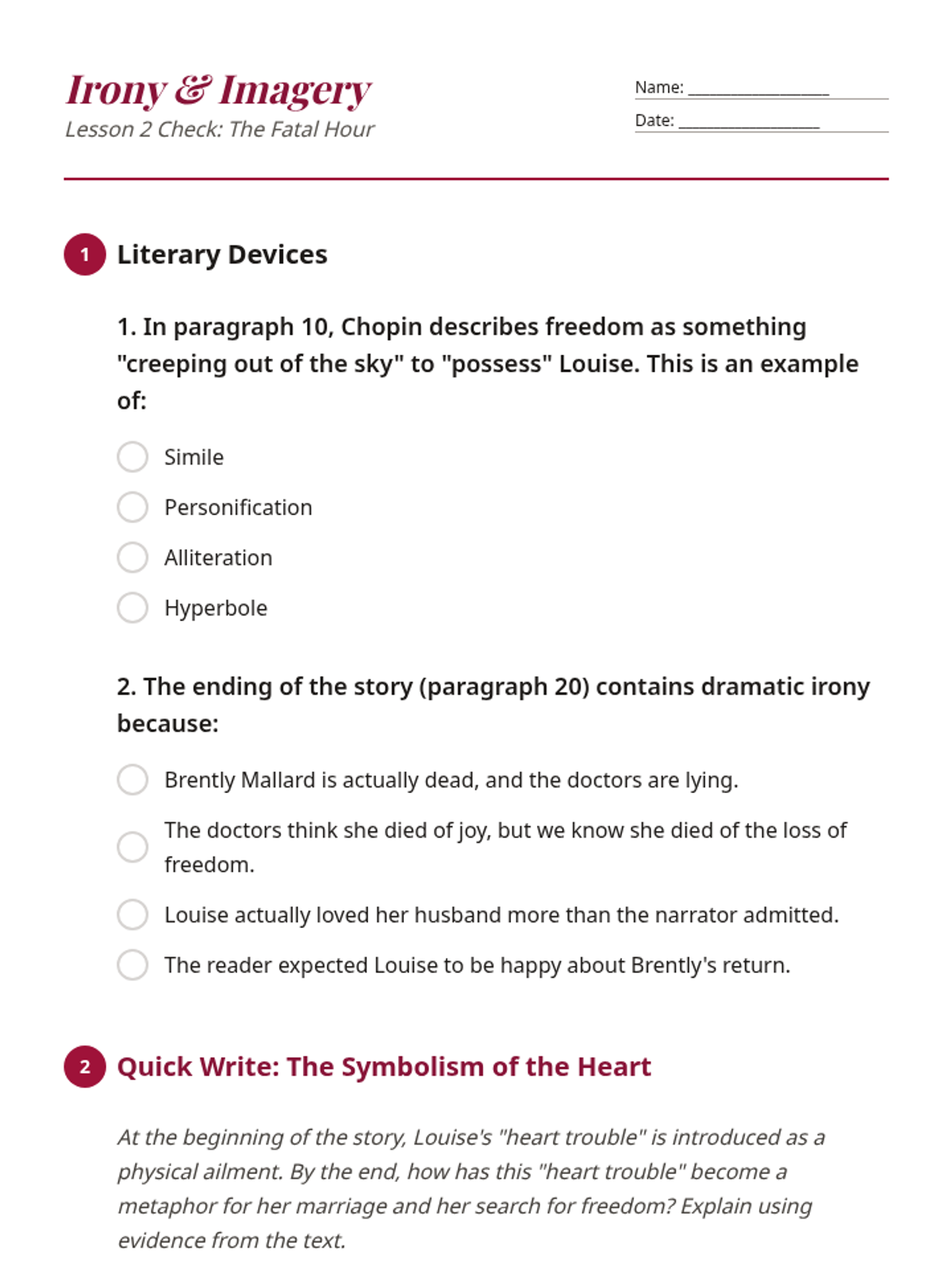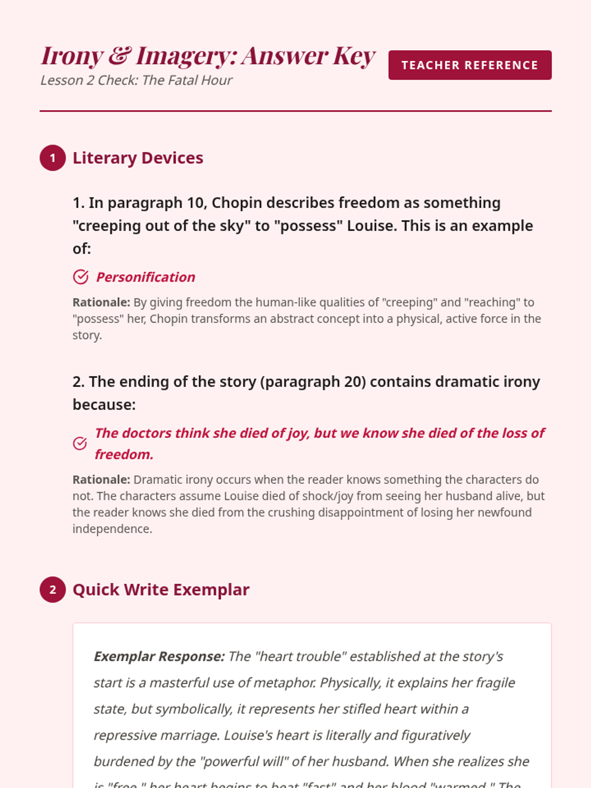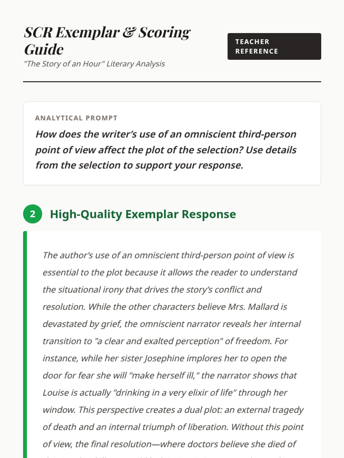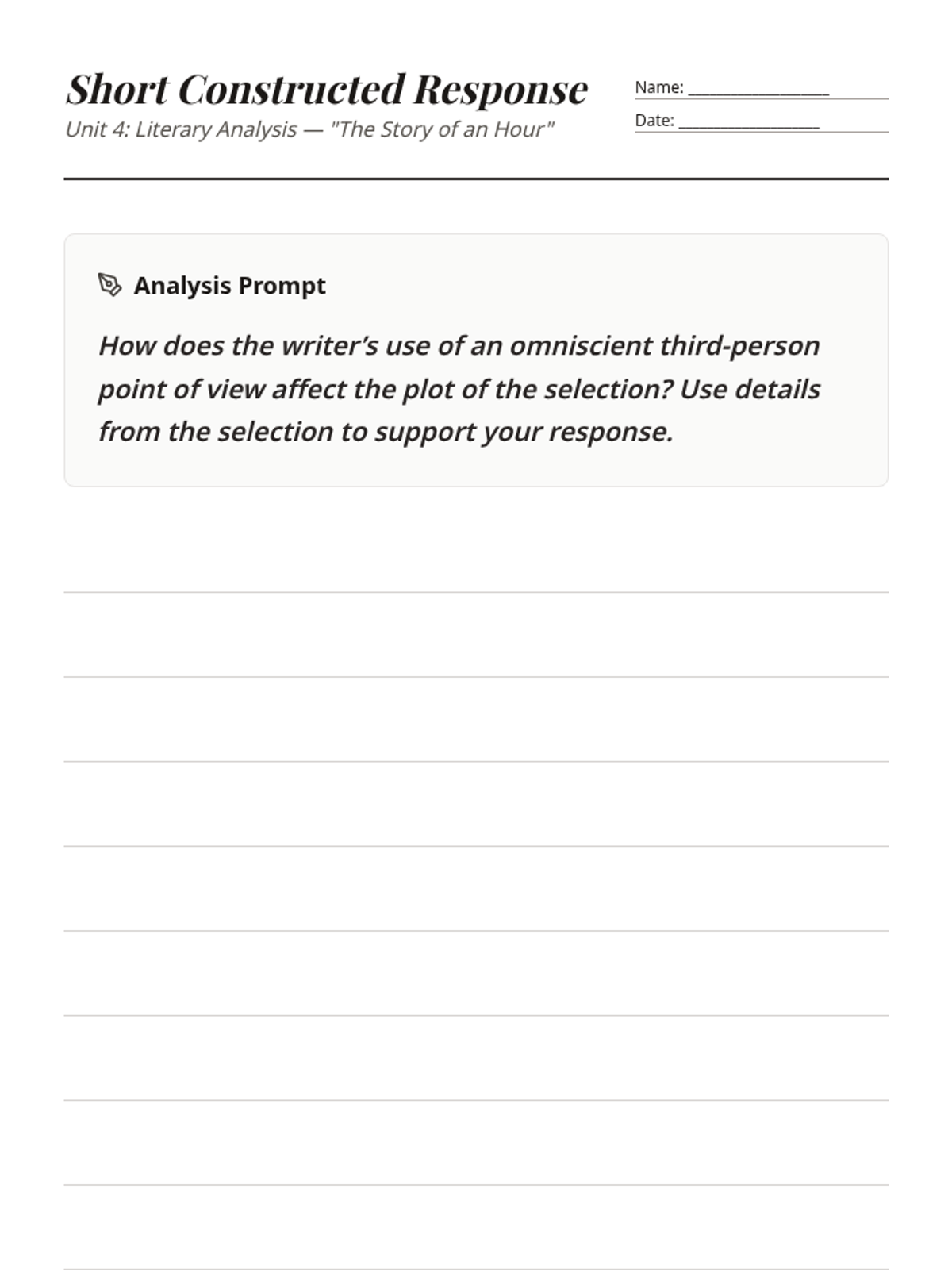 A three-lesson exploration of Kate Chopin's 'The Story of an Hour', focusing on the nuances of 3rd person omniscient point of view, sensory imagery, figurative language, and the ironic twist of the plot. Students analyze how narrative perspective shapes their understanding of Mrs. Mallard's internal transformation.