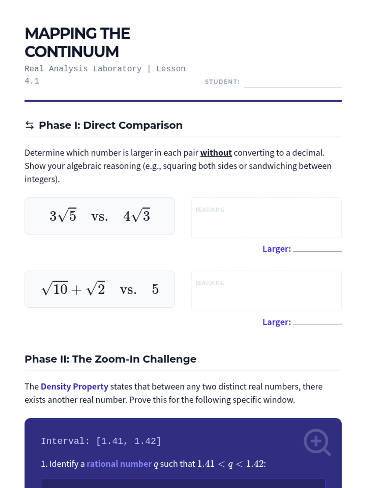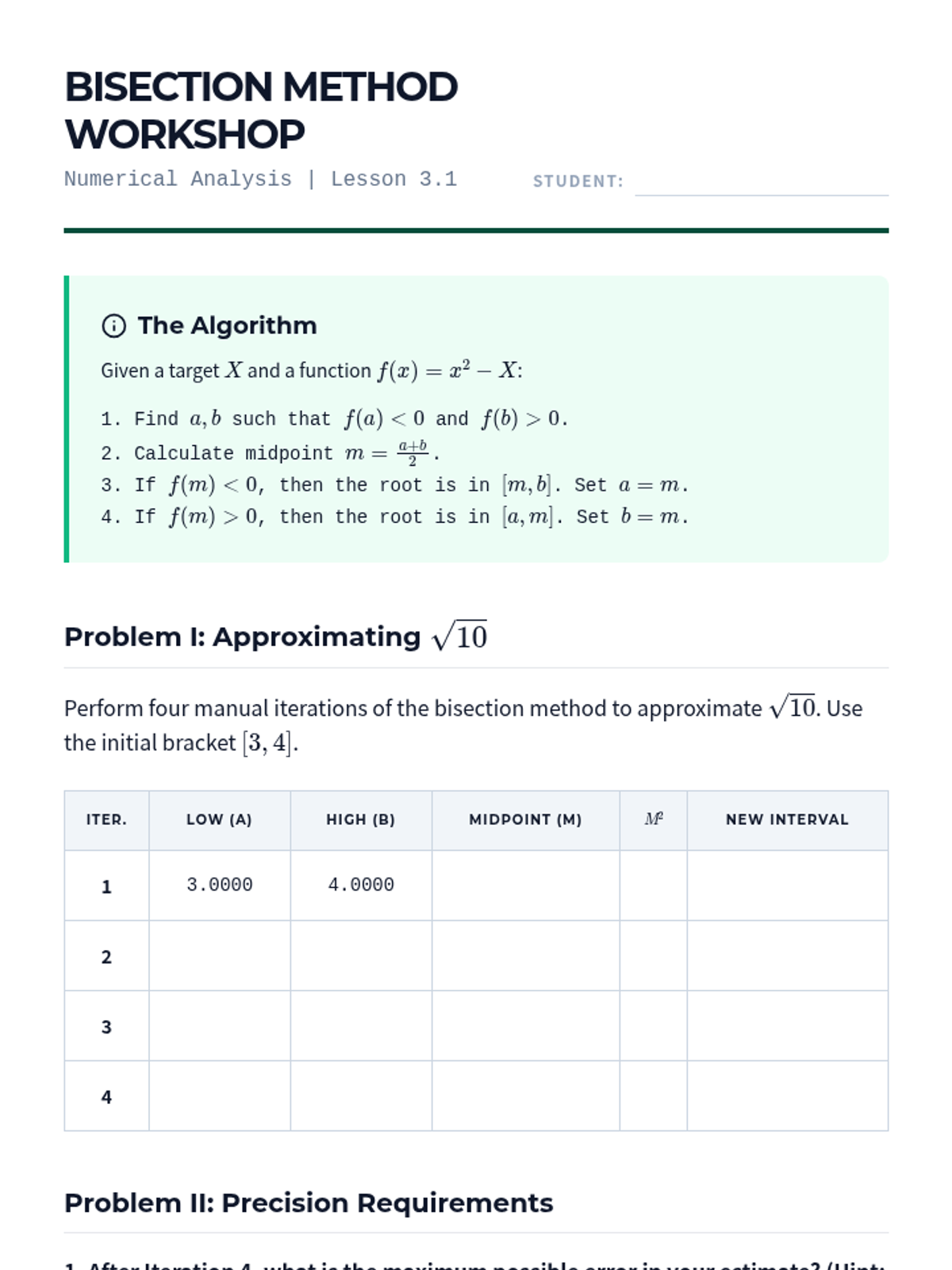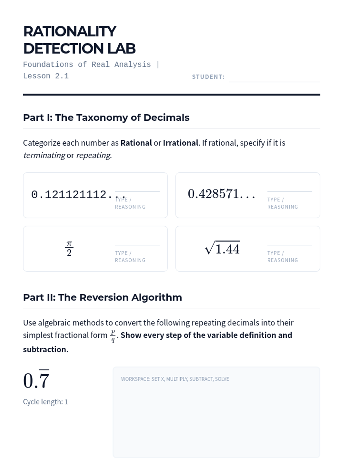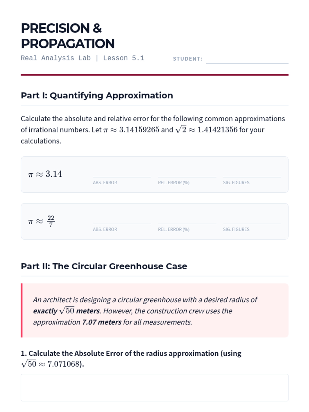 A rigorous undergraduate-level sequence exploring the existence of irrational numbers, algebraic proofs of incommensurability, and iterative algorithms for numerical approximation and error analysis.
