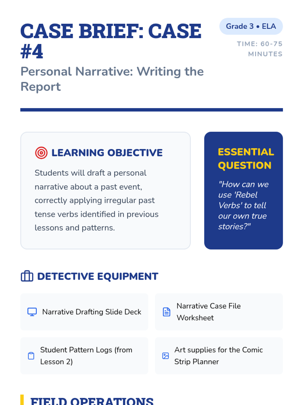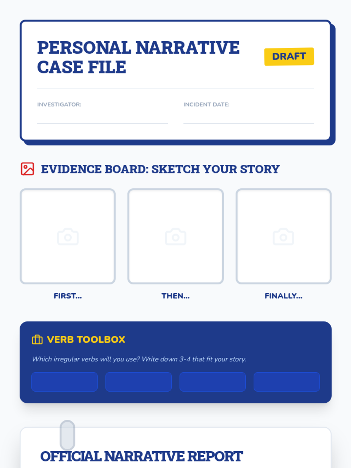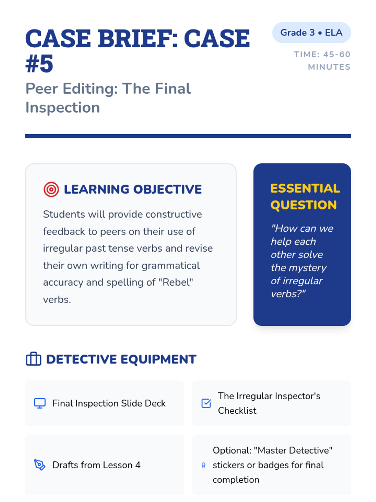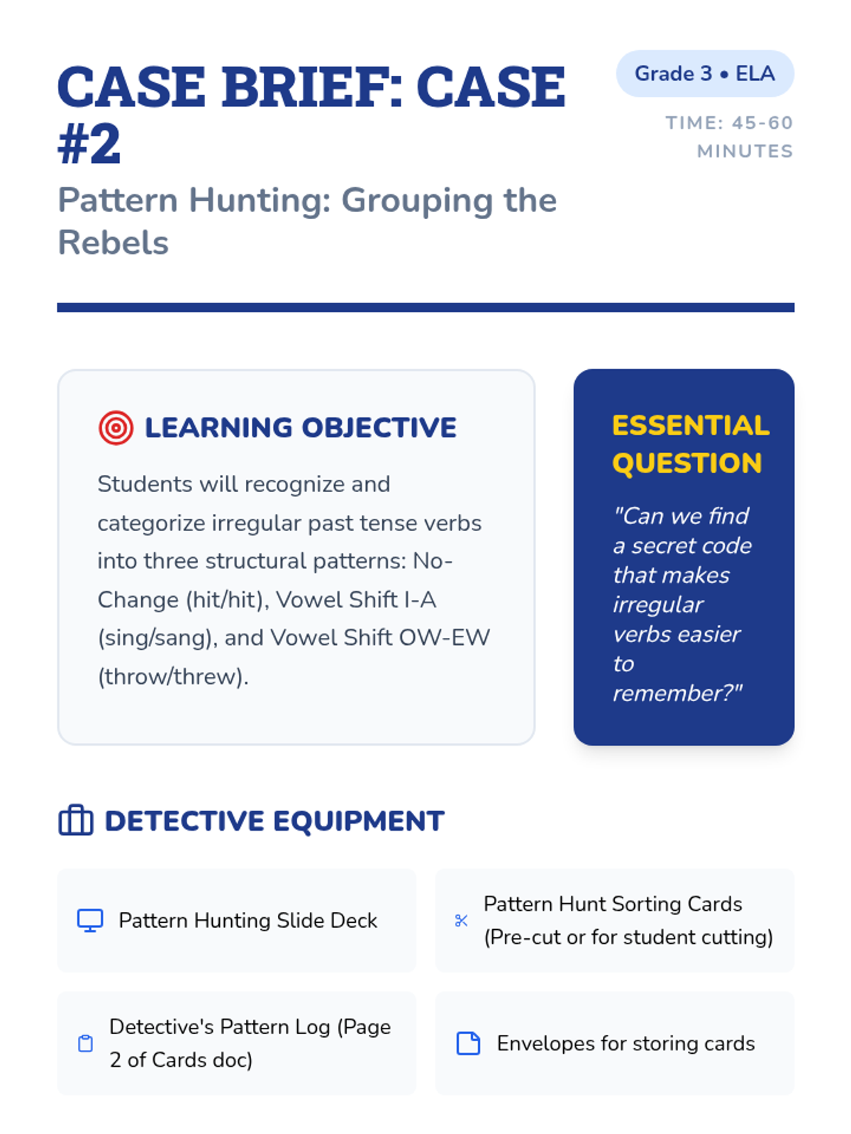 This sequence guides 3rd-grade students through the world of irregular past tense verbs using a 'Grammar Detective' theme. Students identify, categorize, and apply irregular verbs through investigative activities, culminating in a personal narrative project.