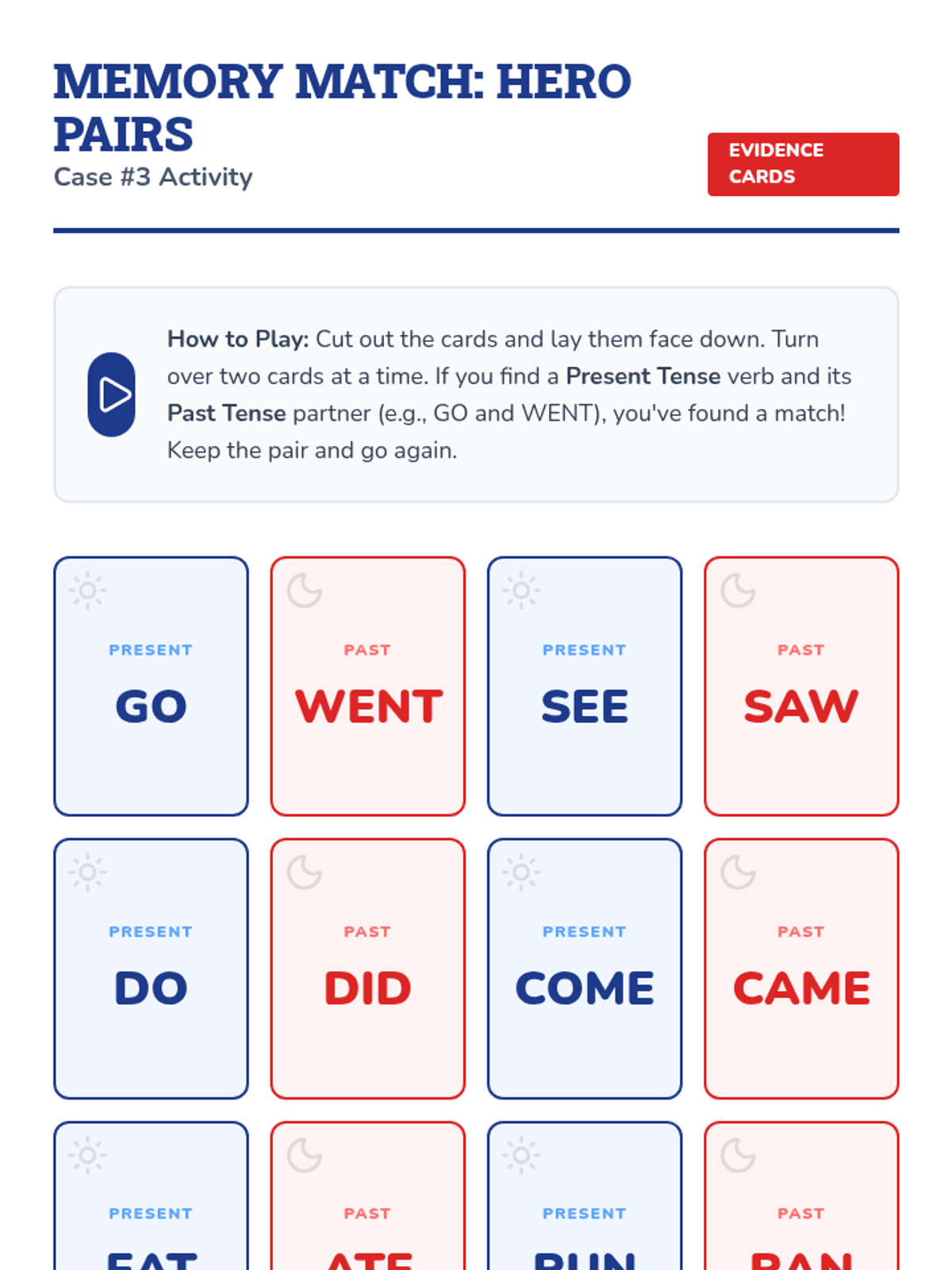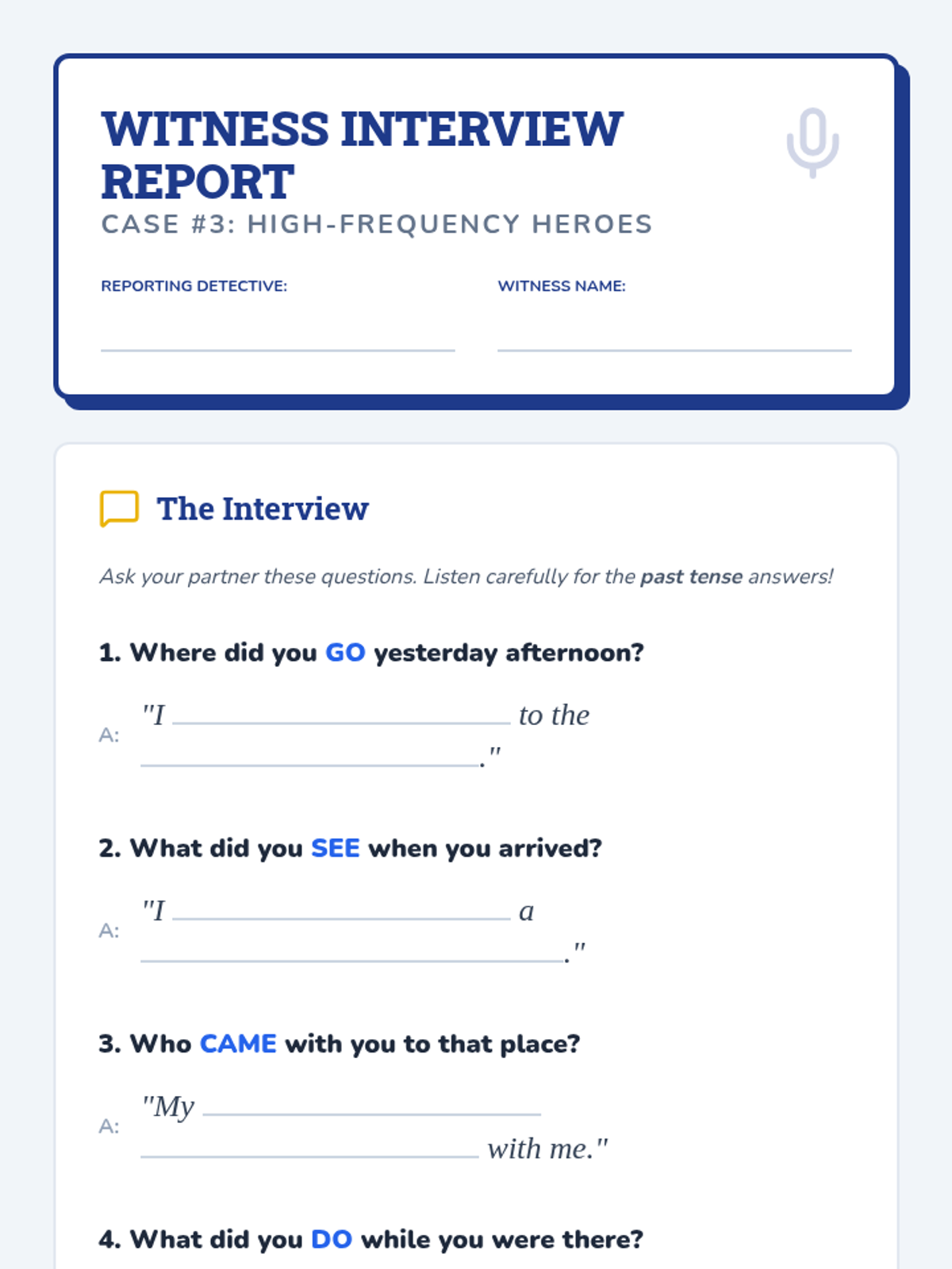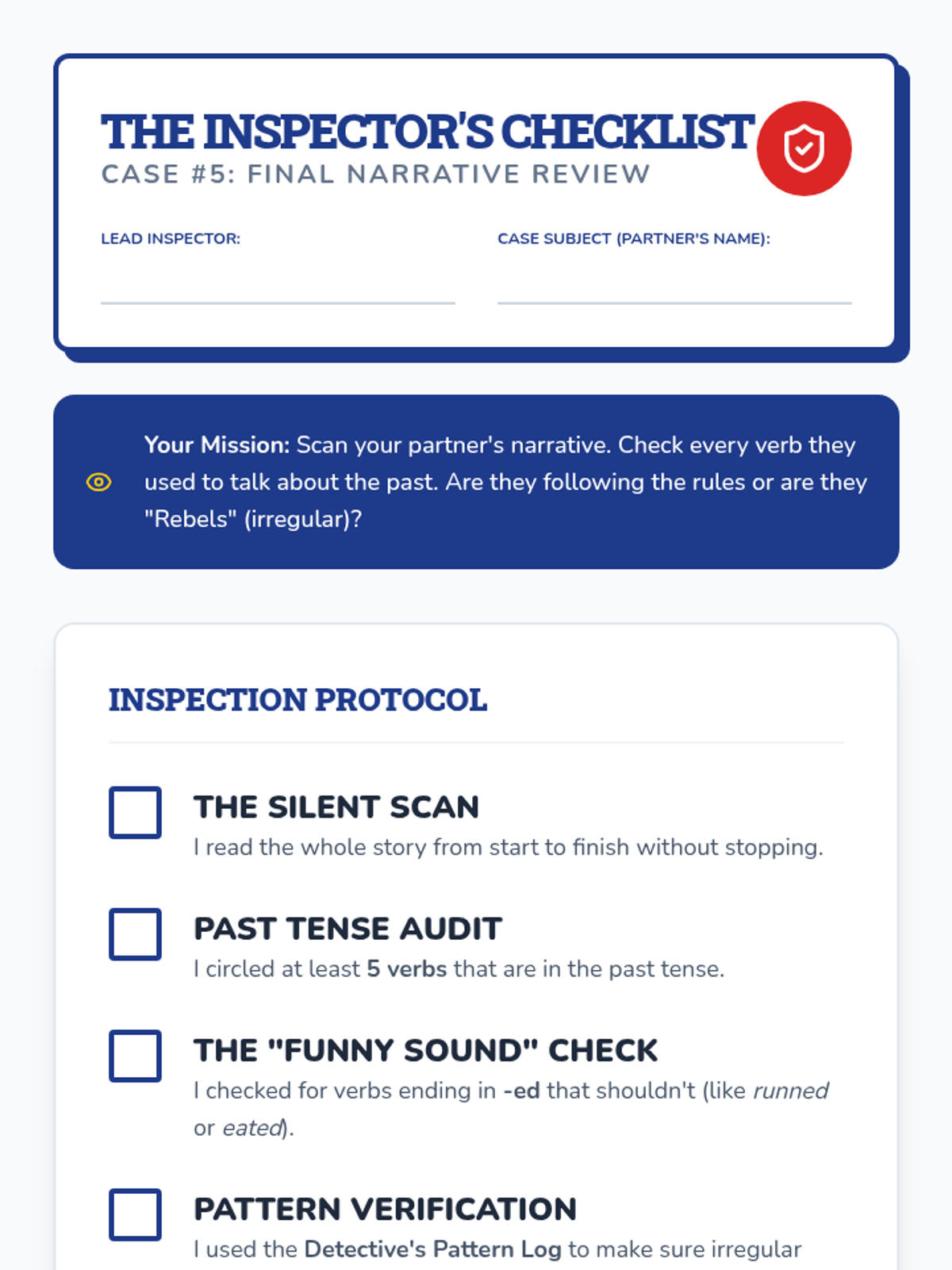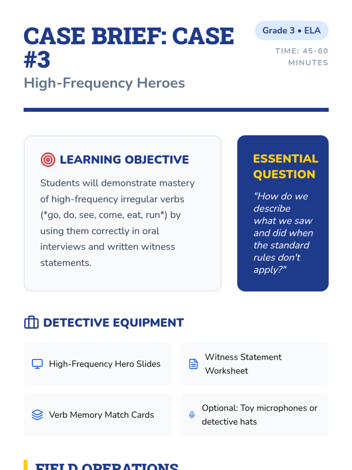 This sequence guides 3rd-grade students through the world of irregular past tense verbs using a 'Grammar Detective' theme. Students identify, categorize, and apply irregular verbs through investigative activities, culminating in a personal narrative project.