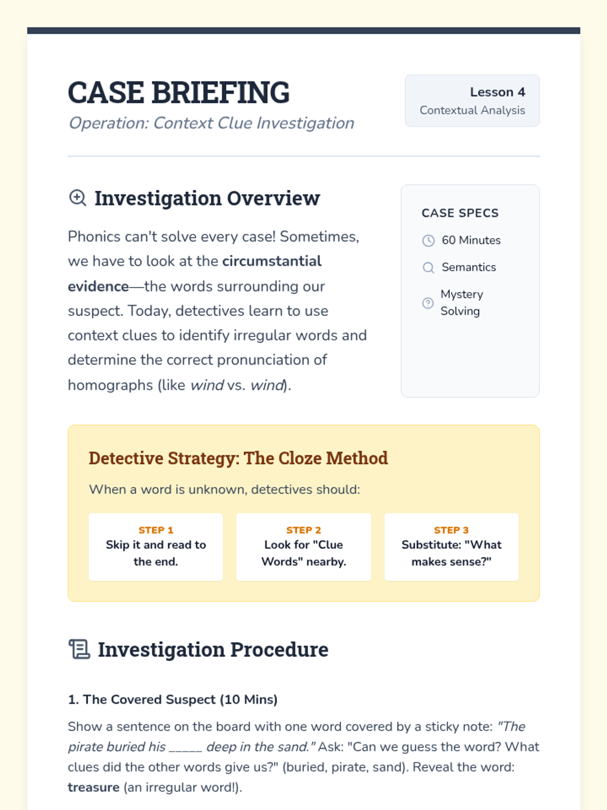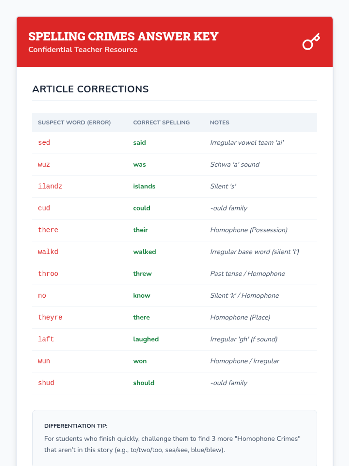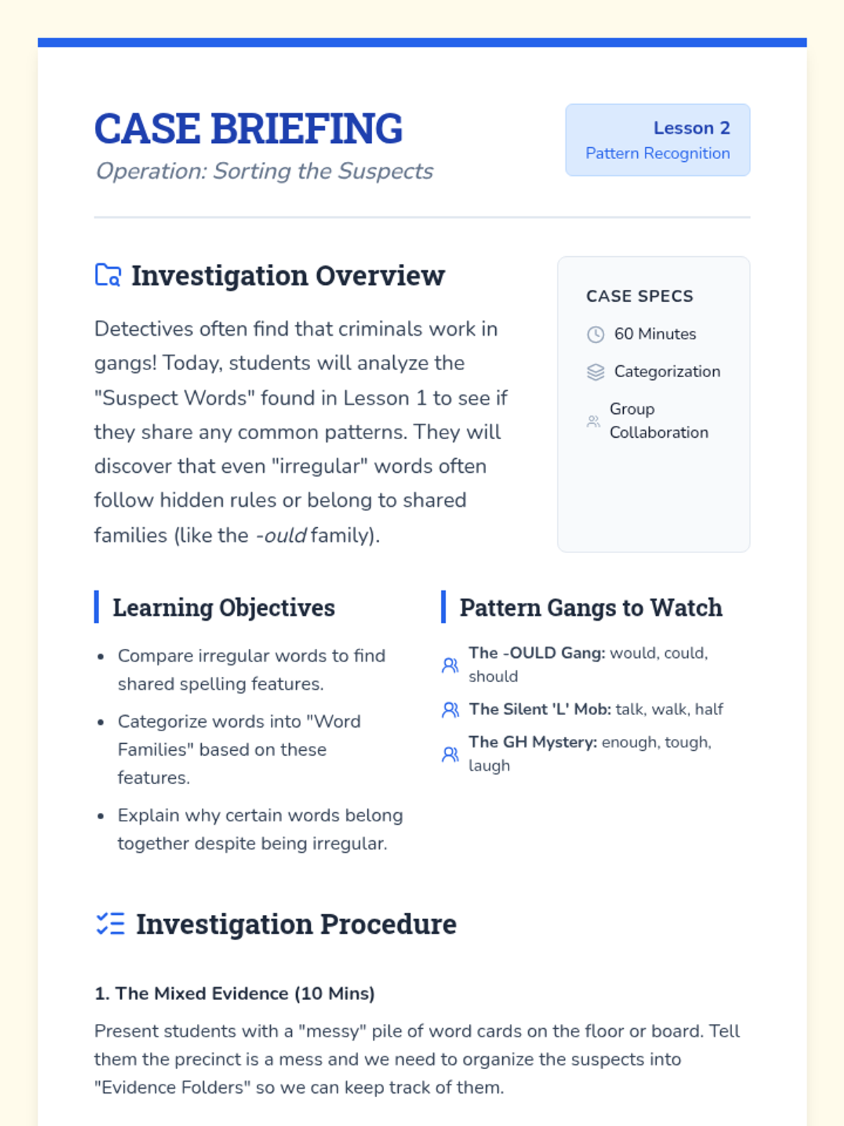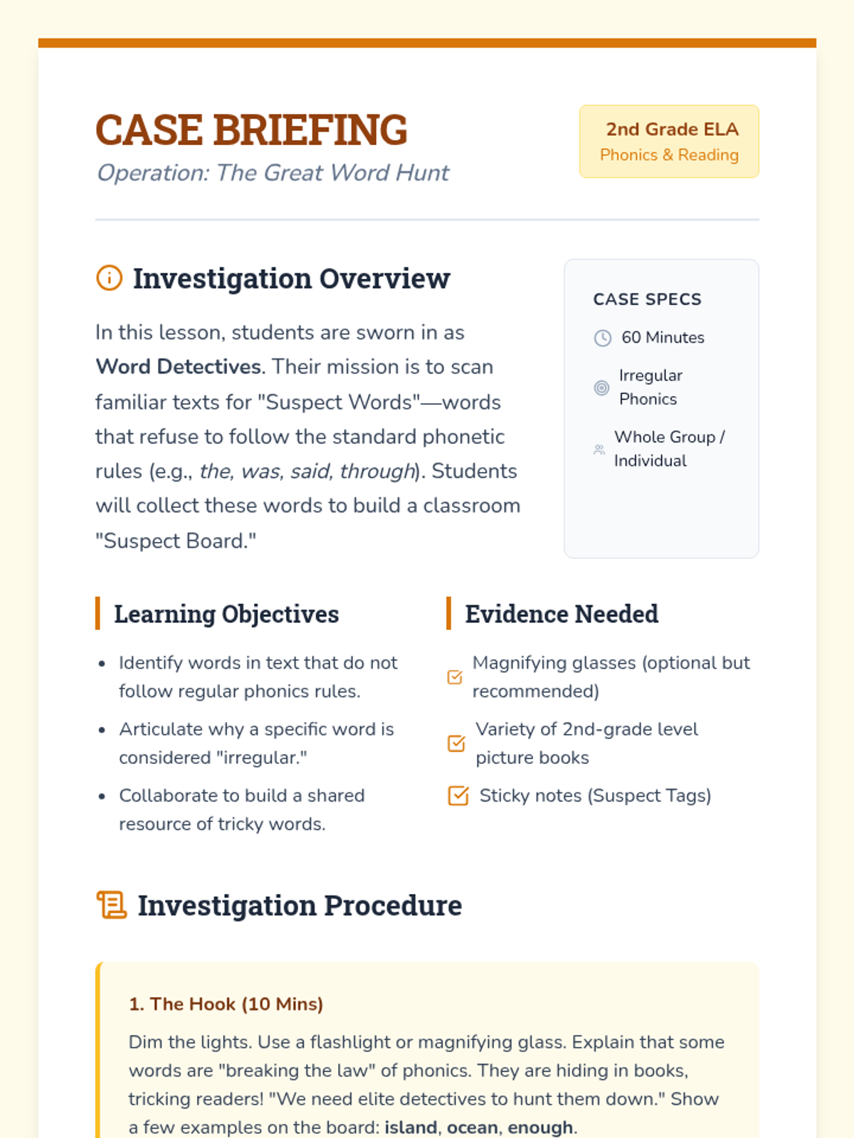 A 2nd-grade inquiry-based unit where students act as detectives to investigate, categorize, and master irregular spelling patterns in the English language. Students move from identifying 'suspect' words to categorizing them and eventually creating a class resource.