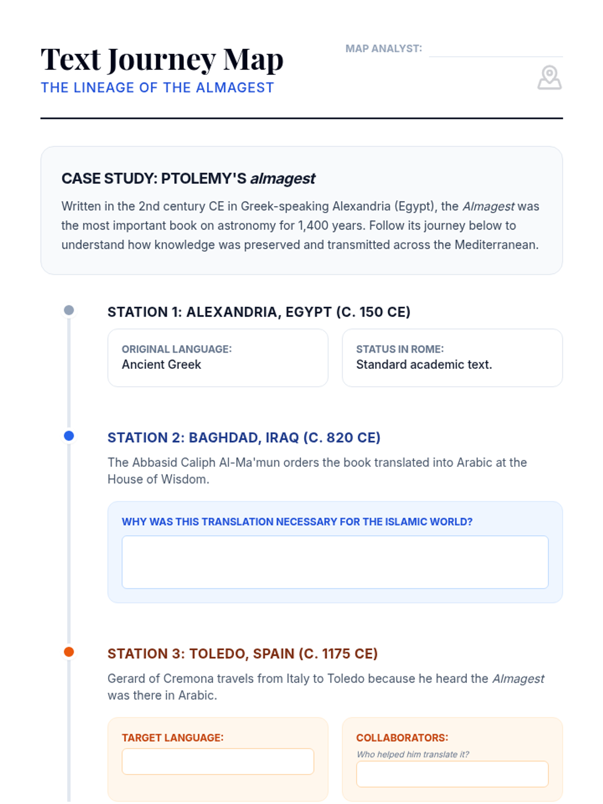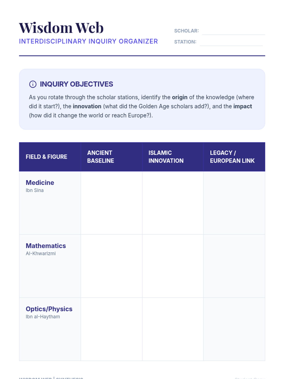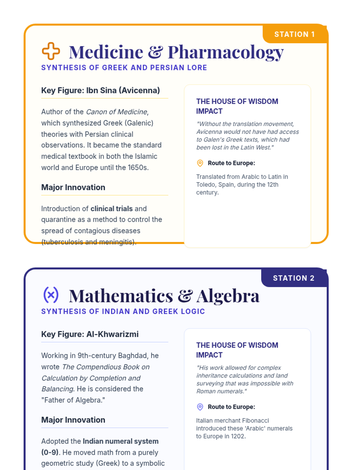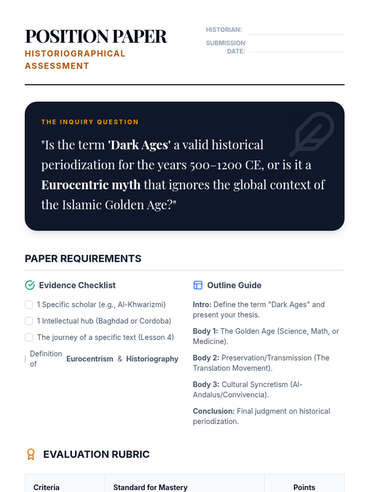 A comprehensive inquiry-based sequence for 12th-grade students examining the Islamic Golden Age as a bridge between Antiquity and the Renaissance, focusing on the preservation and expansion of global knowledge.