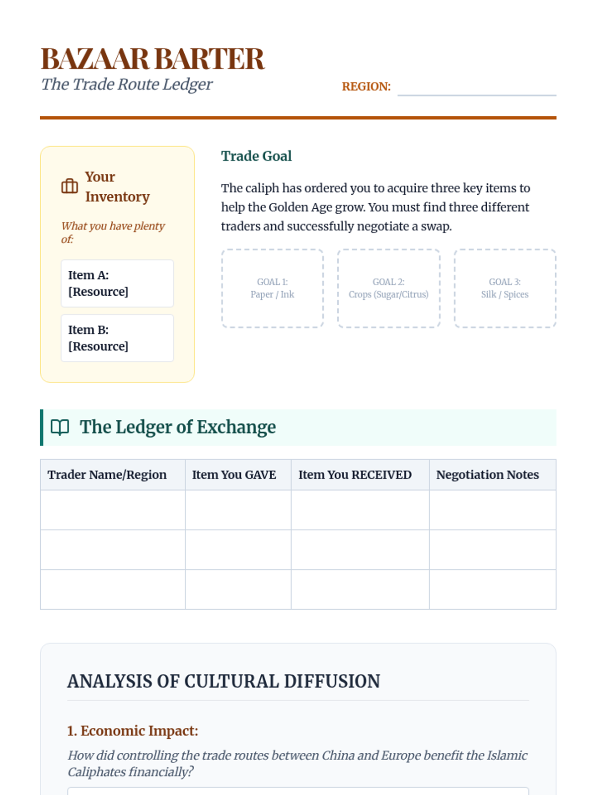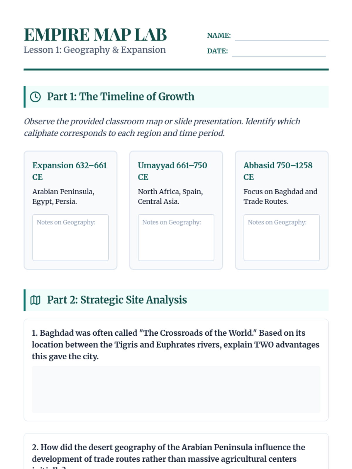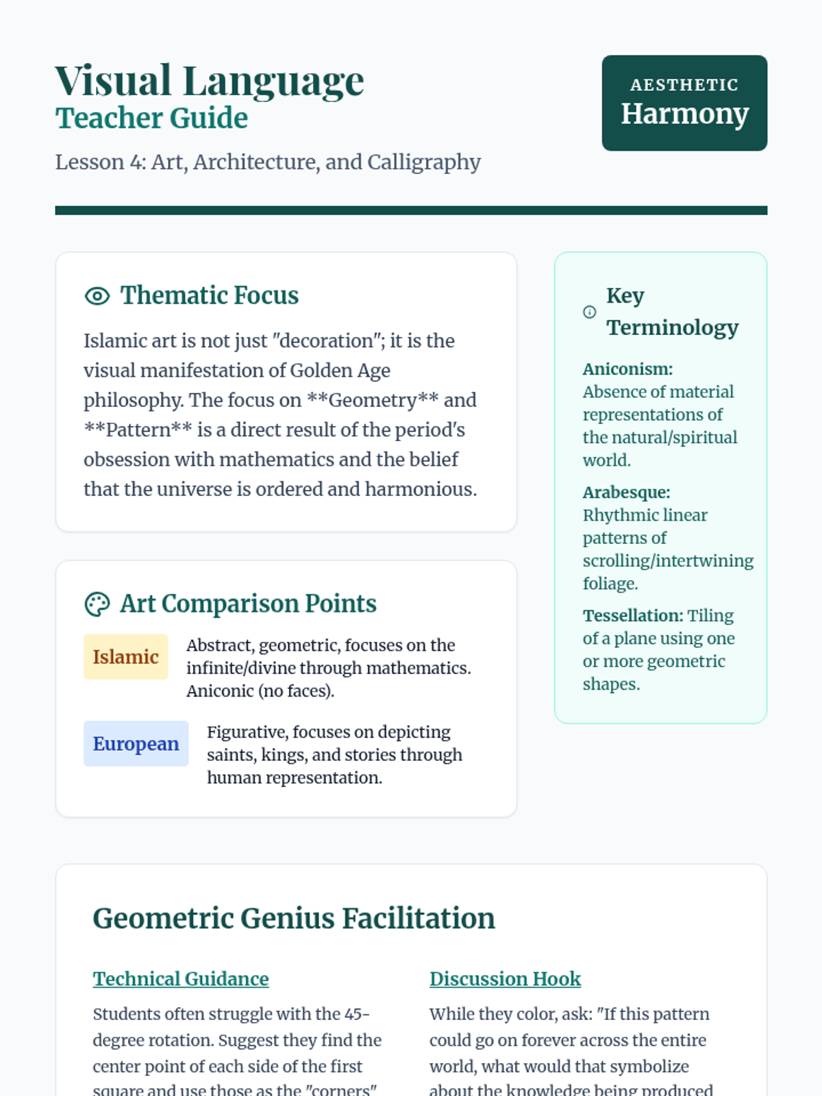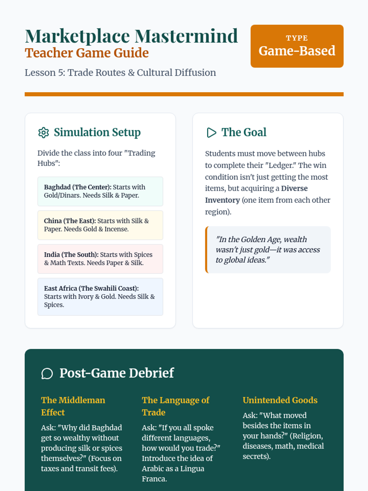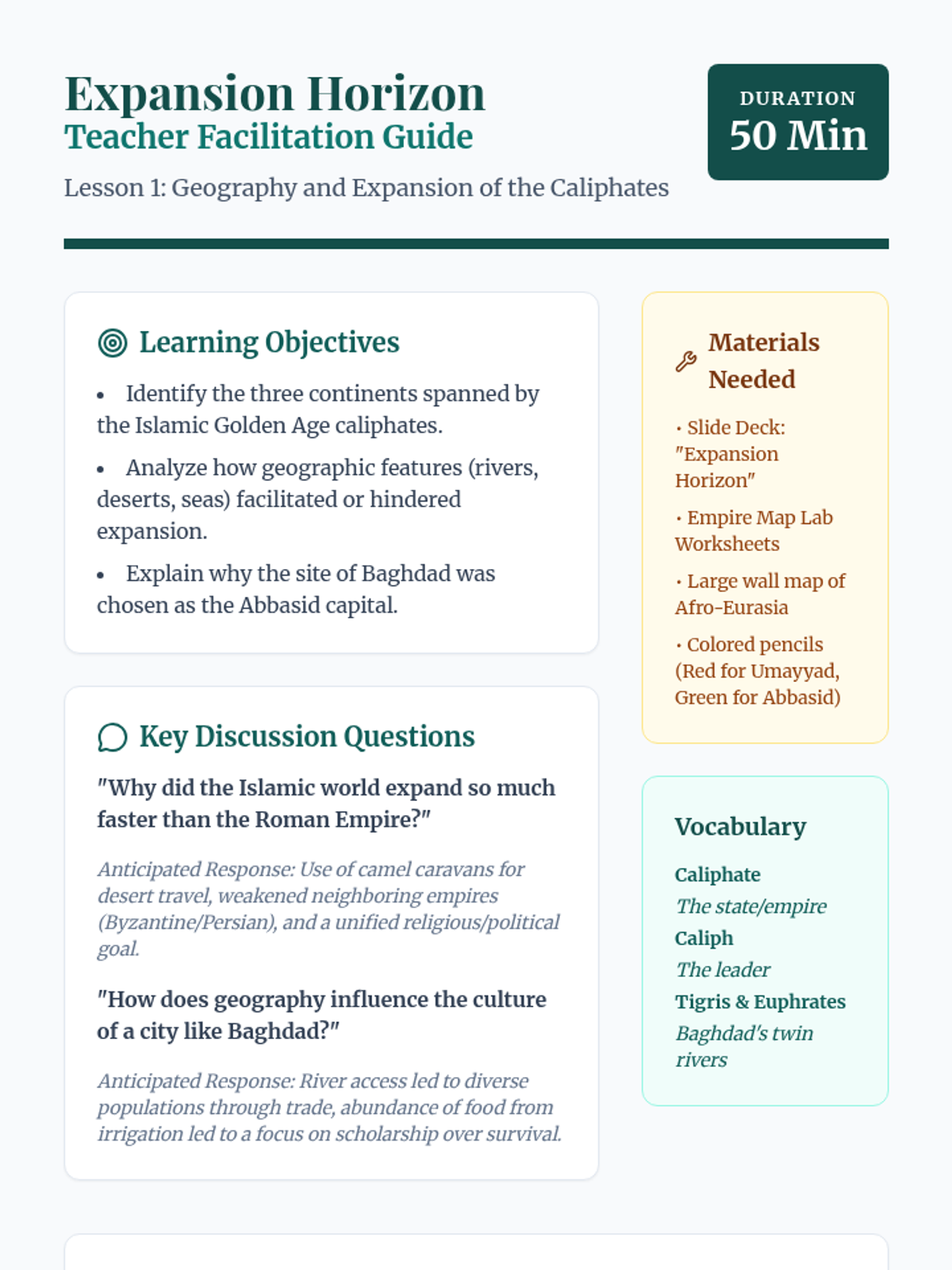 A 5-lesson sequence for 6th grade exploring the Islamic Golden Age, focusing on geographic expansion, scientific and mathematical breakthroughs, cultural preservation in Baghdad, and the impact of trade on global progress.