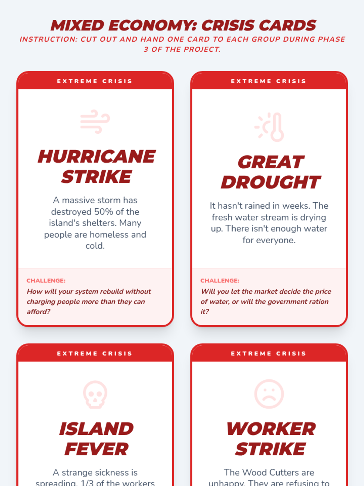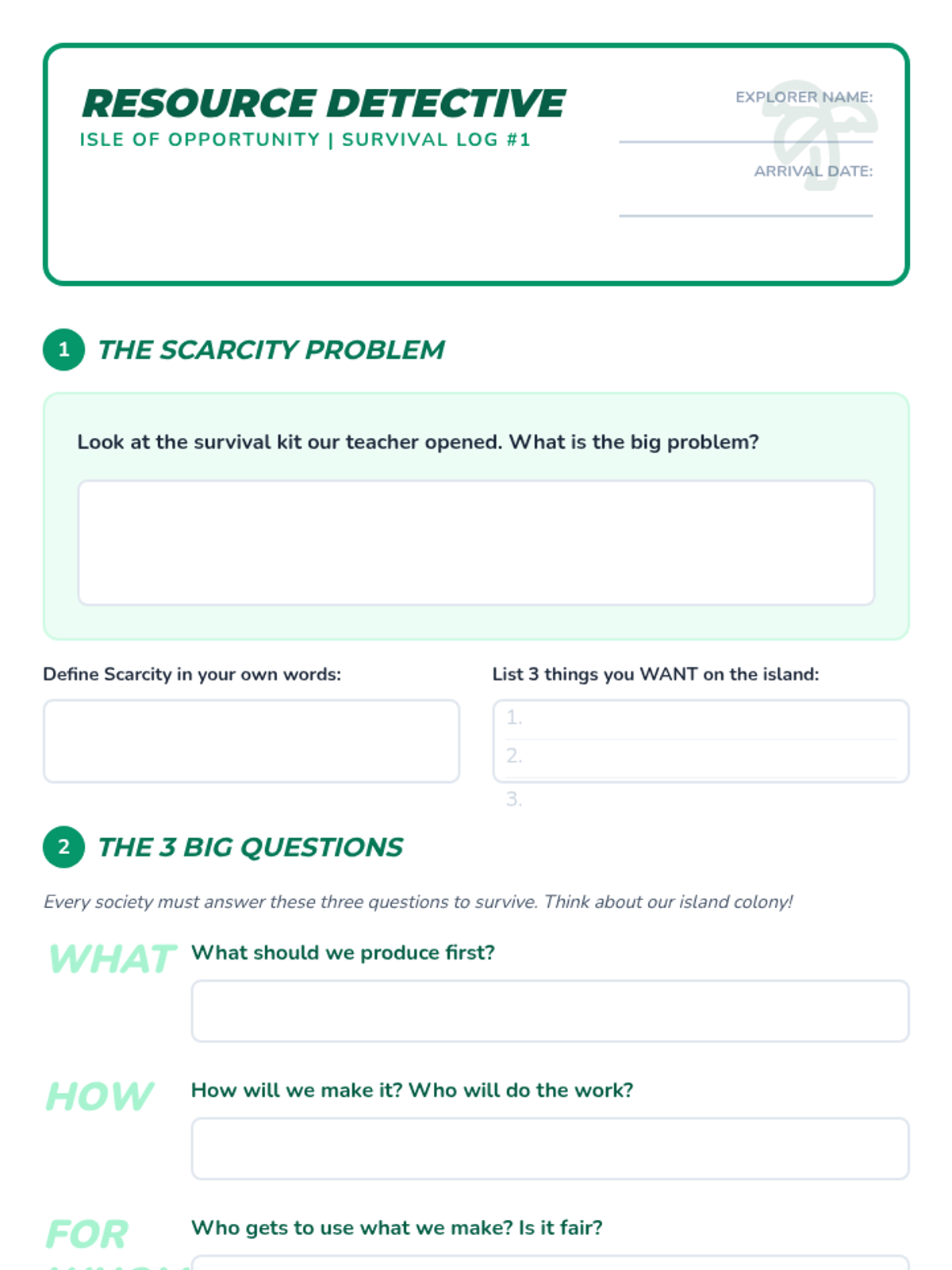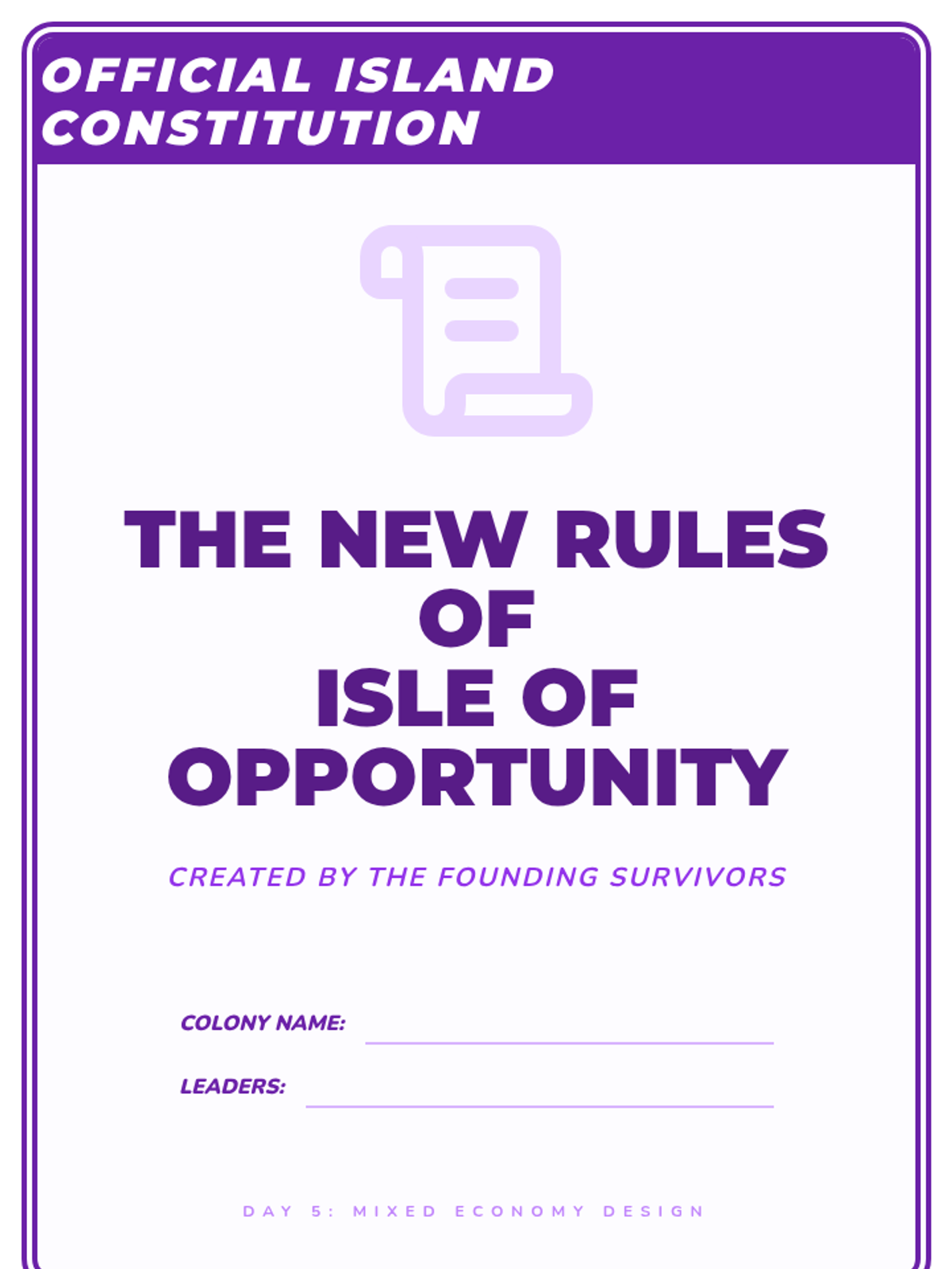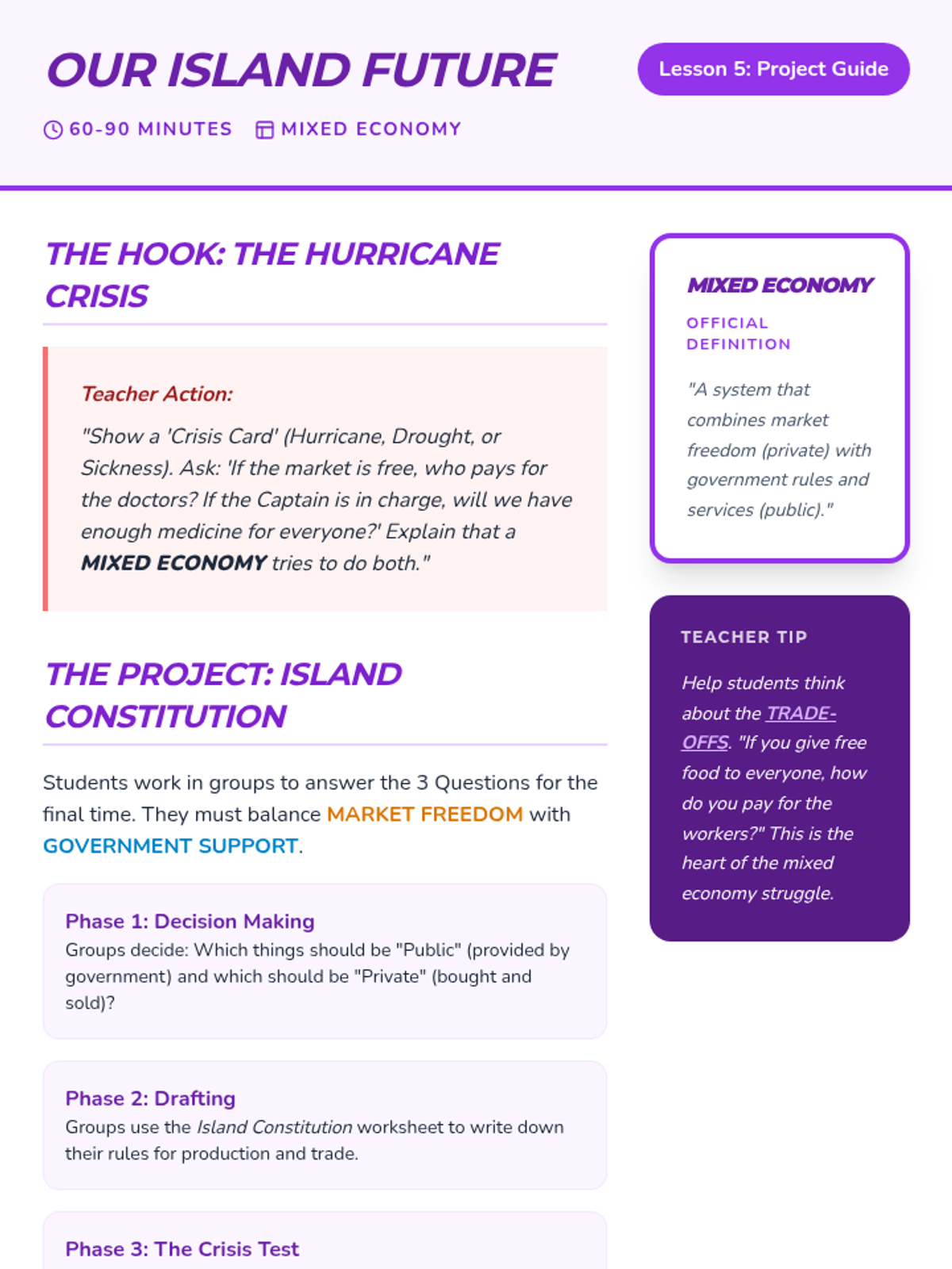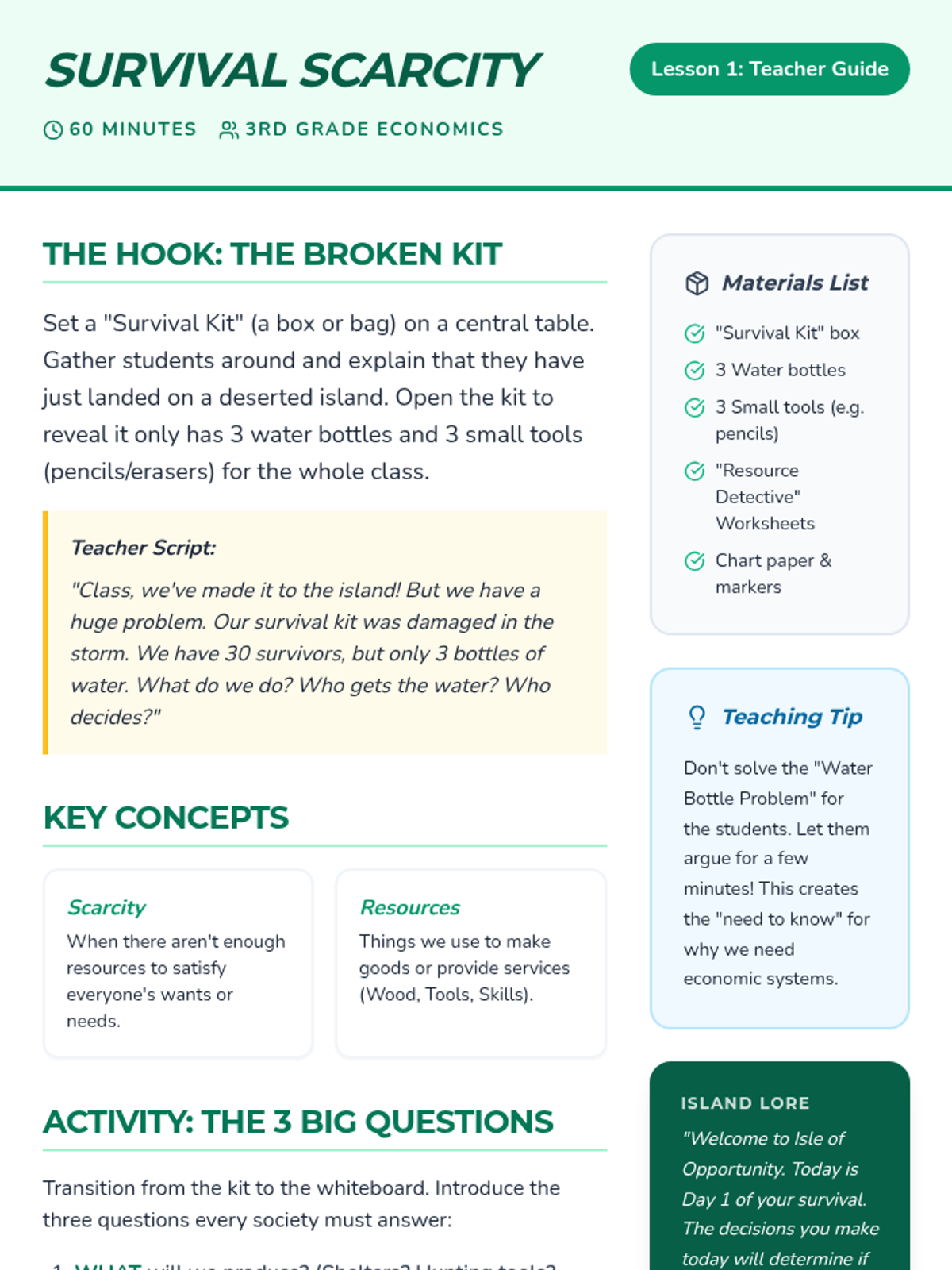 An immersive 3rd-grade economics unit where students transform into an 'Island Society.' They explore scarcity and the three basic economic questions by simulating command, market, and mixed economic systems to understand how rules shape community life.