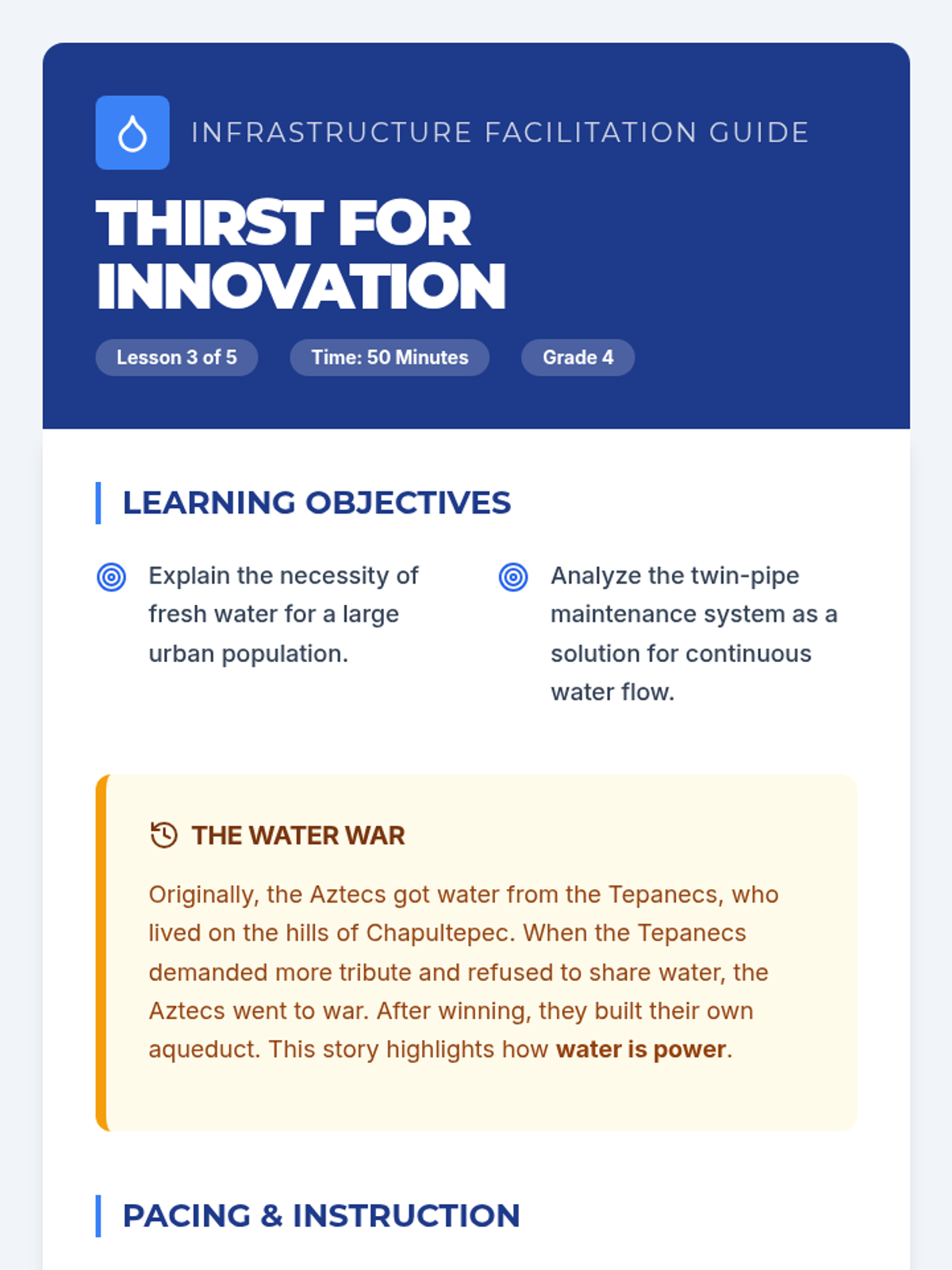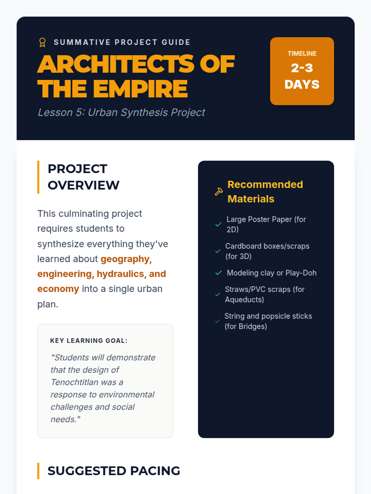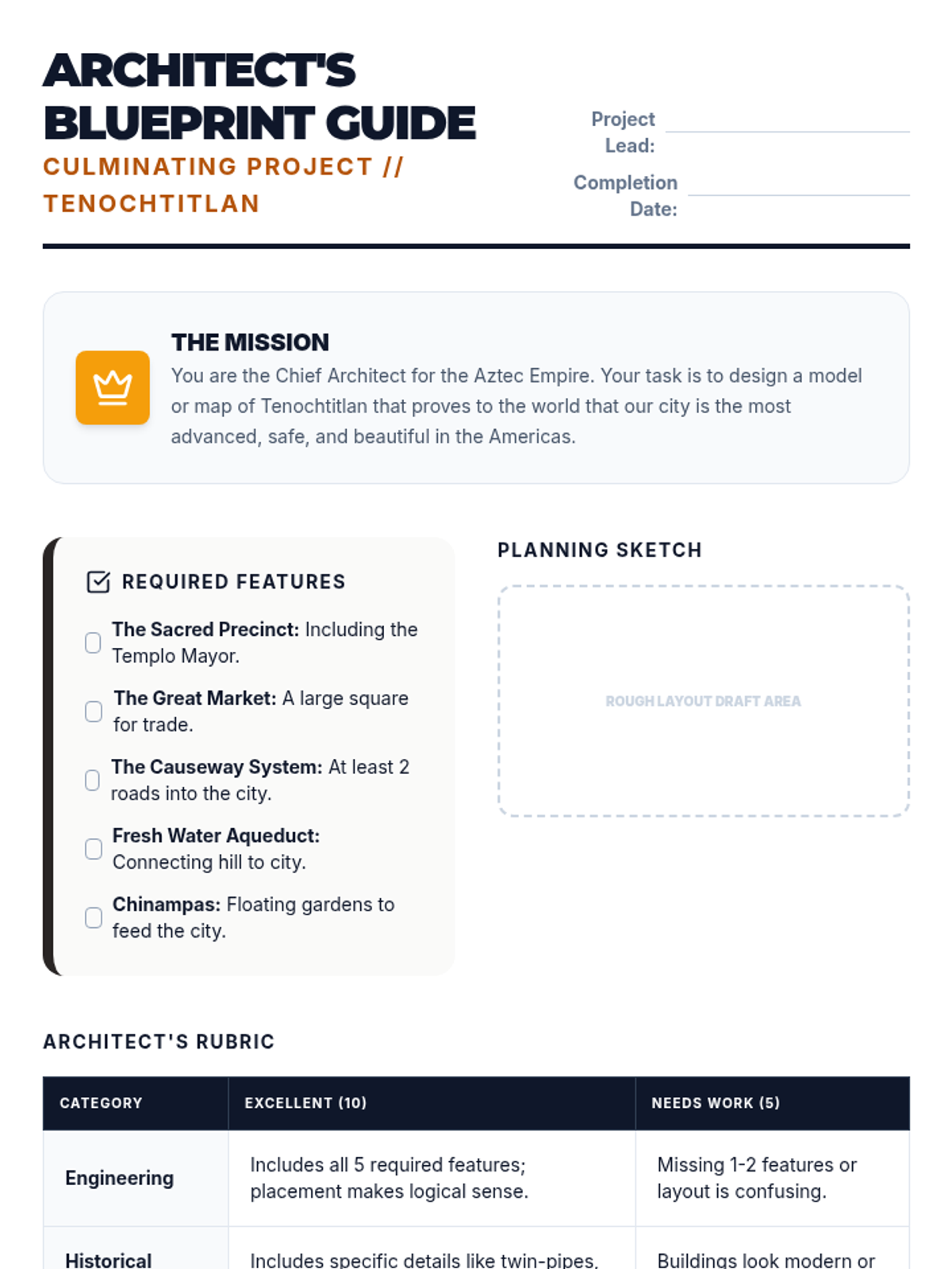 This project-based sequence examines the Aztecs through the lens of urban planning and engineering, specifically focusing on the capital city of Tenochtitlan. Students follow the arc of the city's development from a mythological sign on an island to one of the largest cities in the world at that time.
