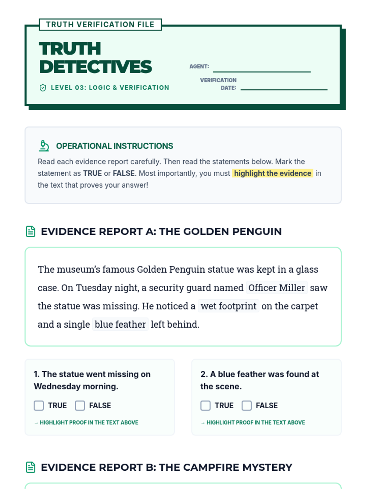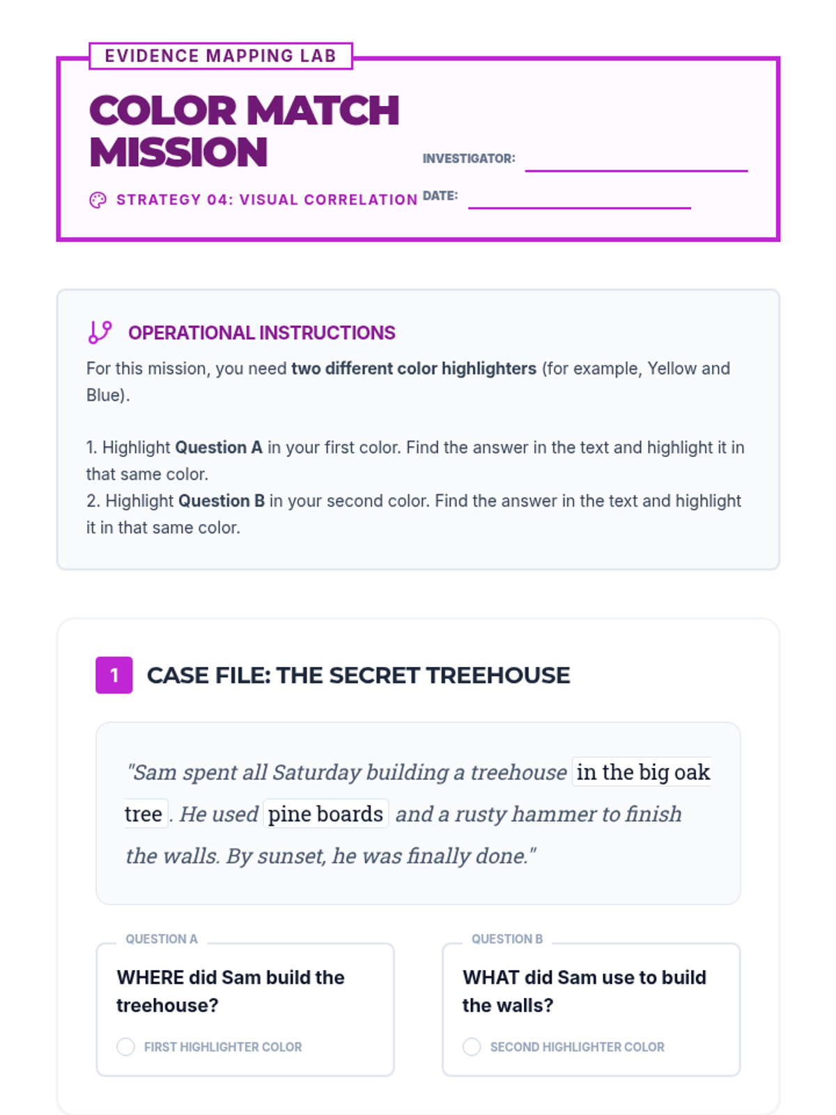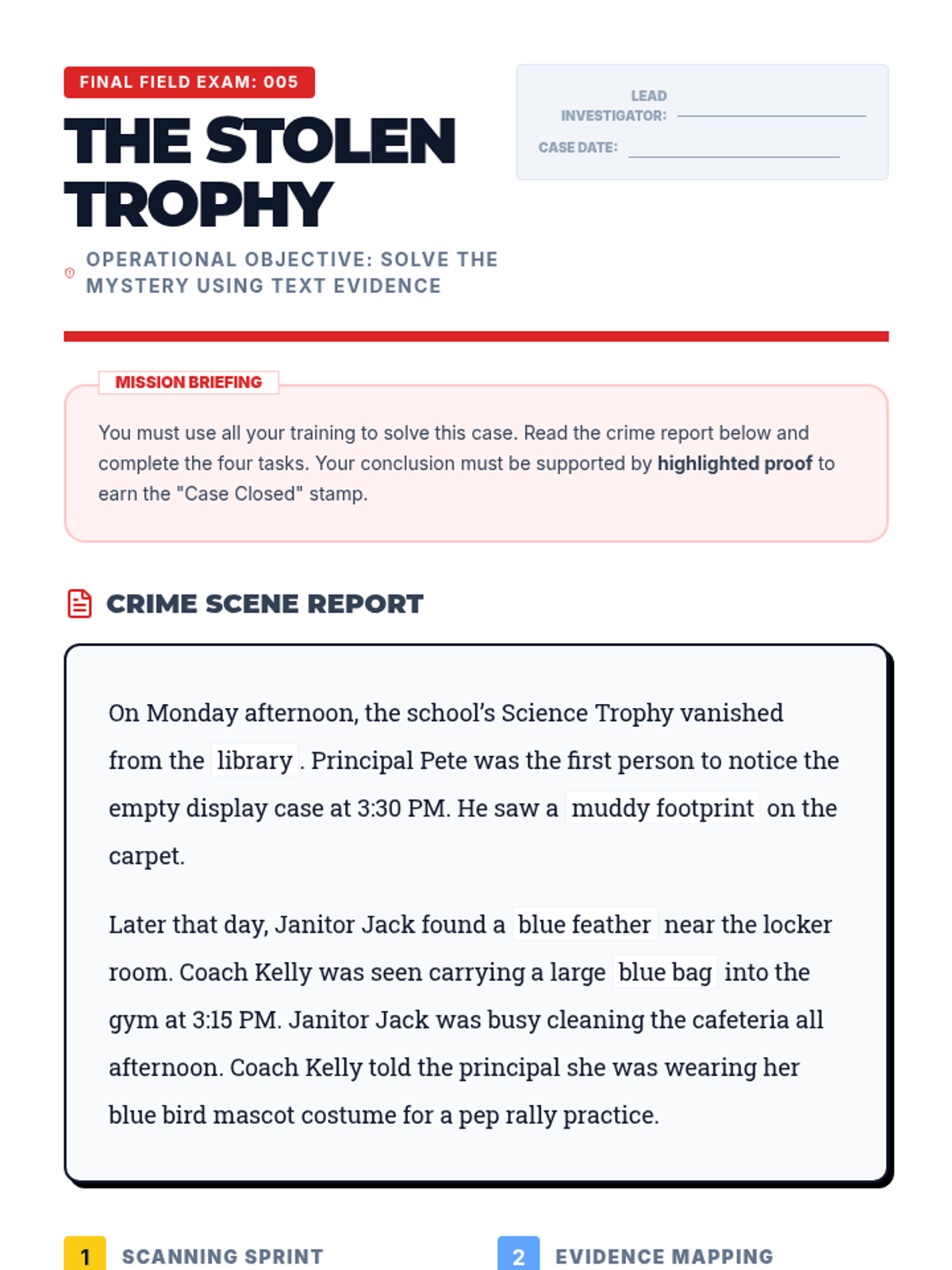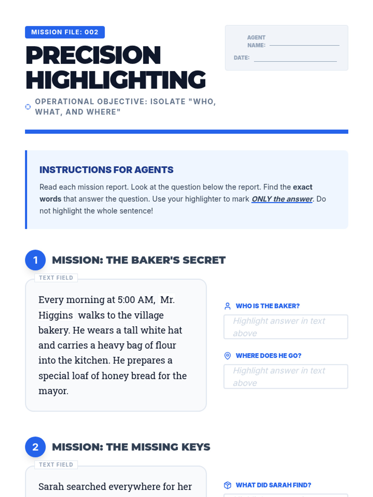 A detective-themed unit for 3rd grade students to master text highlighting and annotation strategies. Students learn to isolate specific text evidence to answer questions, verify facts, and solve mysteries through scanning and precision highlighting techniques.