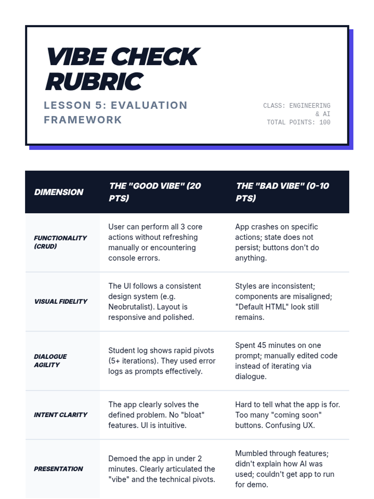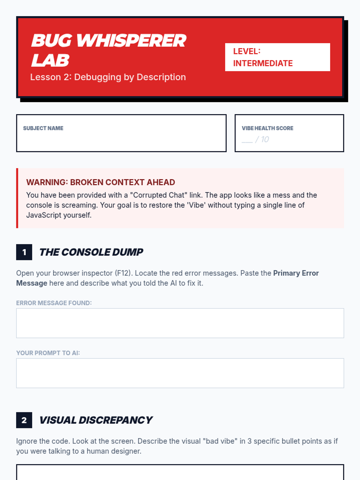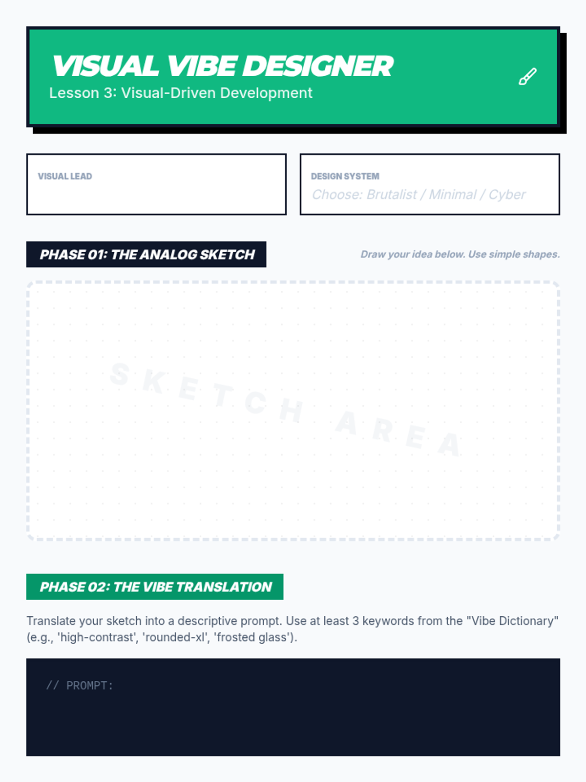 This sequence explores the 'Vibe Coding' methodology—a rapid, AI-assisted development cycle focusing on iterative prompting, descriptive debugging, and visual-driven design. Students move from basic 'speed runs' to building functional MVPs by leveraging natural language and rapid feedback loops.