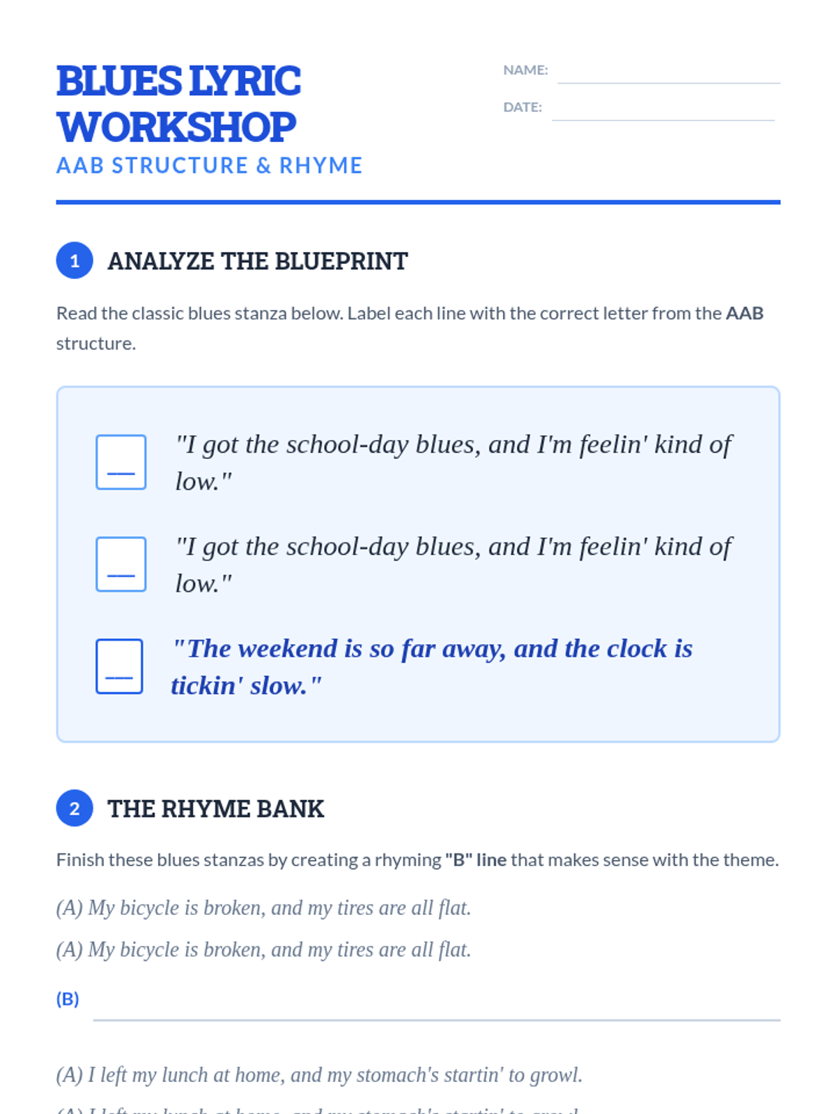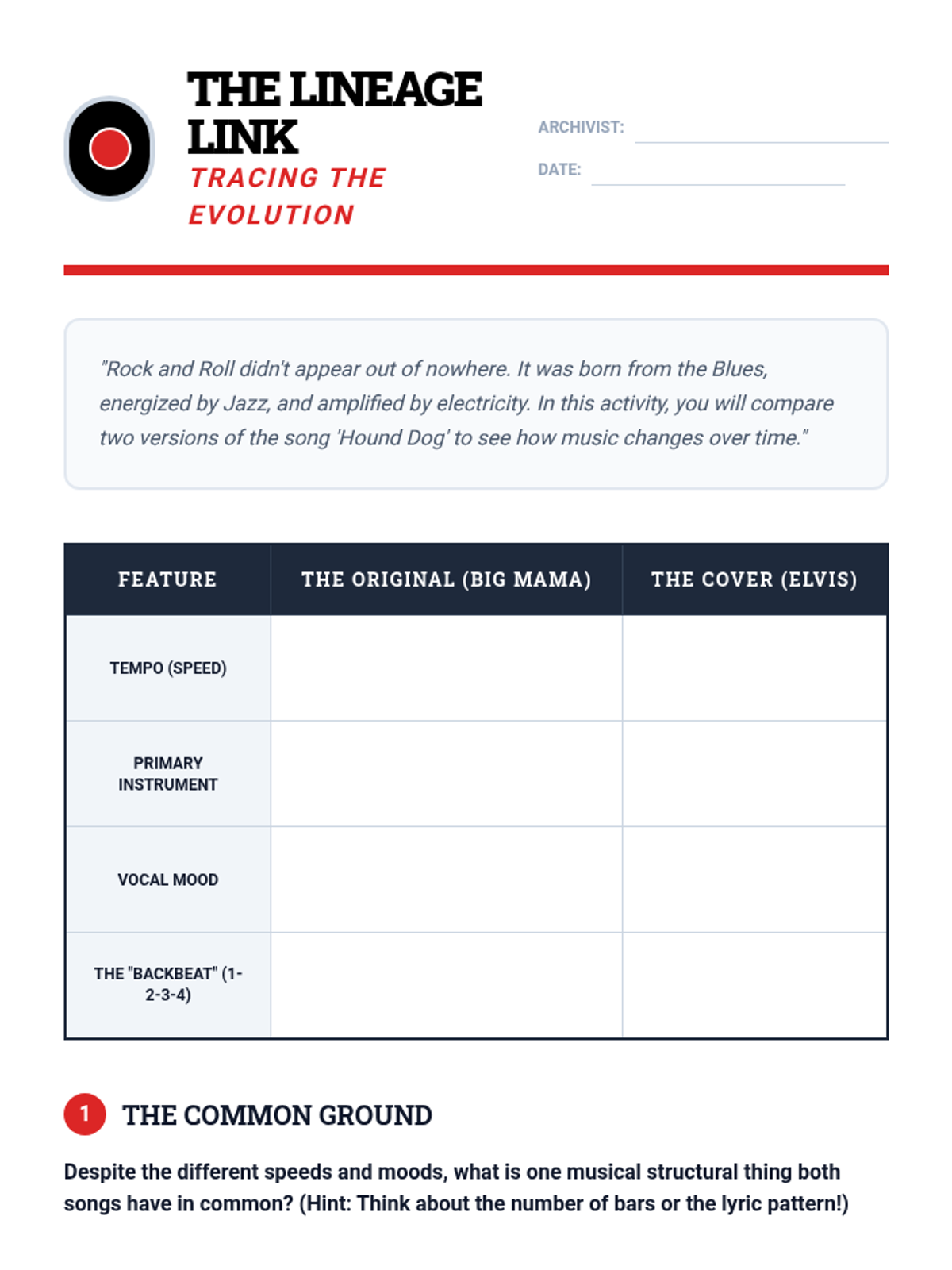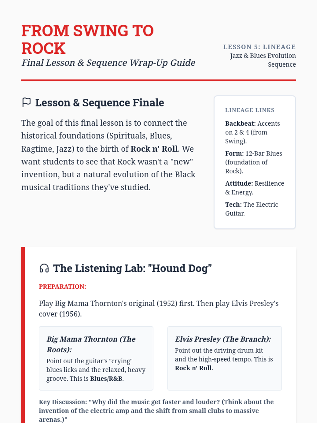 A 5th-grade music history sequence exploring the development of Jazz and Blues, from African call-and-response roots to the birth of Rock n' Roll. Students investigate structural forms like the 12-bar blues, concepts like syncopation and improvisation, and the cultural resilience behind the music.