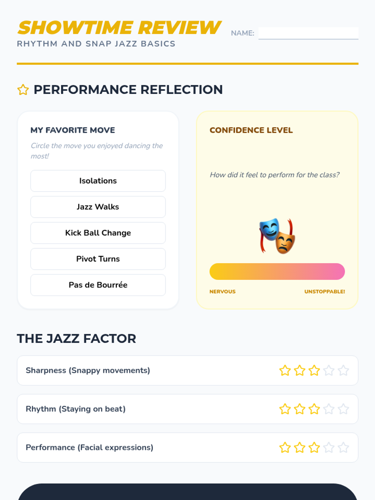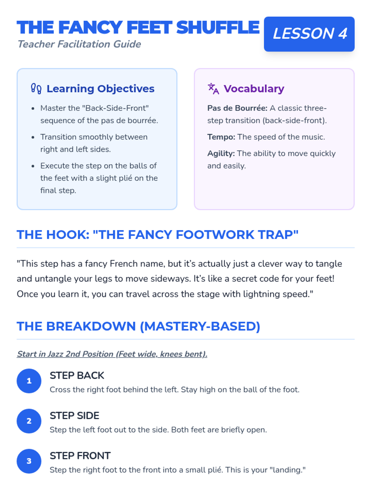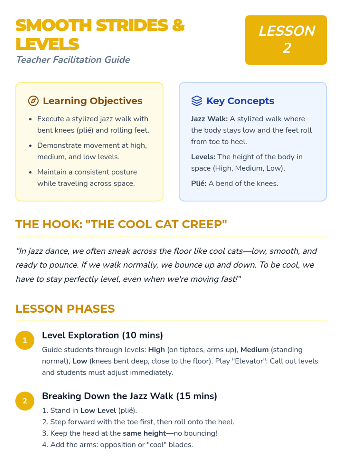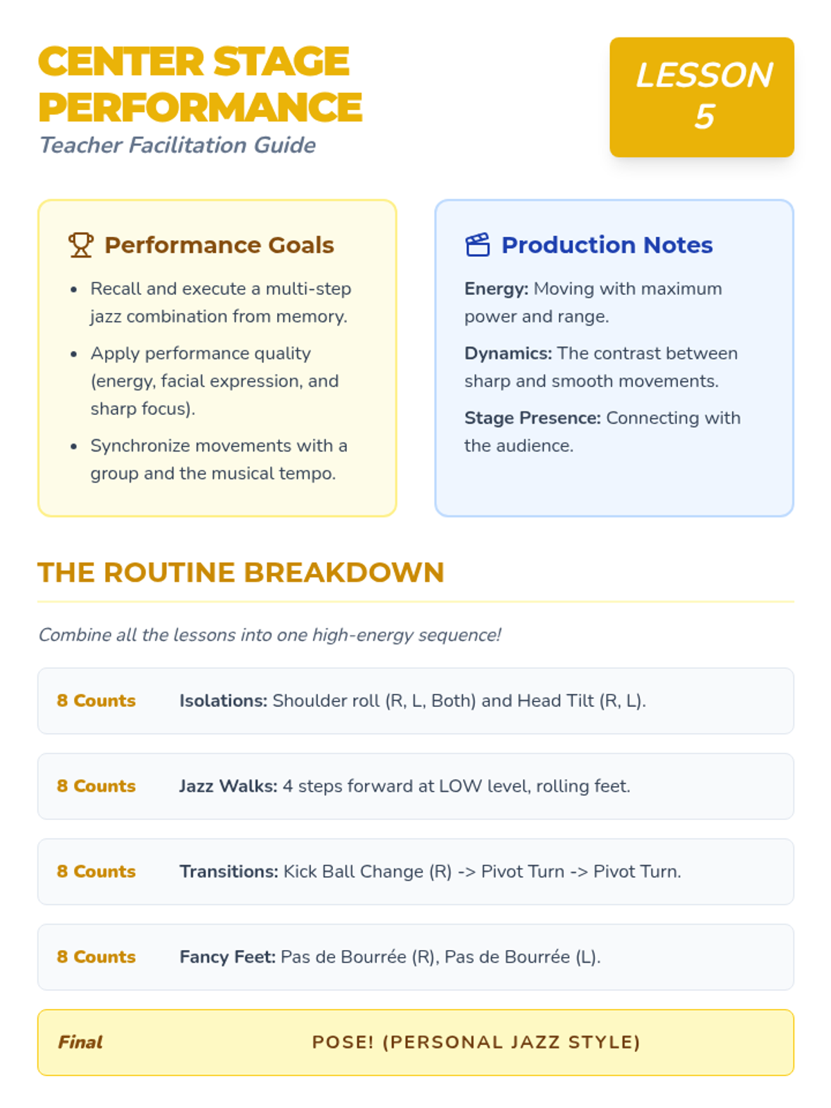 This sequence introduces 3rd-grade students to the fundamental techniques of jazz dance, focusing on body isolations, rhythmic footwork, and stylized movement. Students progress from simple isolations to complex steps like the pas de bourrée, culminating in a choreographed performance that emphasizes precision and energy.