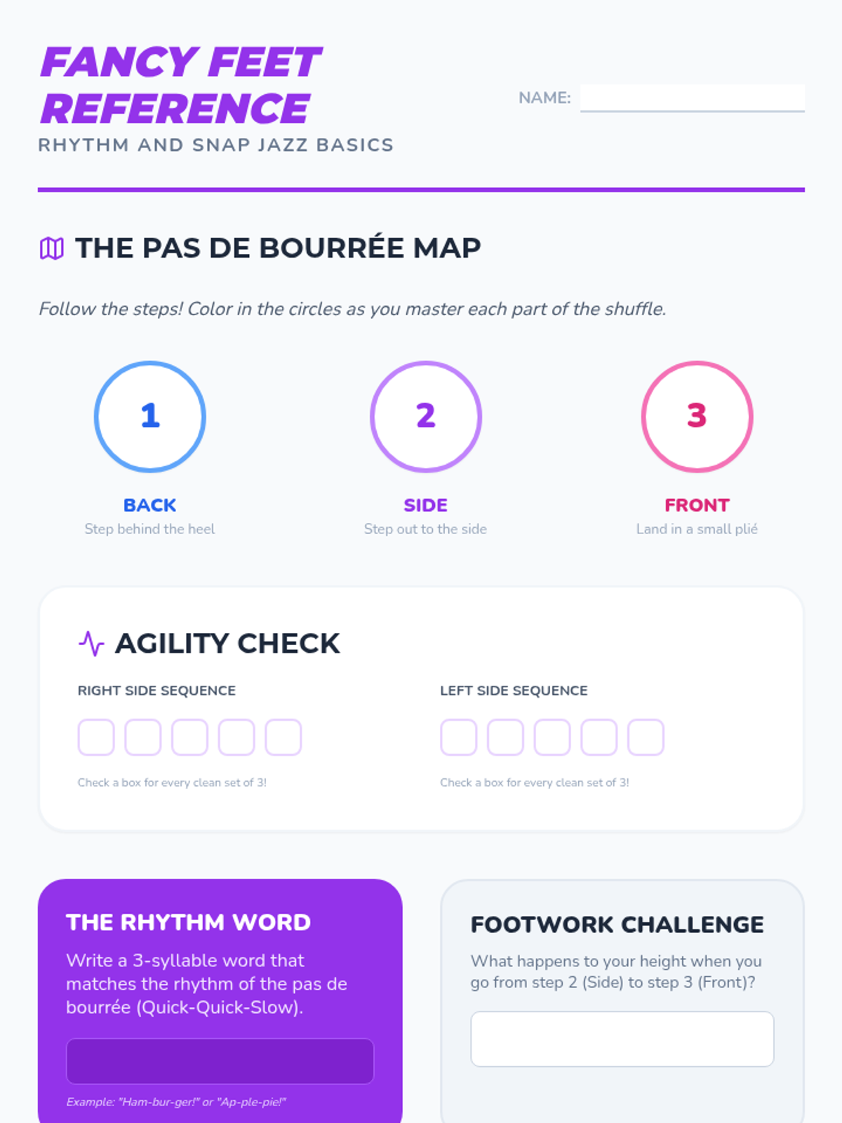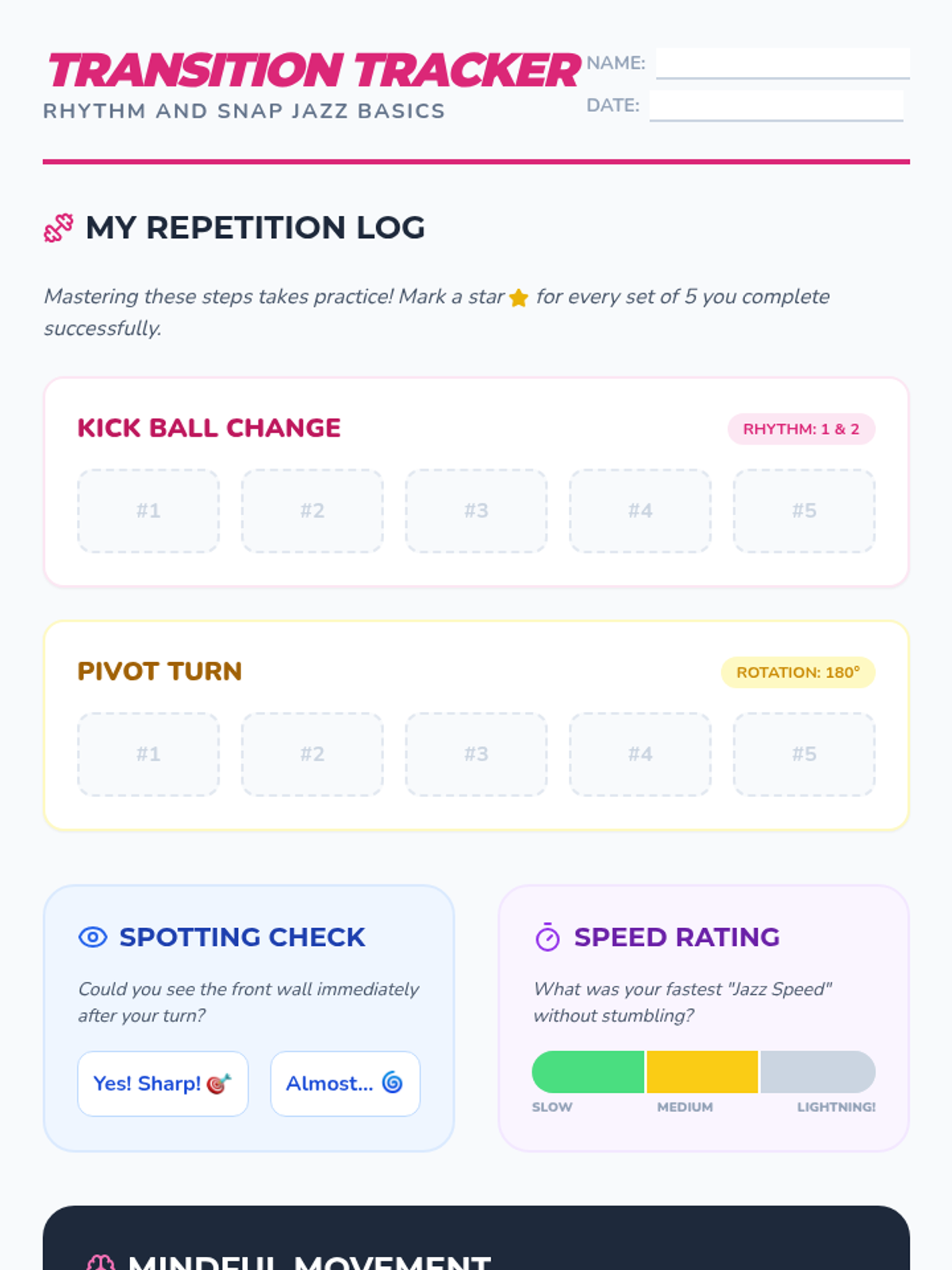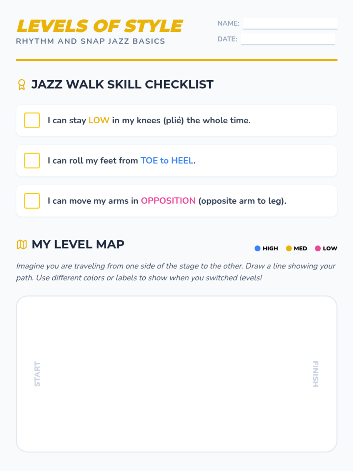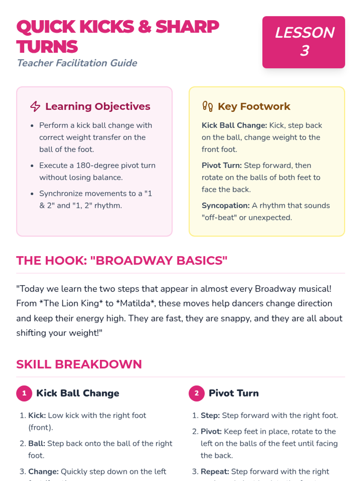 This sequence introduces 3rd-grade students to the fundamental techniques of jazz dance, focusing on body isolations, rhythmic footwork, and stylized movement. Students progress from simple isolations to complex steps like the pas de bourrée, culminating in a choreographed performance that emphasizes precision and energy.