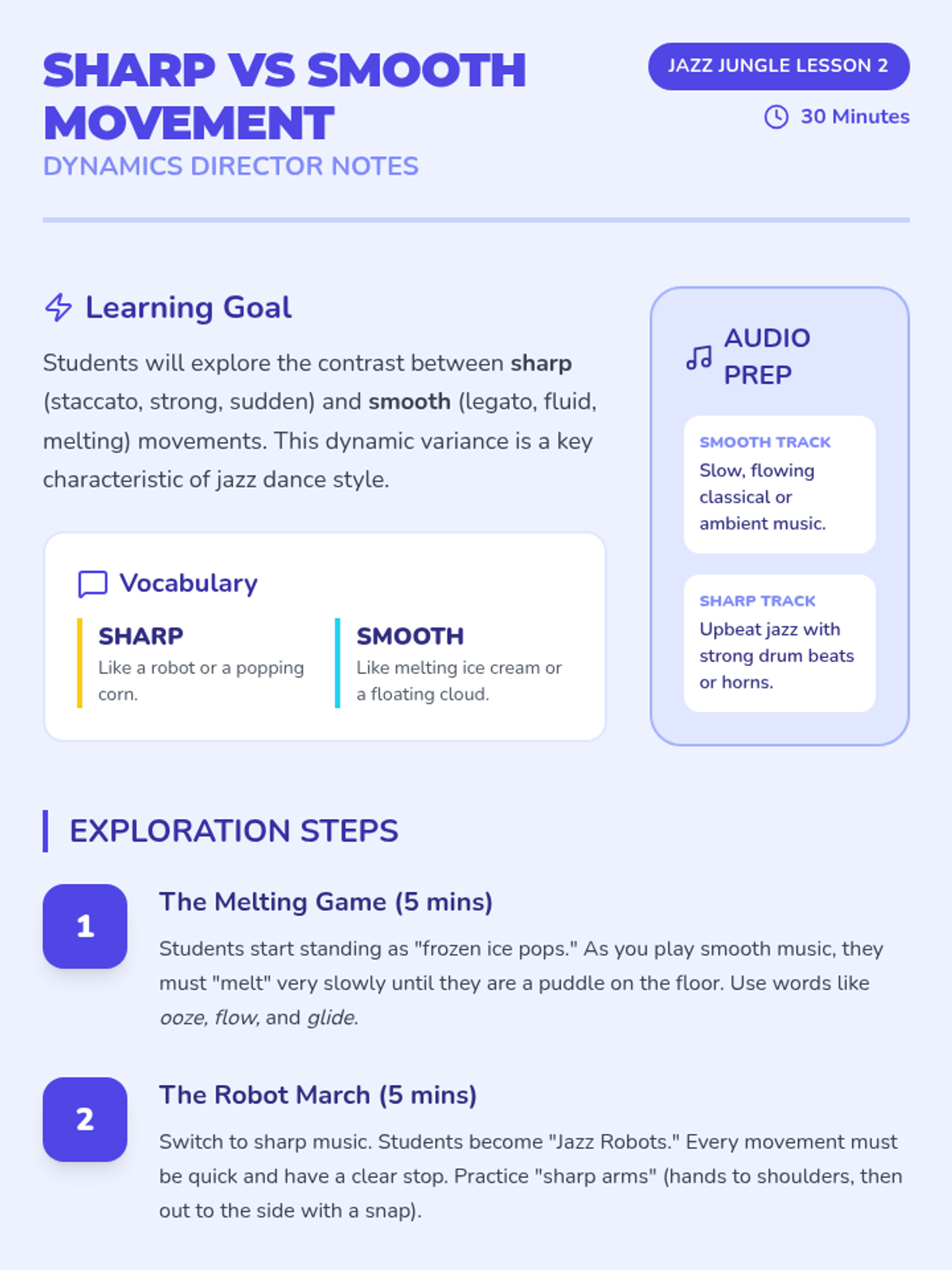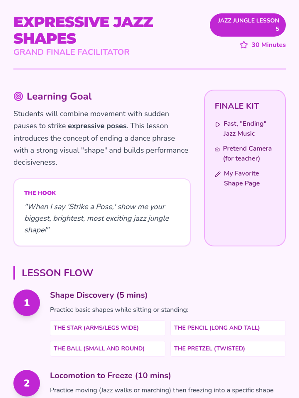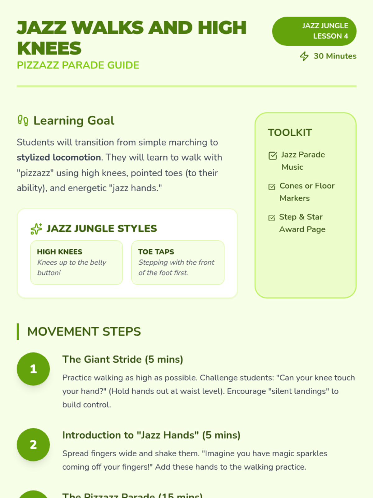 A high-energy dance sequence for Pre-K students focusing on body isolations, dynamics, rhythm, and stylized movement through a 'Neon Jungle' theme. Students will learn the building blocks of jazz dance while developing coordination and musicality.