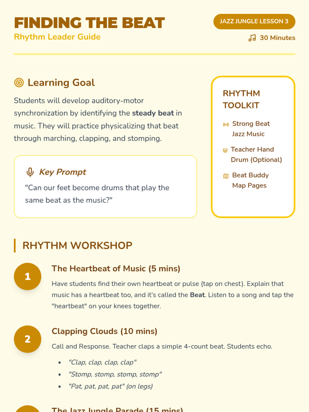 A 5th-grade music history sequence exploring the development of Jazz and Blues, from African call-and-response roots to the birth of Rock n' Roll. Students investigate structural forms like the 12-bar blues, concepts like syncopation and improvisation, and the cultural resilience behind the music.