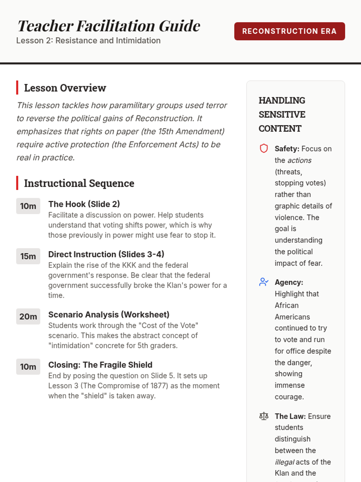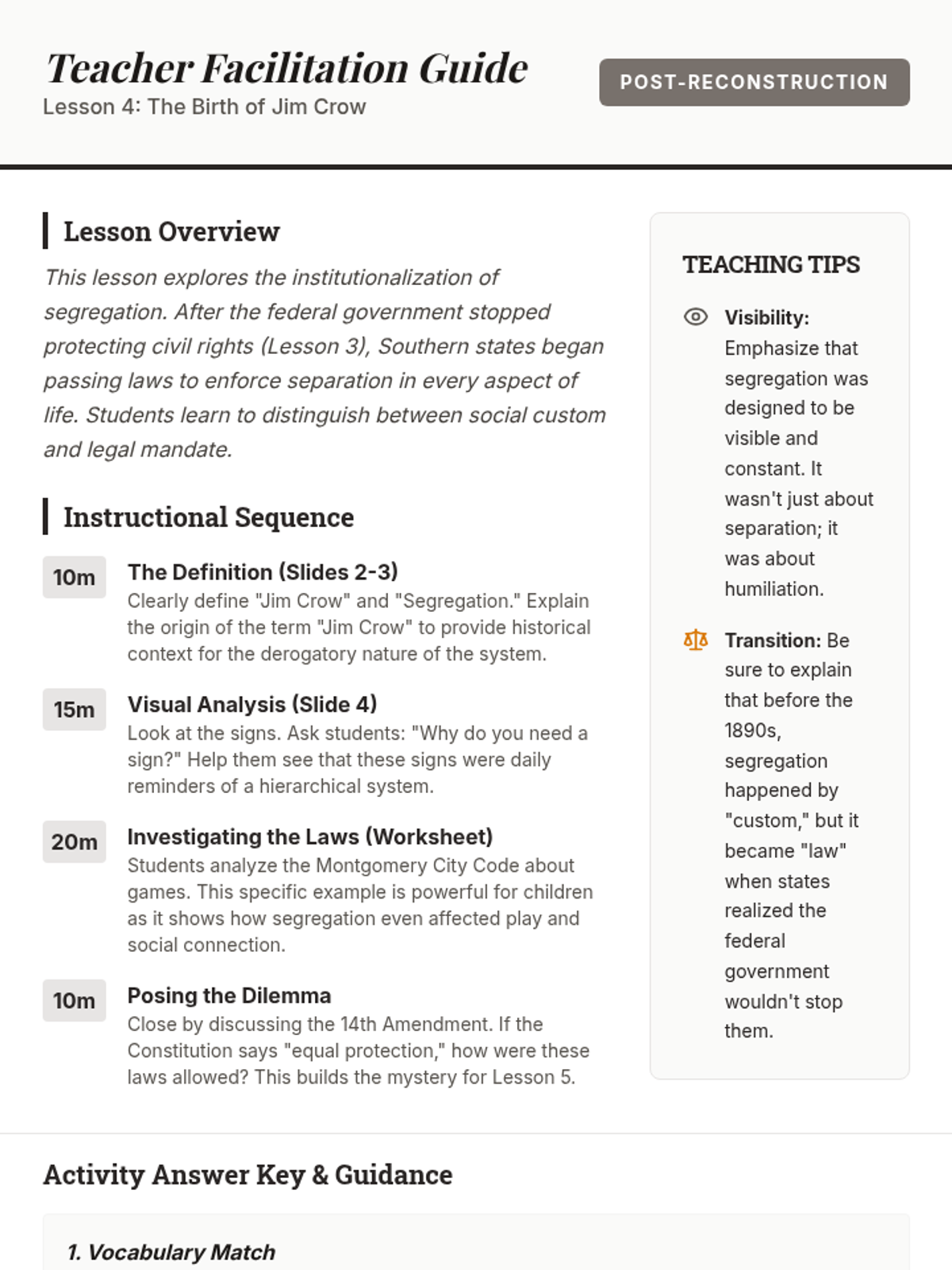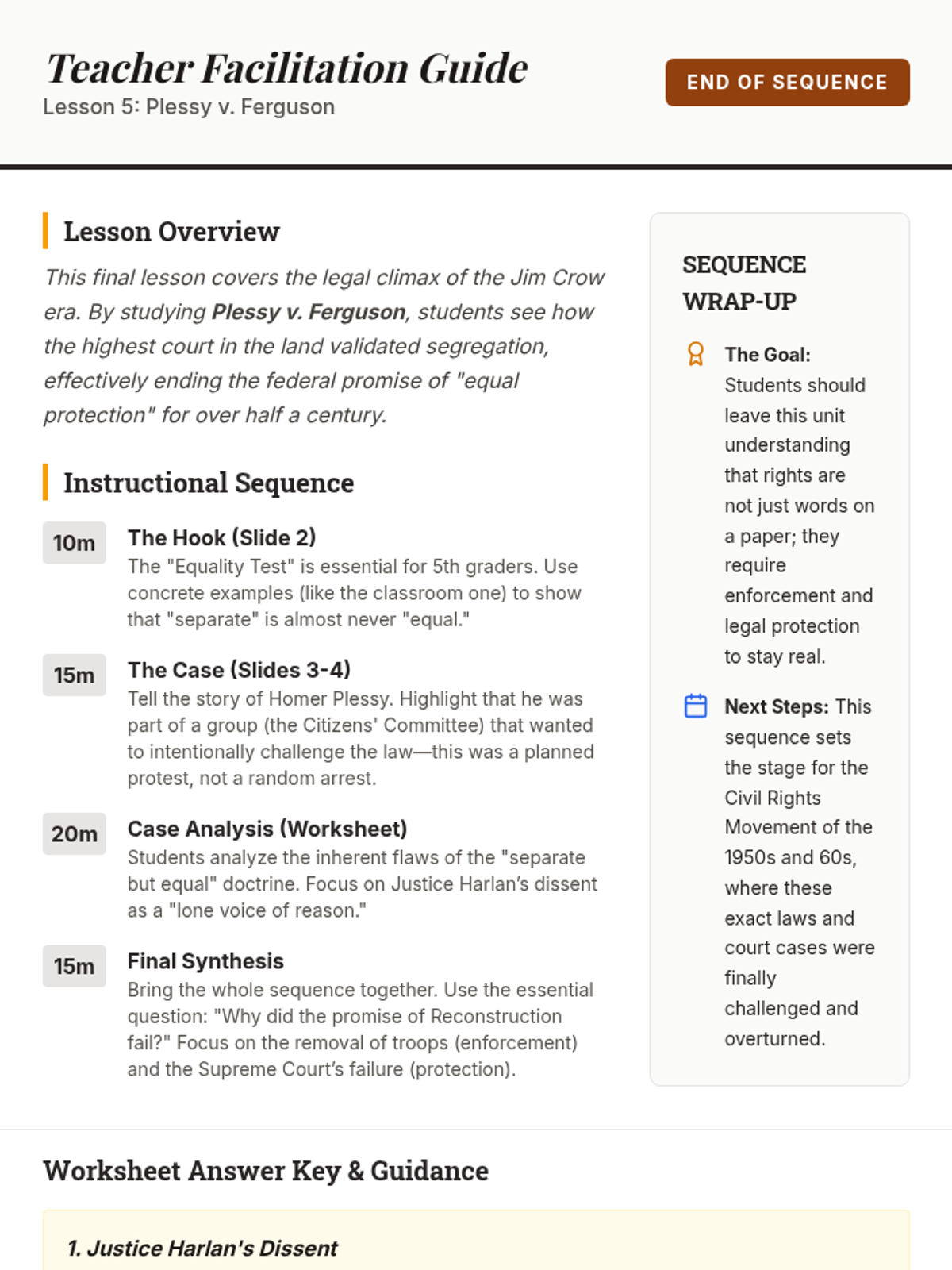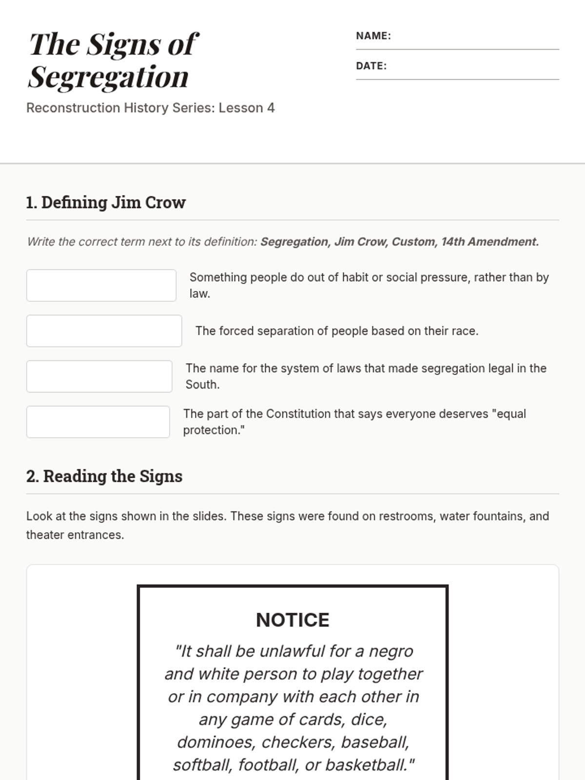 This 5th-grade history sequence explores the dismantling of Reconstruction and the rise of Jim Crow laws, focusing on how legal and social systems were used to restrict the rights of African Americans after the Civil War.