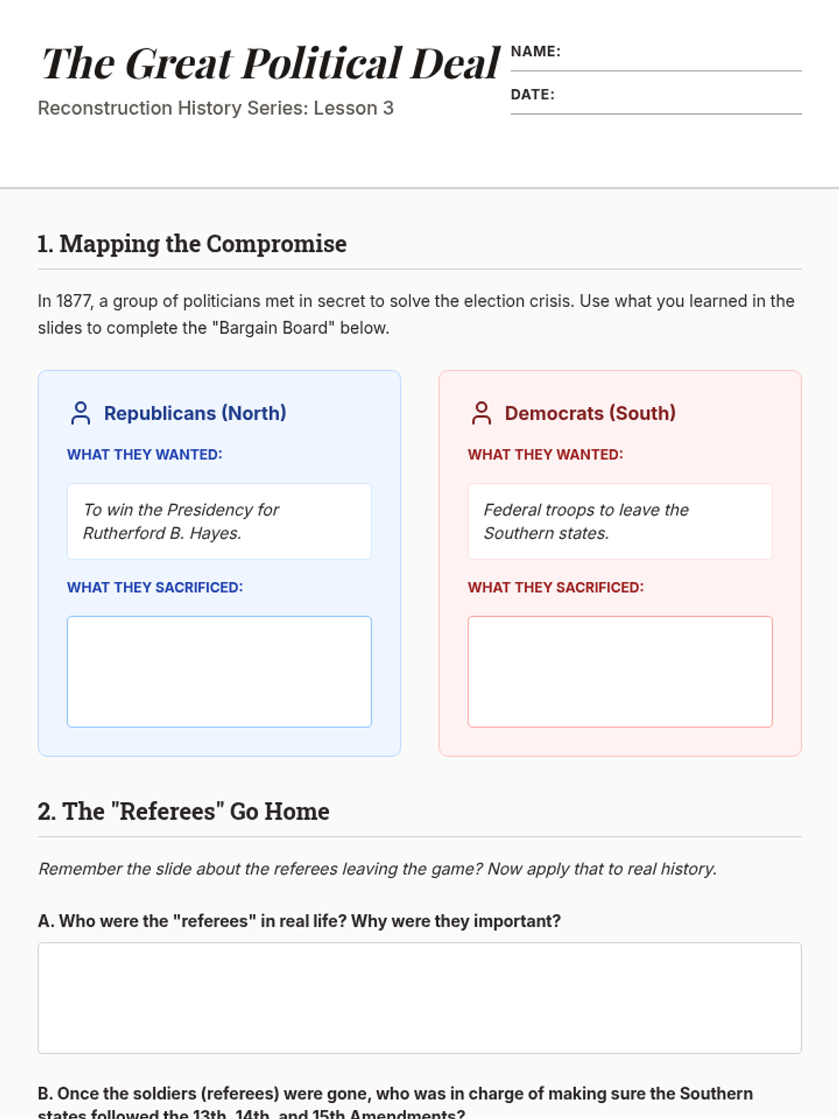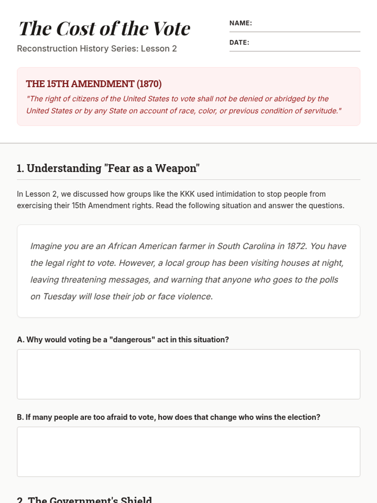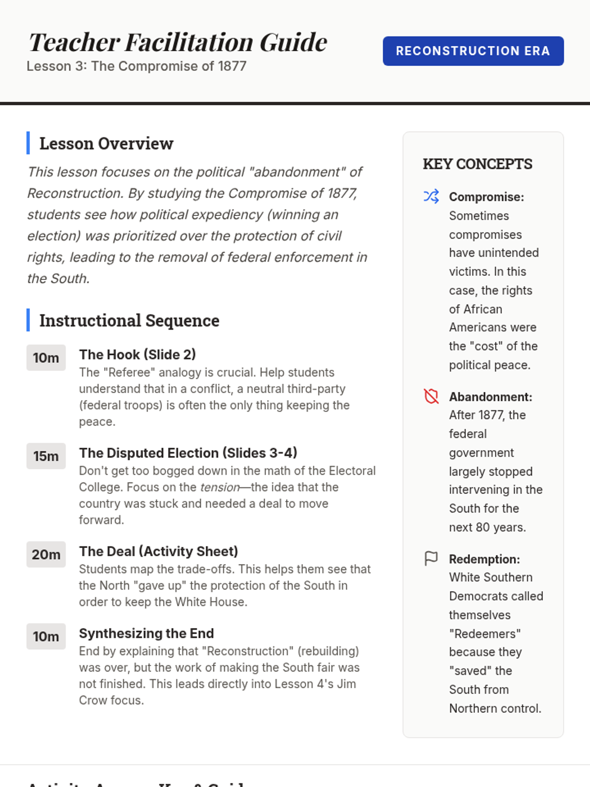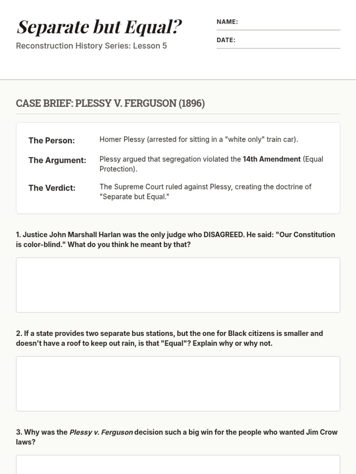 This 5th-grade history sequence explores the dismantling of Reconstruction and the rise of Jim Crow laws, focusing on how legal and social systems were used to restrict the rights of African Americans after the Civil War.
