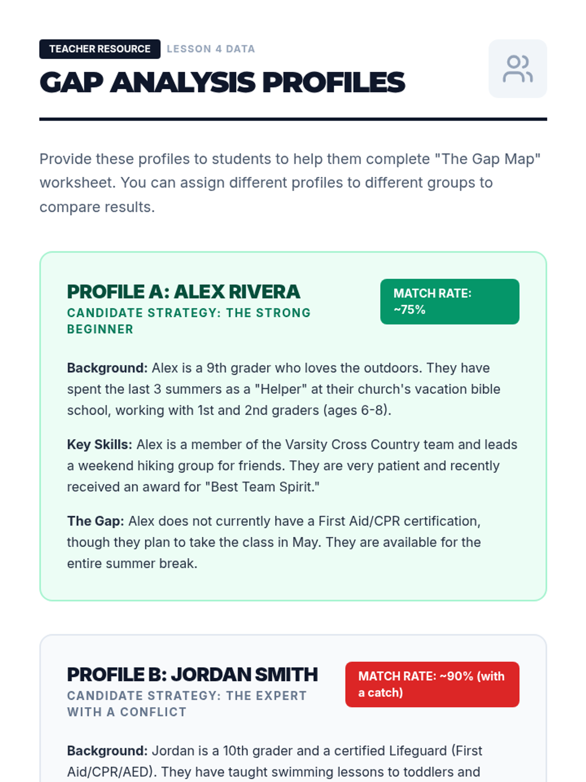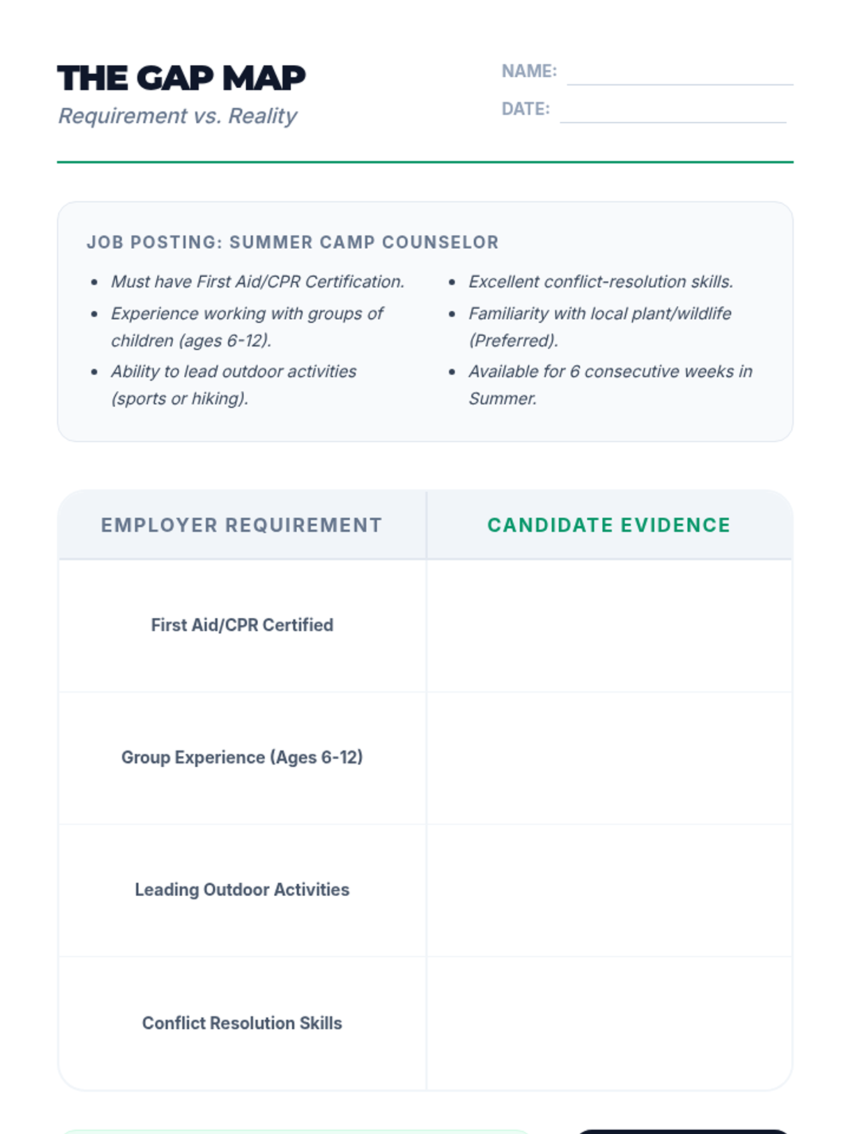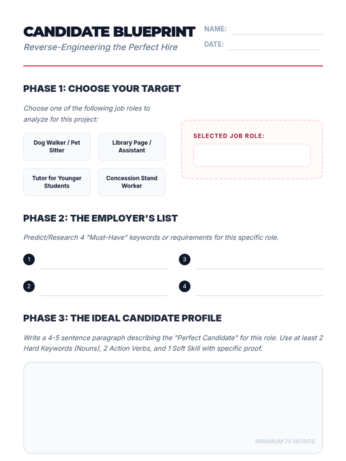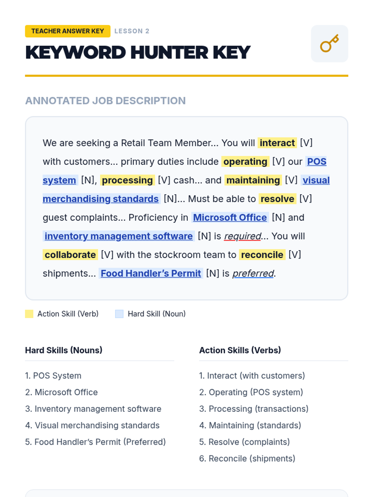 A sequence focused on deconstructing job postings to understand employer needs. Students learn to identify job structure, extract keywords, decode soft skills, and perform gap analyses to prepare for tailored resume writing.
