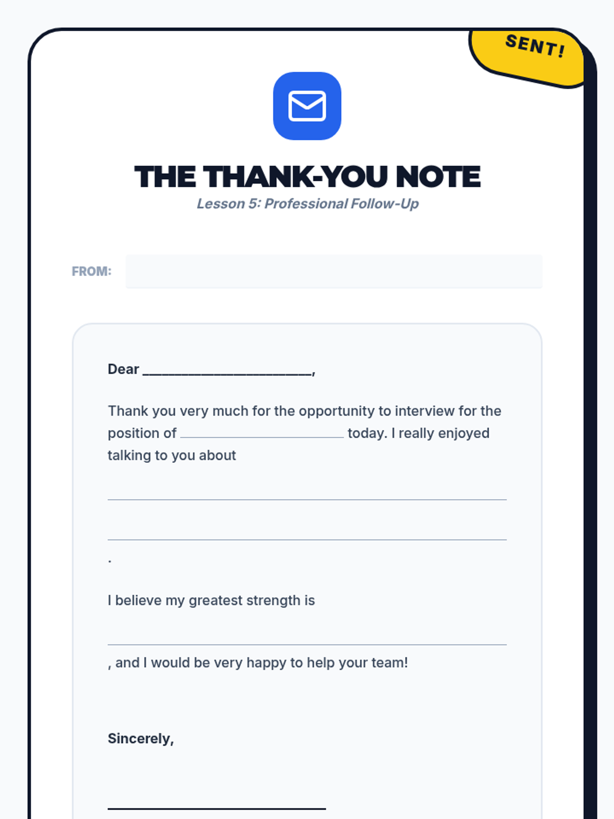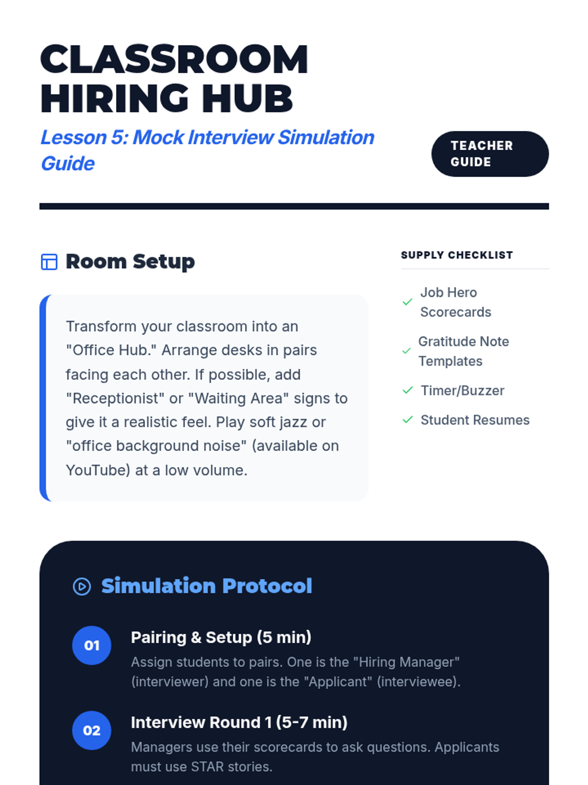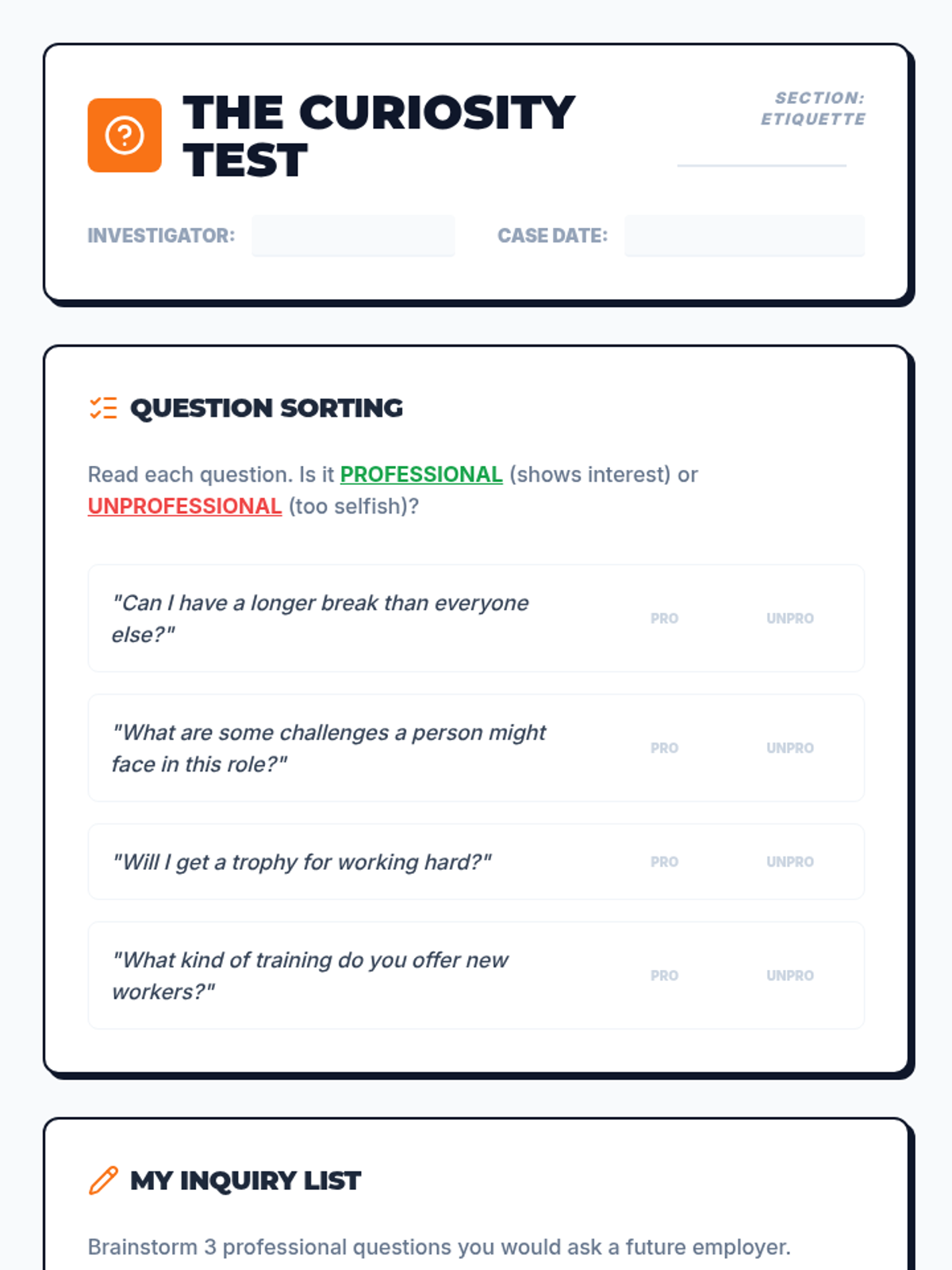 A comprehensive unit on professional communication, interview skills, and workplace etiquette. Students master non-verbal cues, the STAR response method, active listening, and professional follow-ups to prepare for classroom job simulations.