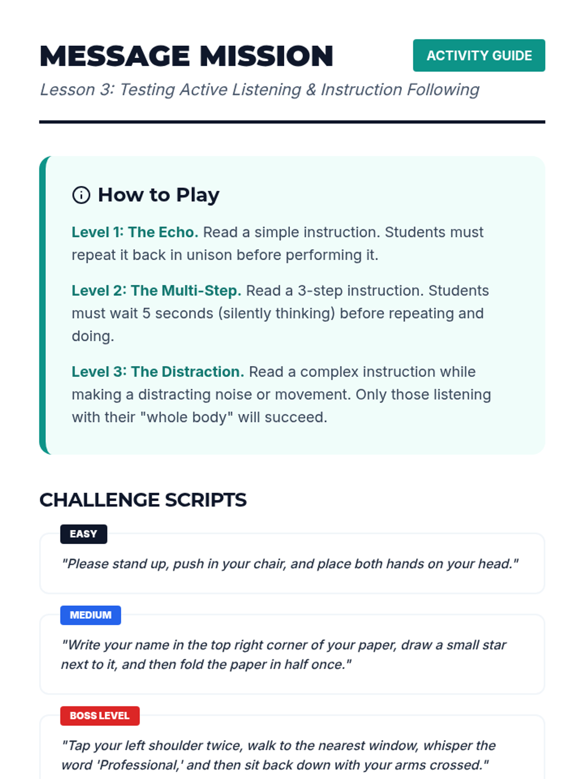 A comprehensive 8-lesson sequence for middle school students to master focus by distinguishing between and managing internal and external distractions. Each 20-minute session provides interactive instruction and practical activities.