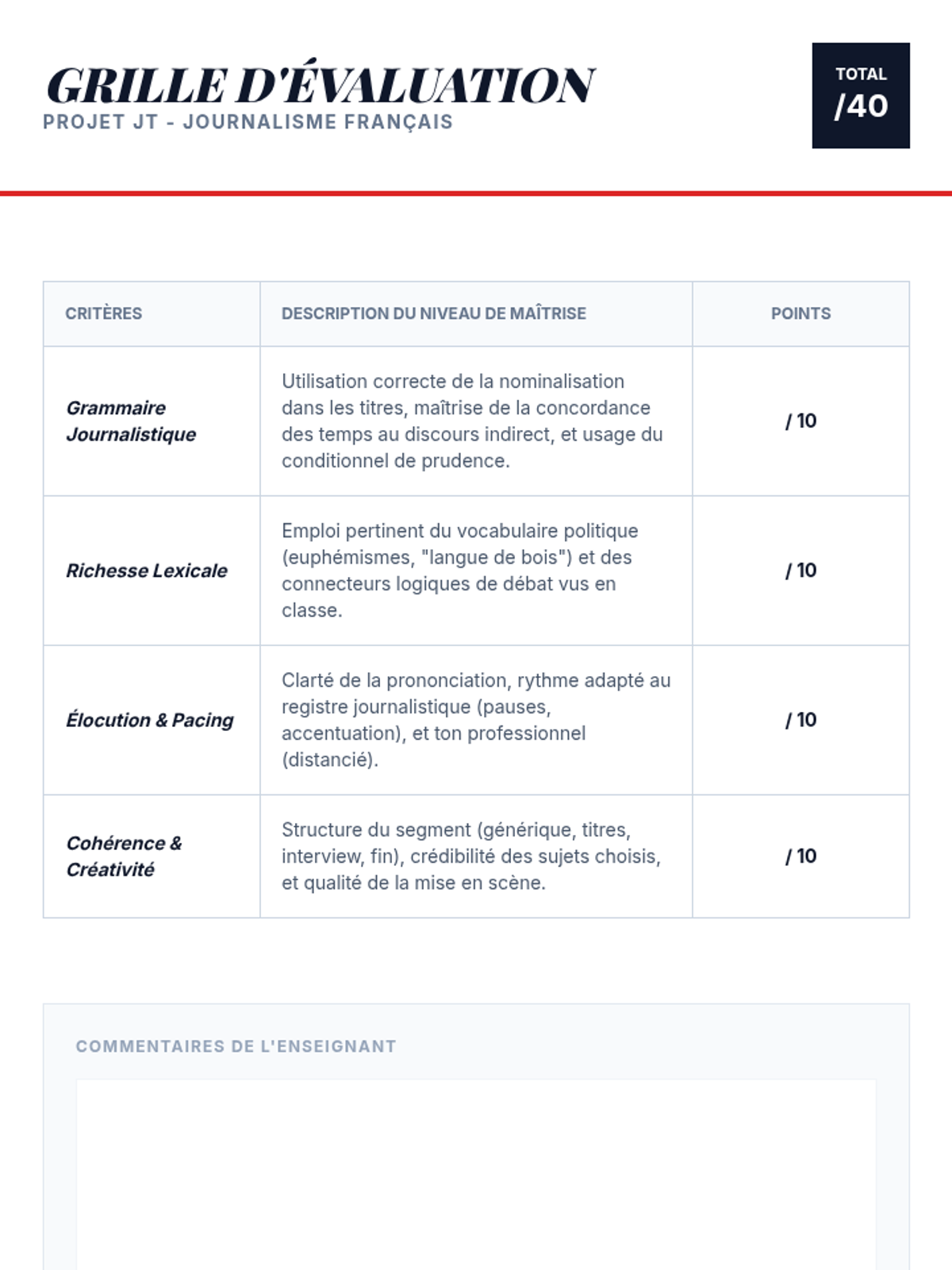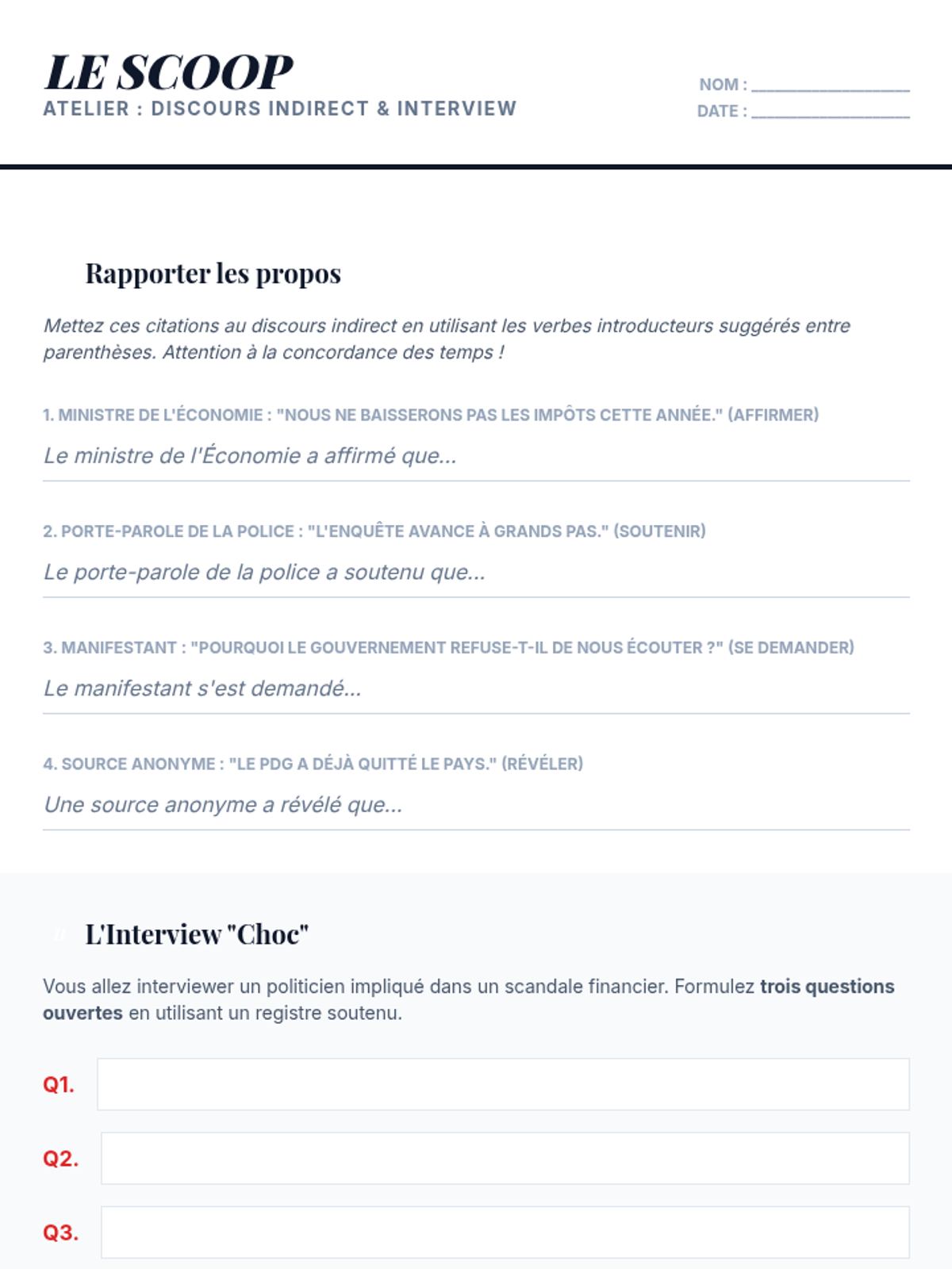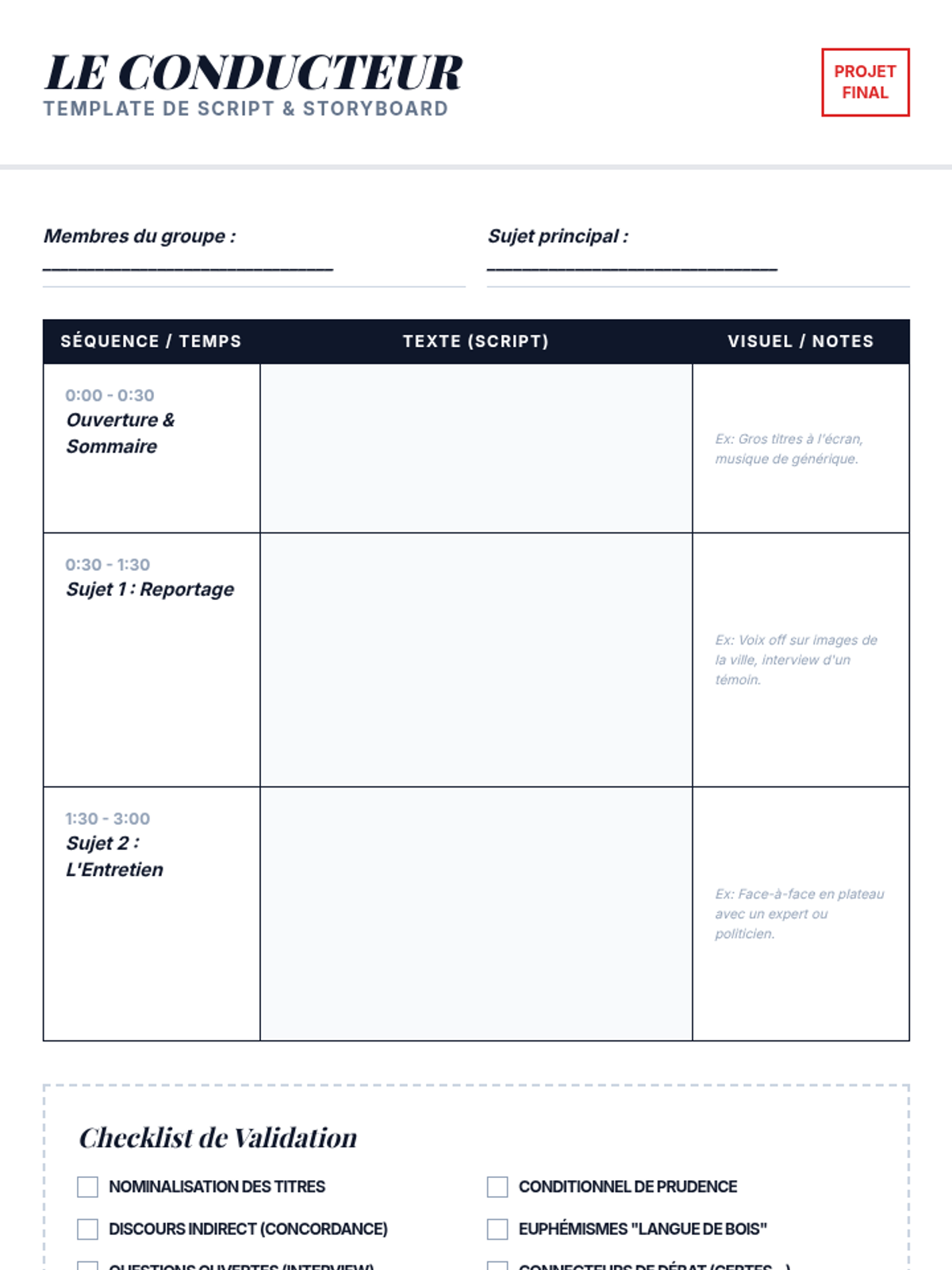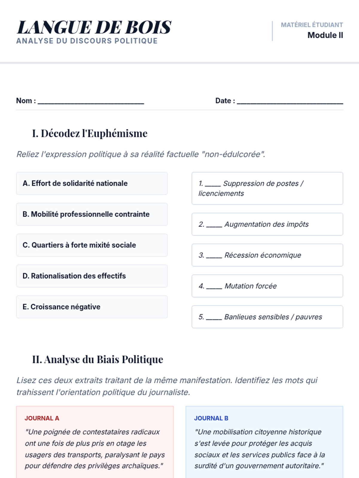 A comprehensive sequence for advanced French students focused on the linguistic nuances of French media, politics, and current affairs. Students explore headline syntax, political euphemisms, debate vocabulary, and reporting techniques, culminating in a news segment project.