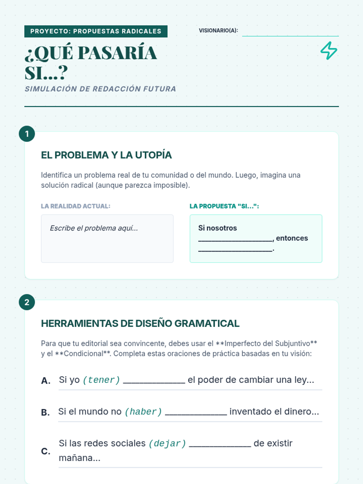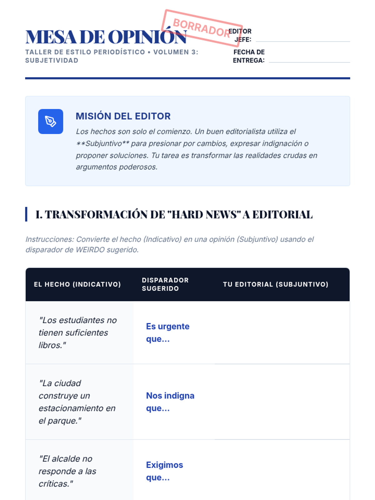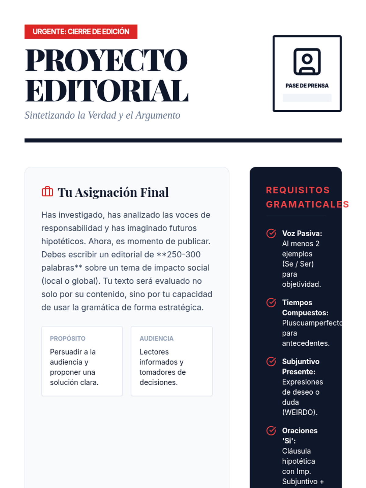 A high-level Spanish grammar sequence for 10th-grade students, focusing on the rhetorical power of verb forms in journalistic writing. Students act as investigative reporters, mastering the passive voice, compound tenses, and the subjunctive mood to produce sophisticated editorial pieces.