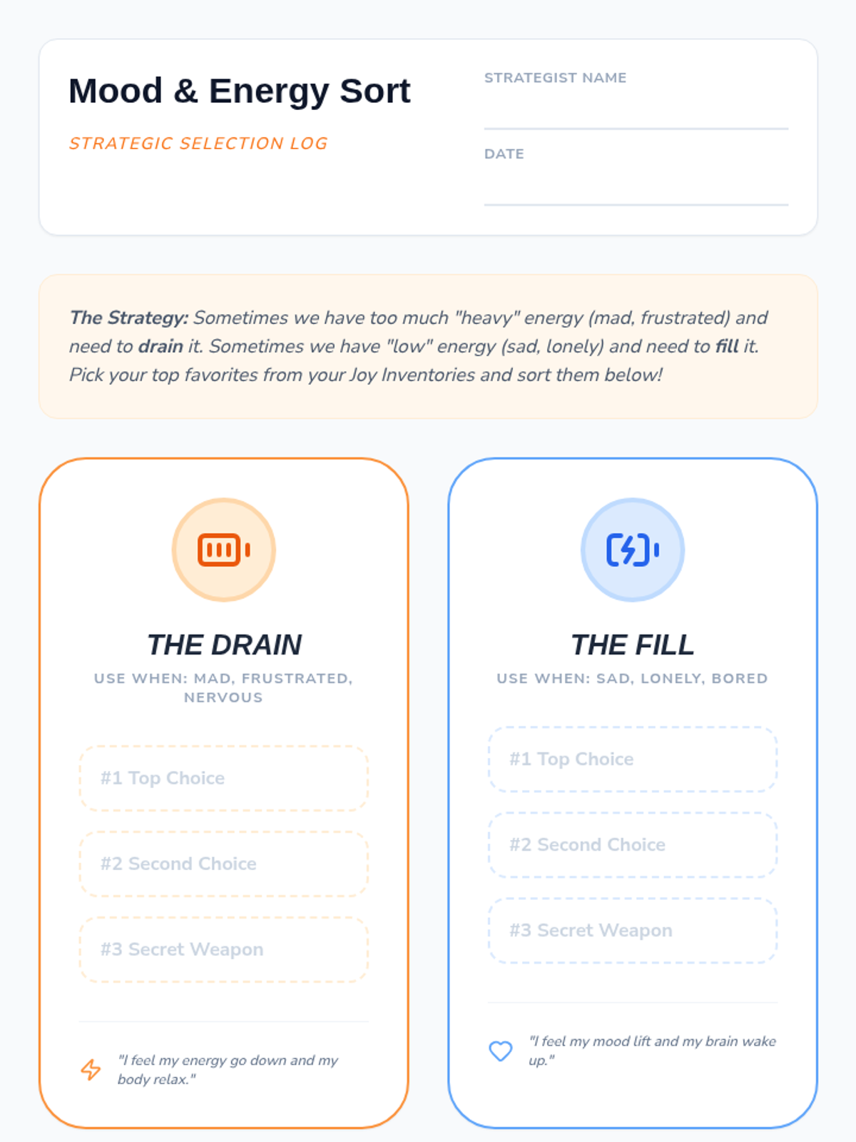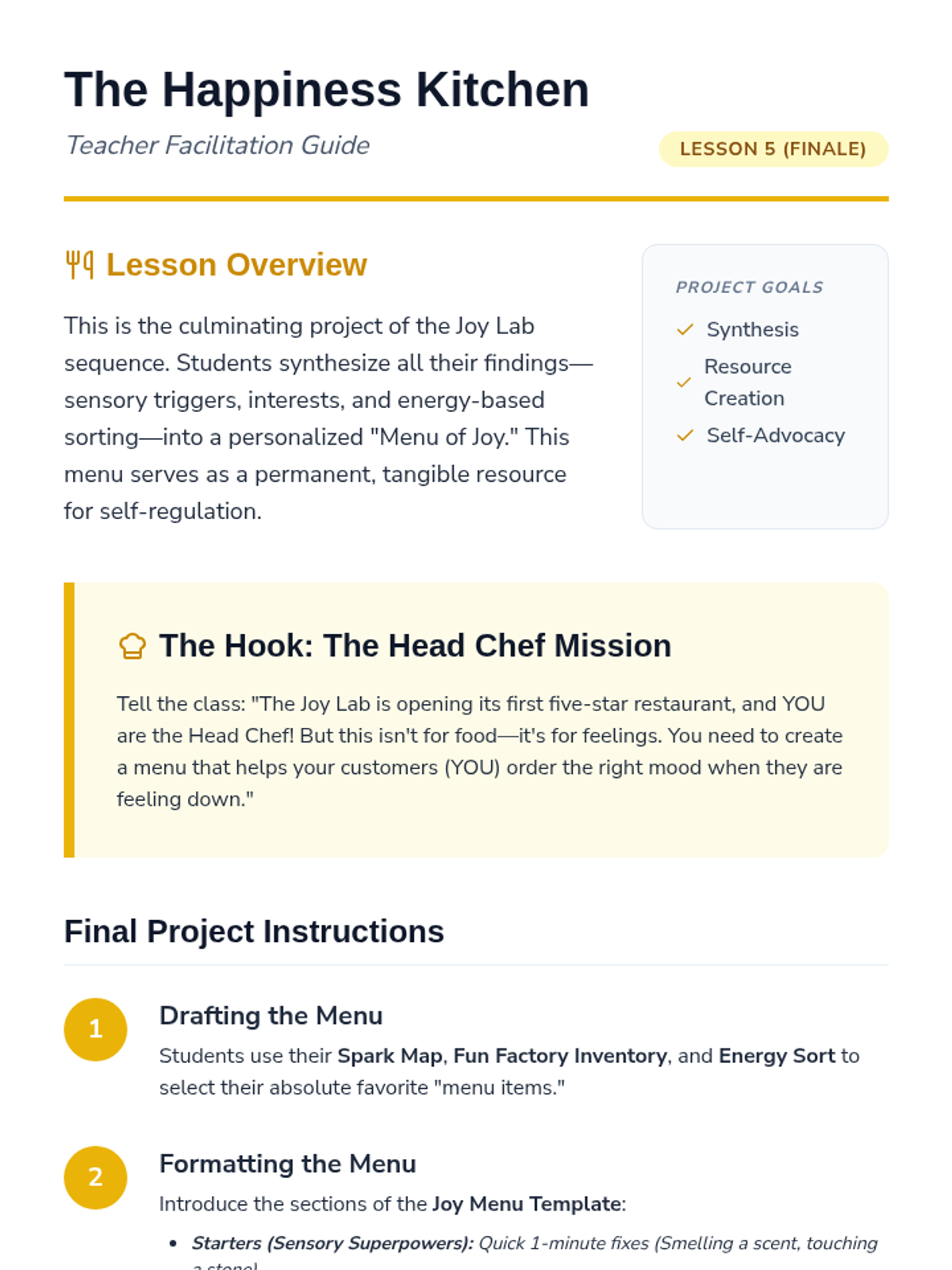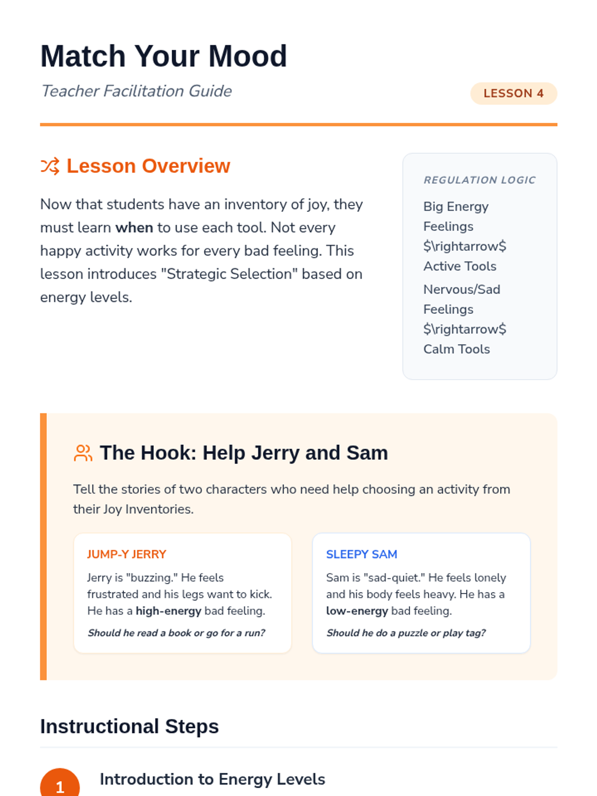 This sequence introduces 3rd-grade students to identifying personal sources of joy and satisfaction. It guides them through recognizing physical emotional shifts, inventorying interests, exploring sensory joy, categorizing activities by energy levels, and creating a personalized 'menu' of coping strategies for emotional regulation.