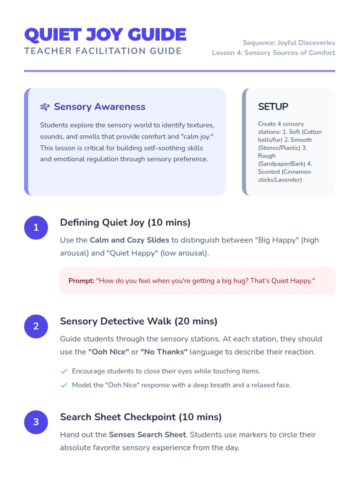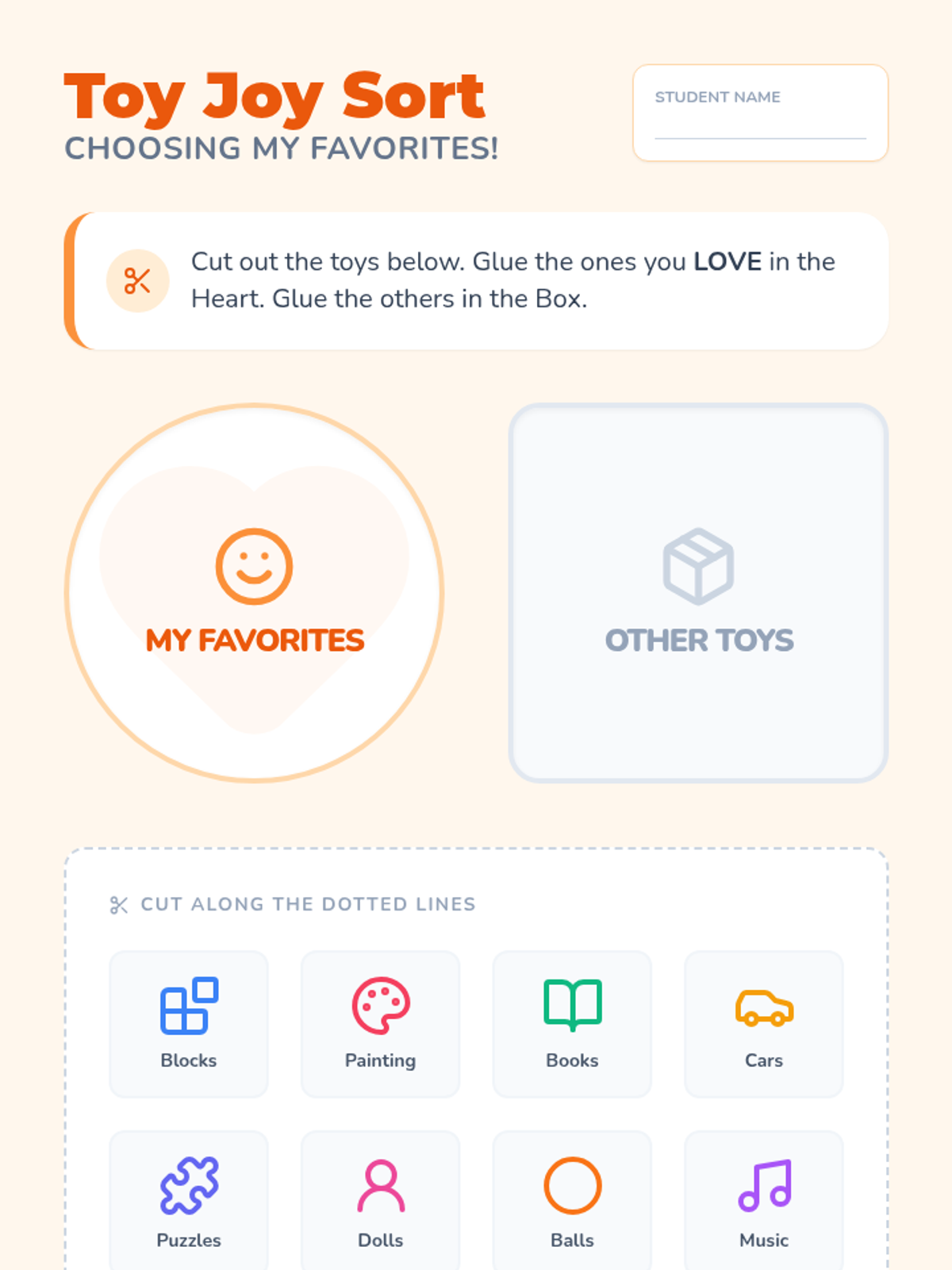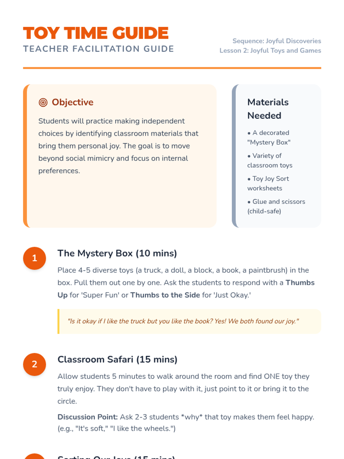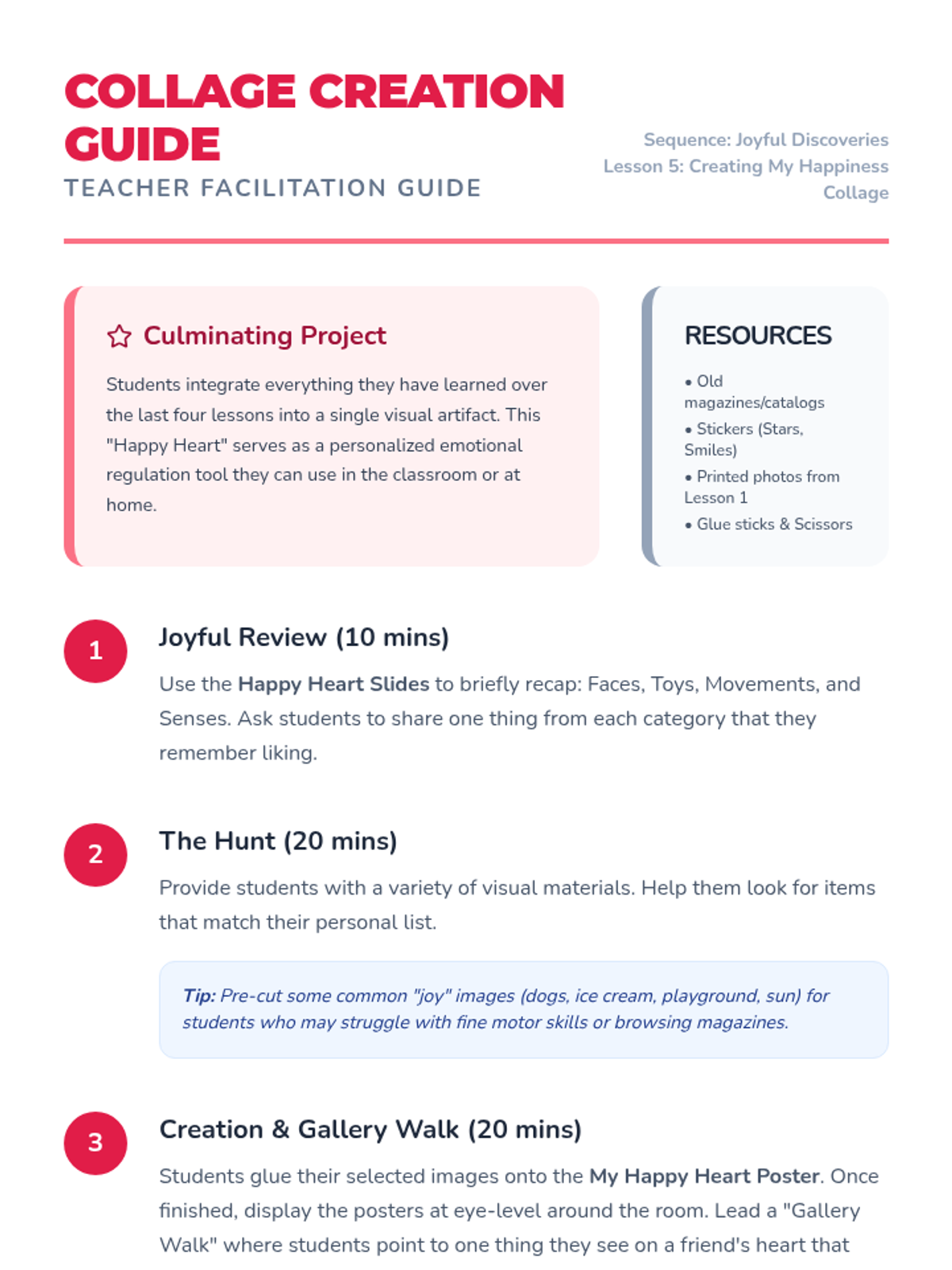 A Pre-K sequence focused on helping young learners identify personal interests and activities that bring them joy, fostering self-awareness and emotional regulation through the creation of a 'Happy List'.
