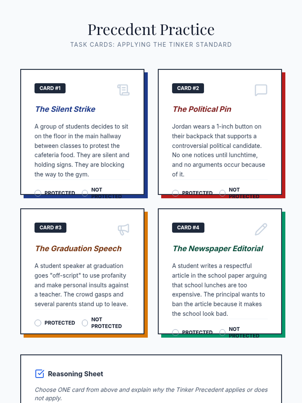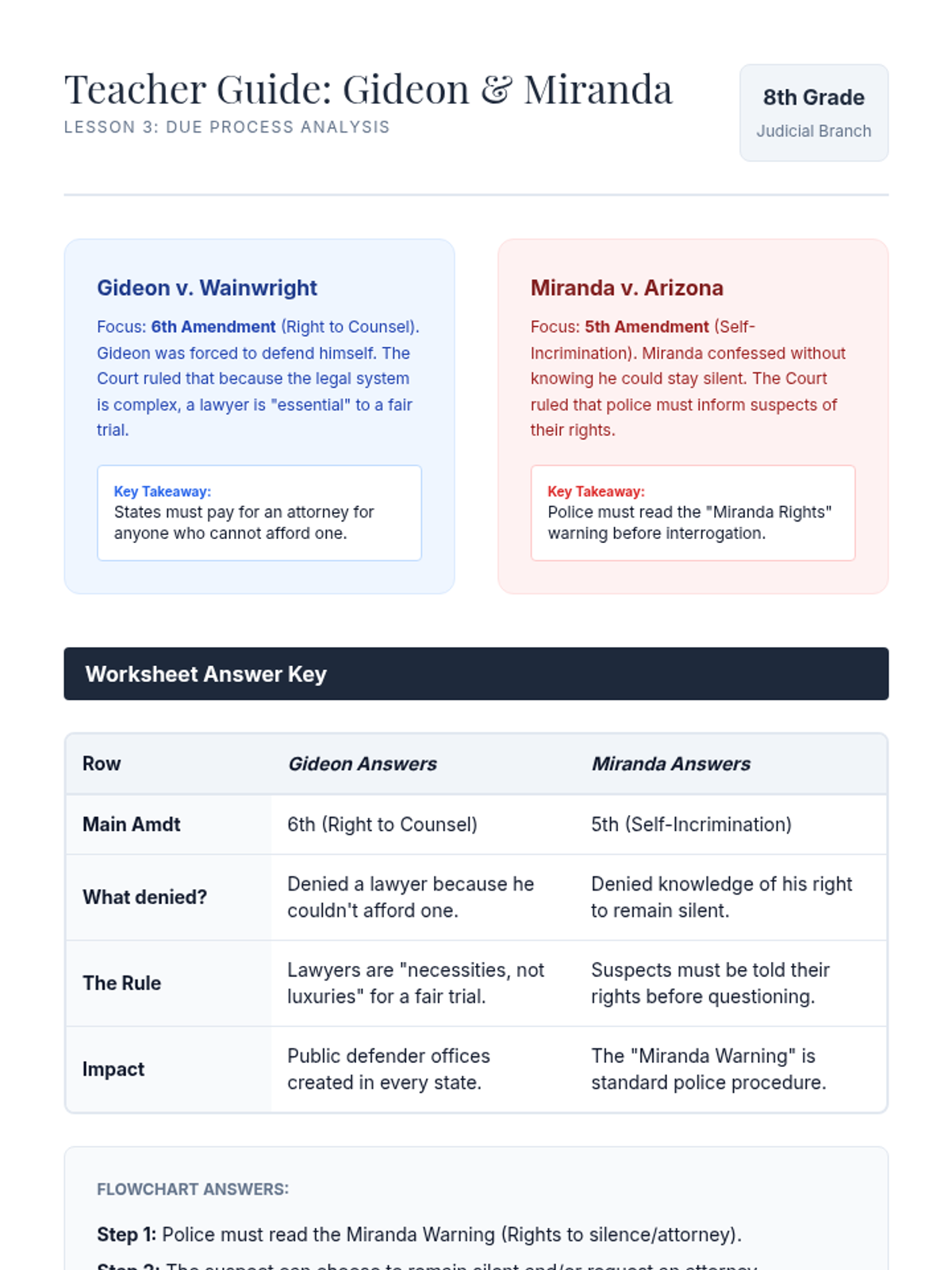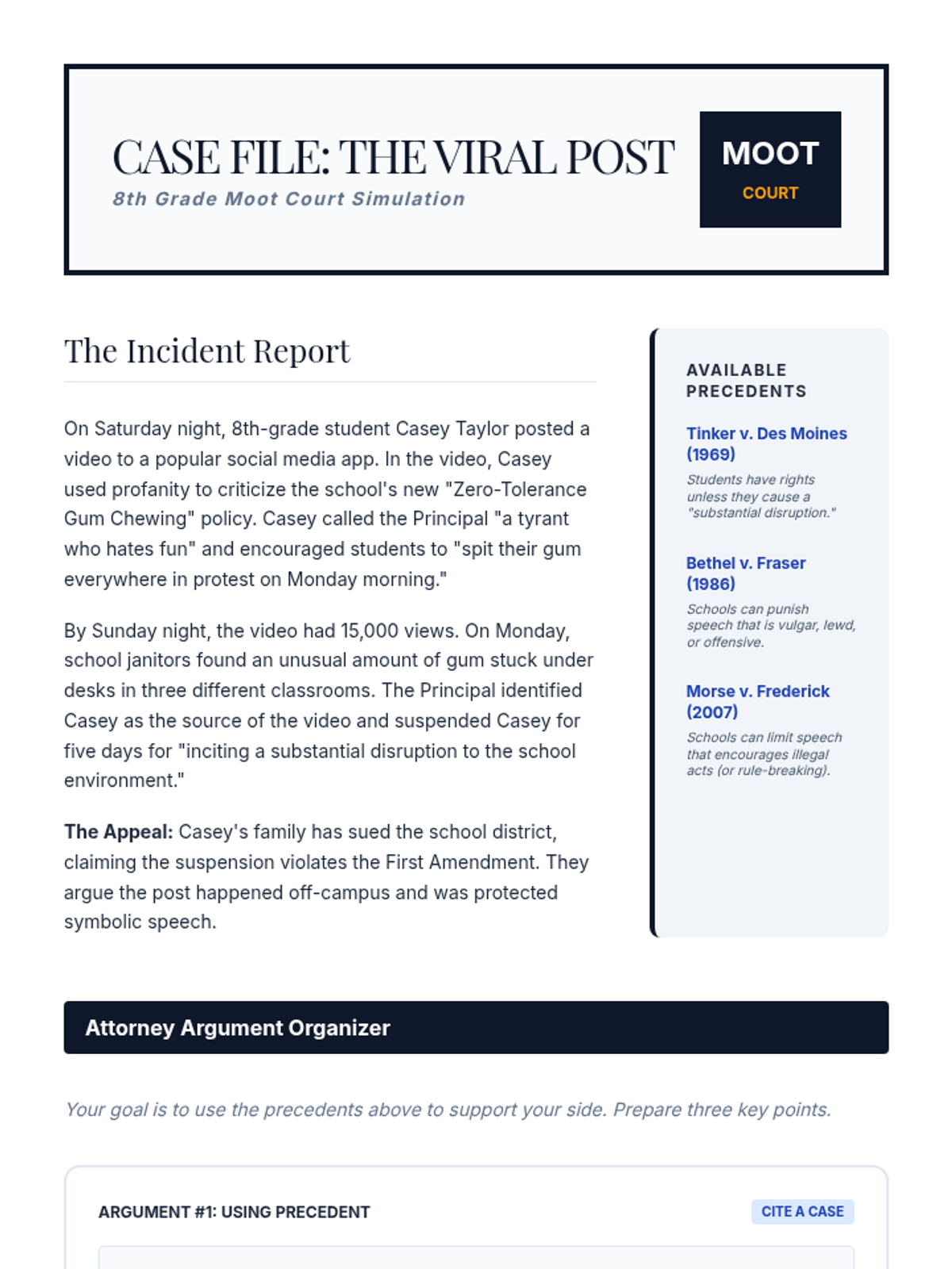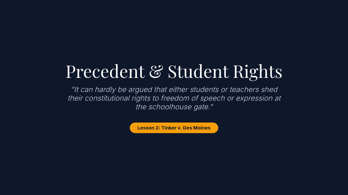 This 8th-grade sequence explores the Judicial Branch through the lens of Supreme Court precedents and constitutional interpretation. Students move from deconstructing legal opinions to applying precedent in a moot court simulation, focusing on landmark cases like Tinker, Gideon, and Miranda to understand how the Constitution adapts to a changing society.