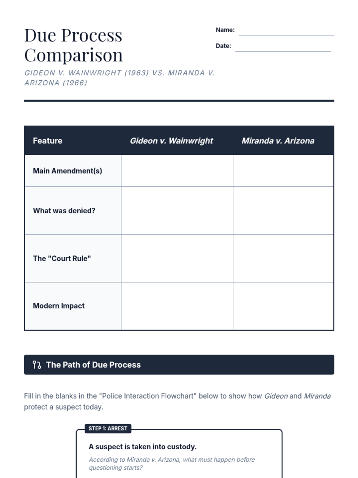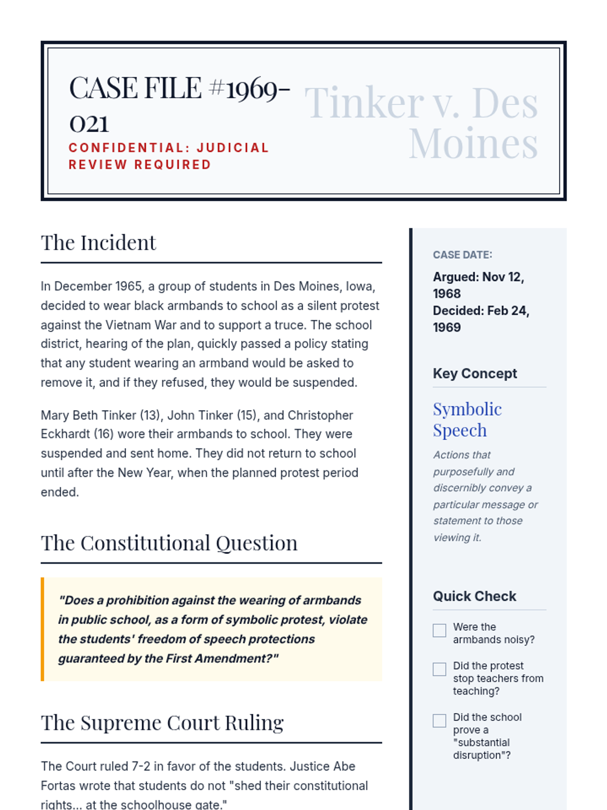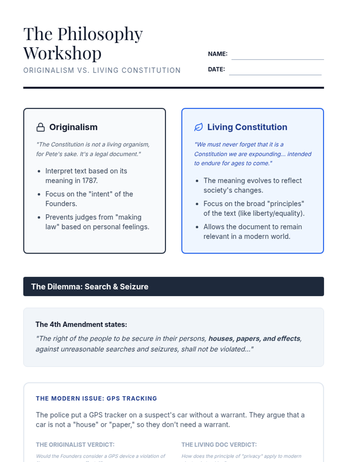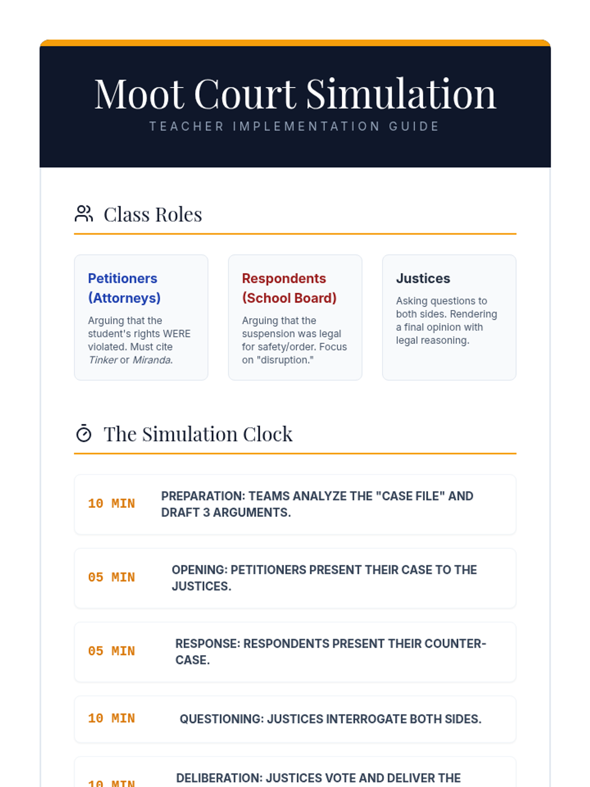 This 8th-grade sequence explores the Judicial Branch through the lens of Supreme Court precedents and constitutional interpretation. Students move from deconstructing legal opinions to applying precedent in a moot court simulation, focusing on landmark cases like Tinker, Gideon, and Miranda to understand how the Constitution adapts to a changing society.