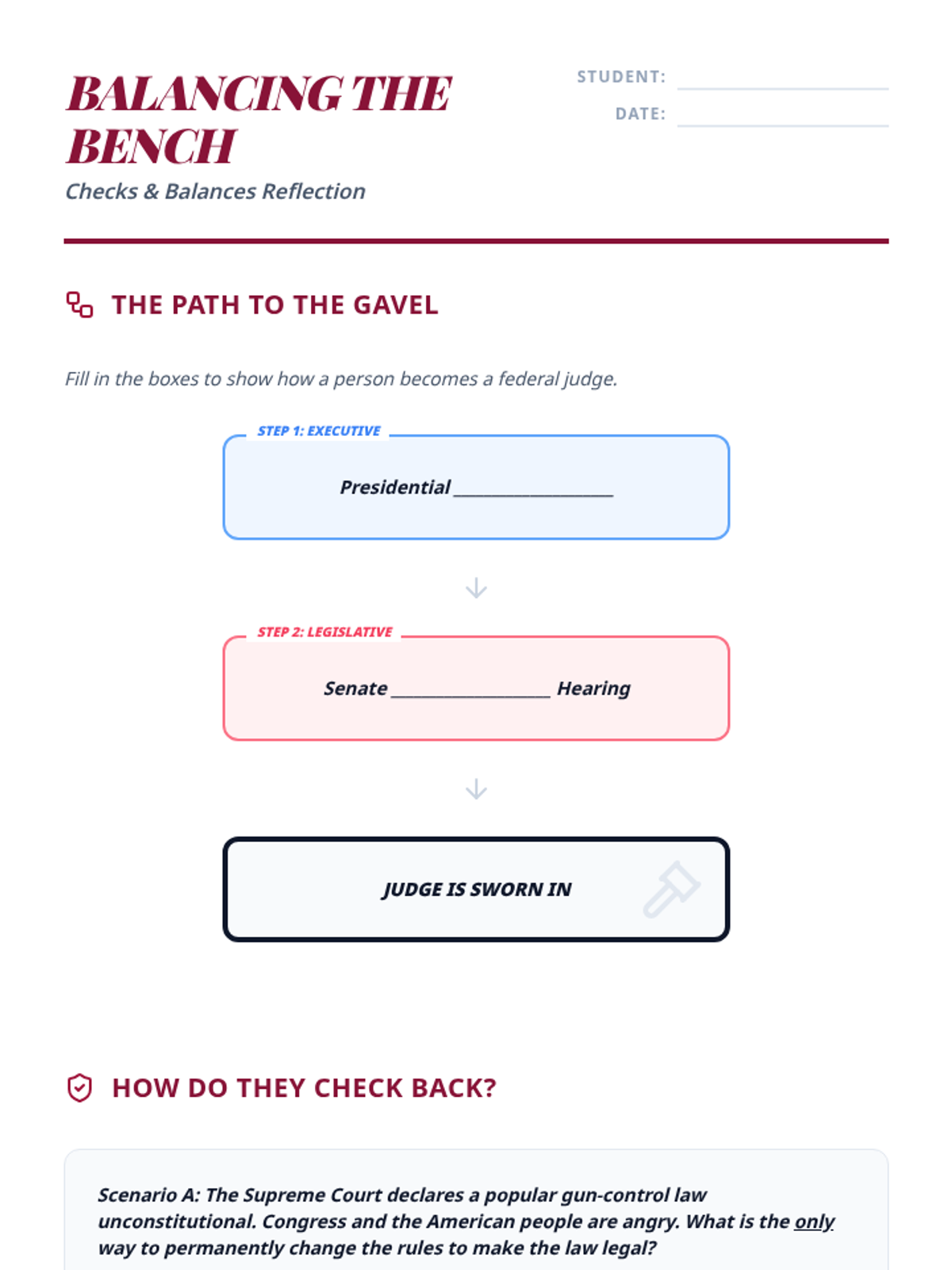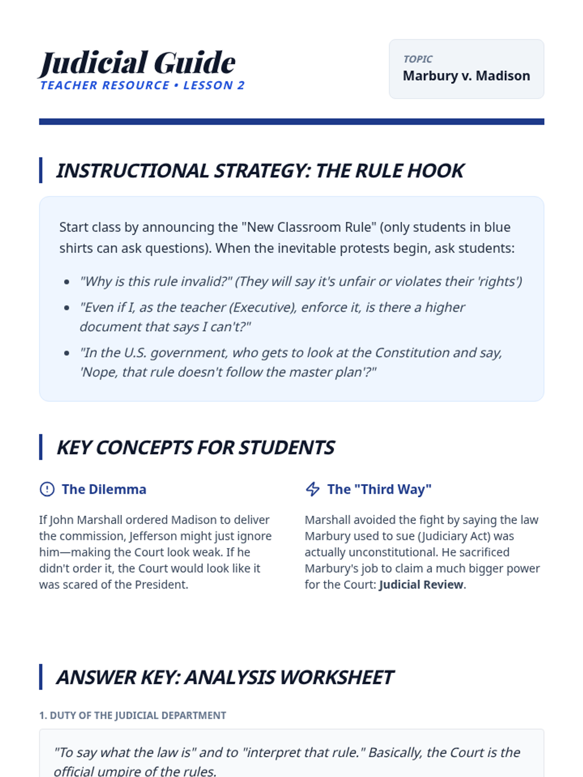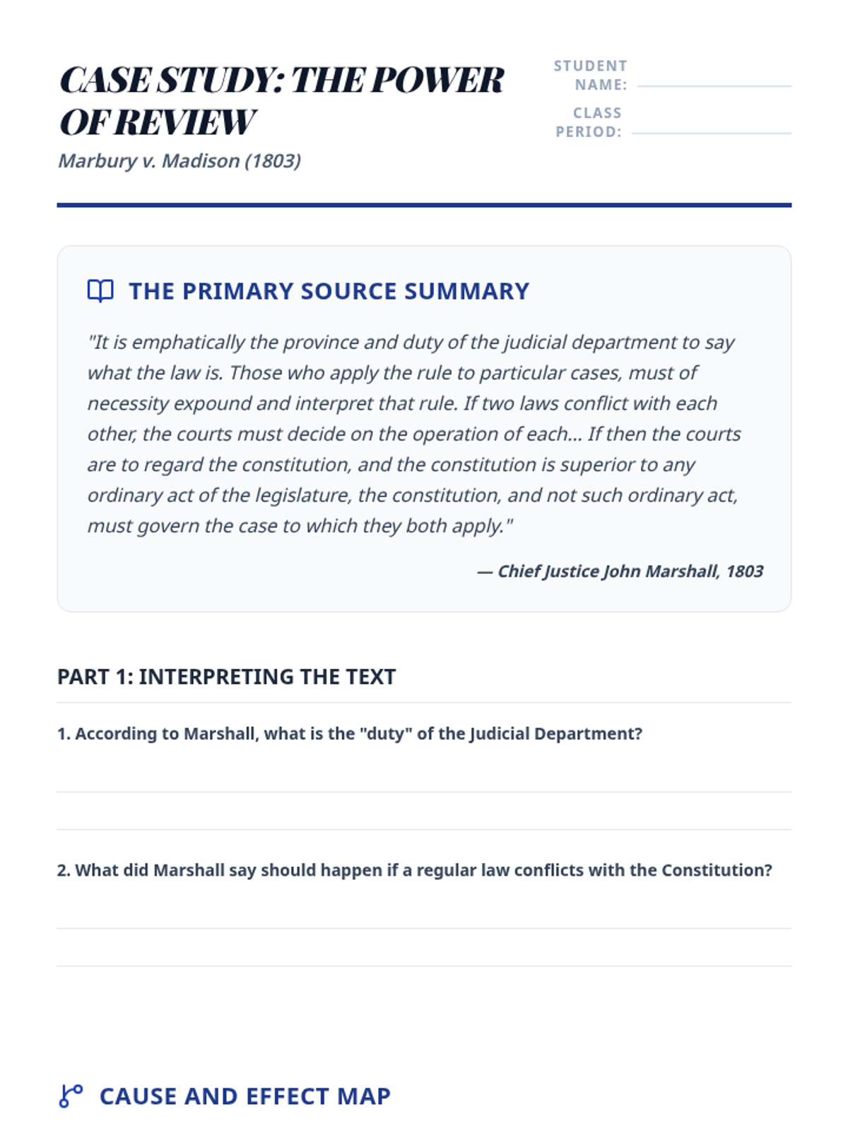 This sequence introduces 8th-grade students to the structure, function, and power of the American judicial system. Students explore the hierarchy of courts, the landmark power of judicial review established in *Marbury v. Madison*, and the rigorous process cases undergo to reach the Supreme Court, concluding with an analysis of the checks and balances that govern the judiciary.