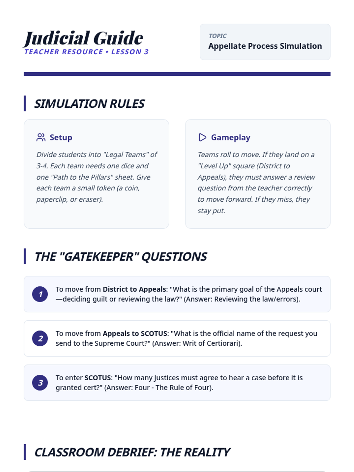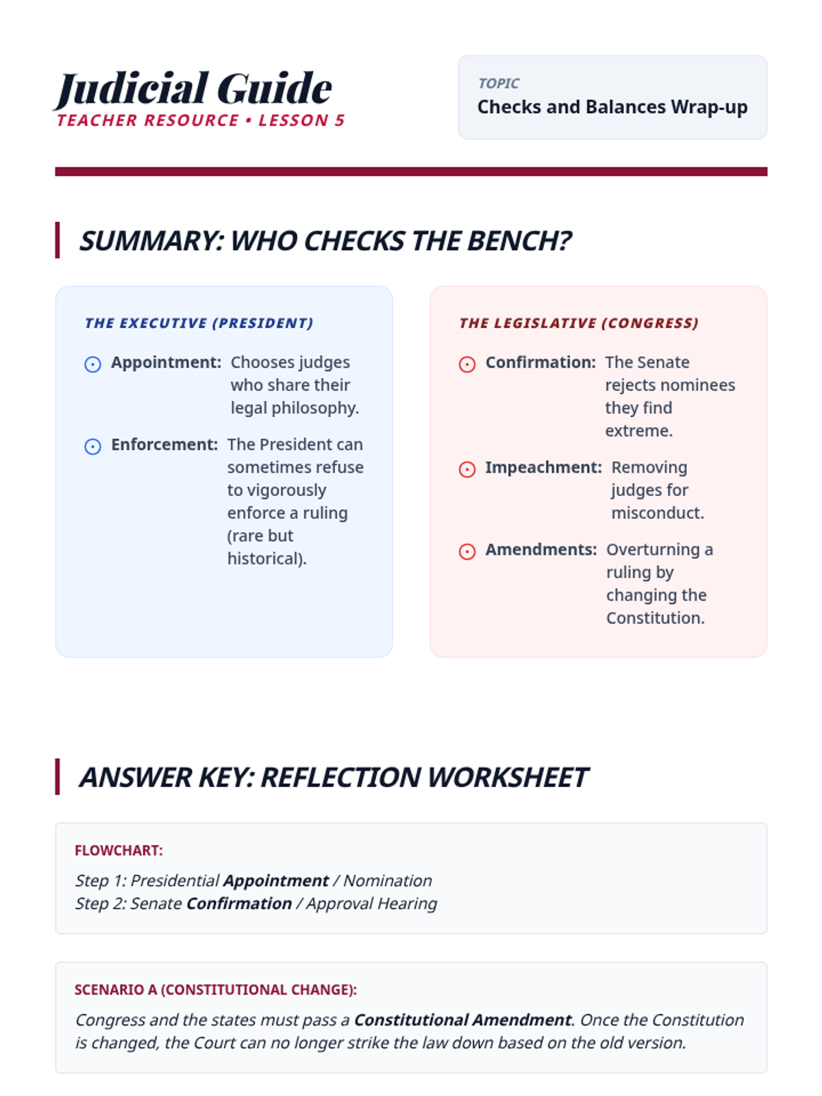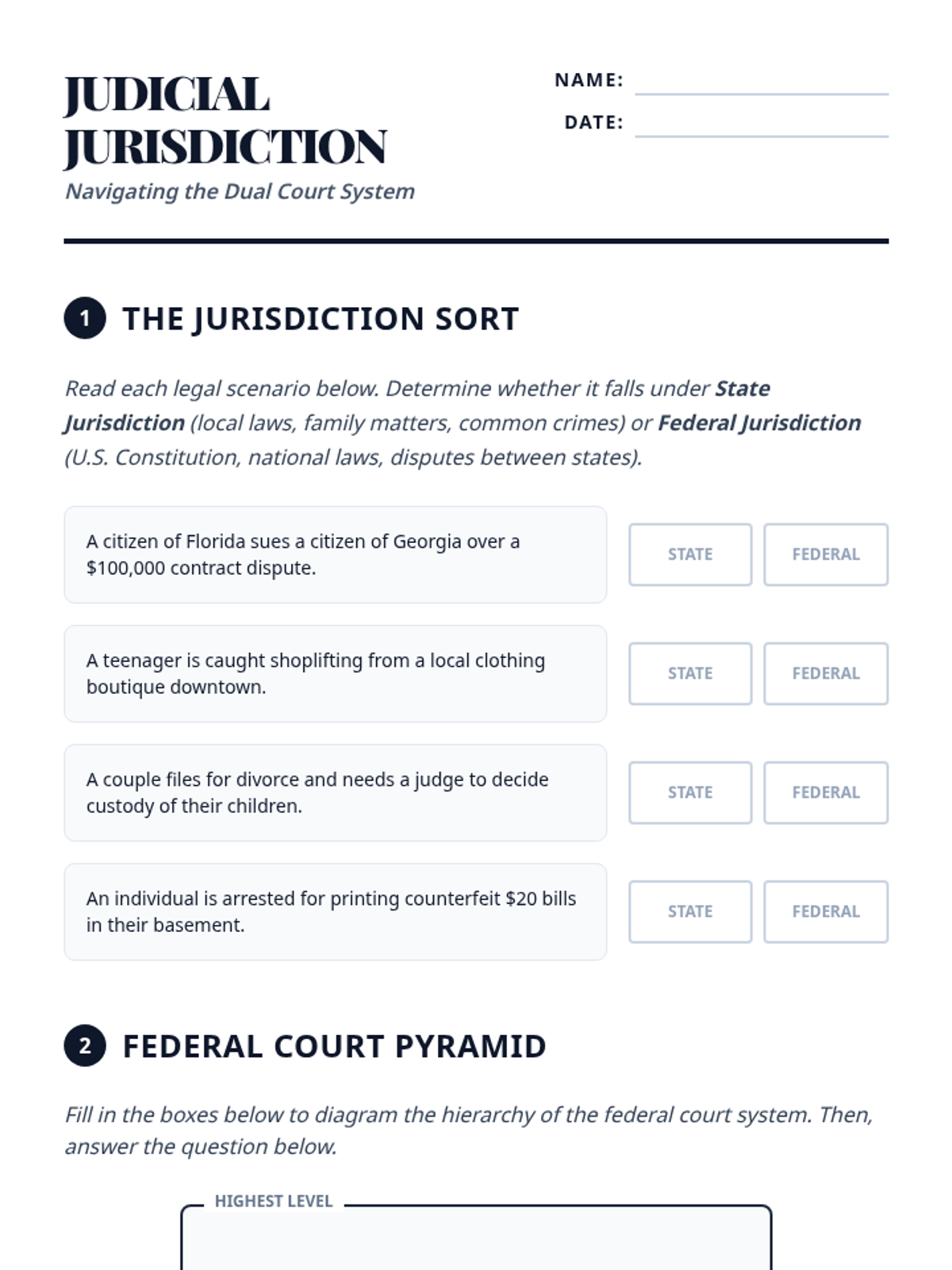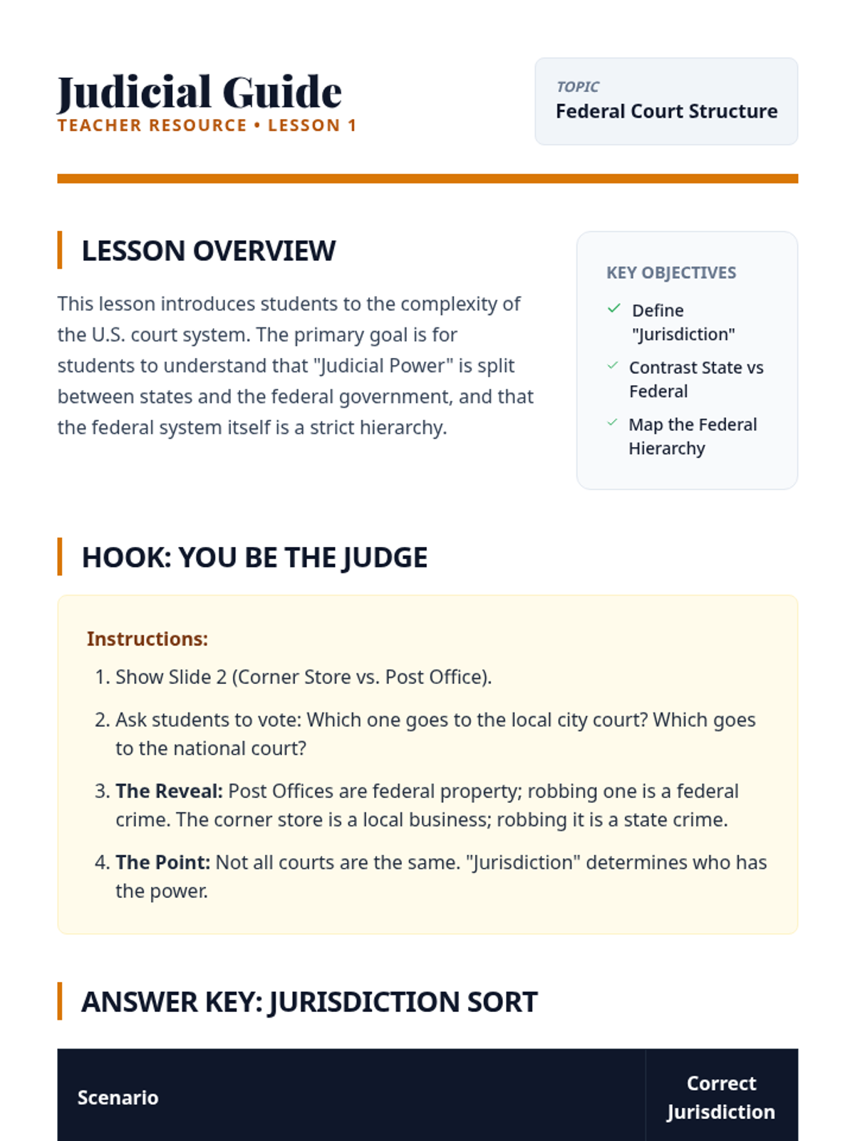 This sequence introduces 8th-grade students to the structure, function, and power of the American judicial system. Students explore the hierarchy of courts, the landmark power of judicial review established in *Marbury v. Madison*, and the rigorous process cases undergo to reach the Supreme Court, concluding with an analysis of the checks and balances that govern the judiciary.