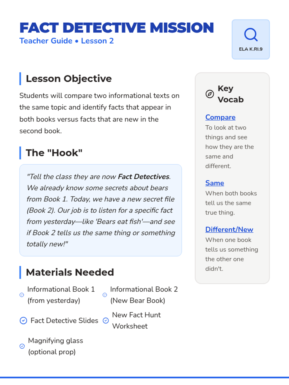A Kindergarten ELA sequence focused on comparing and contrasting informational texts through the lens of animal science. Students explore facts, features, and habitats across multiple texts to build foundational reading comprehension skills.