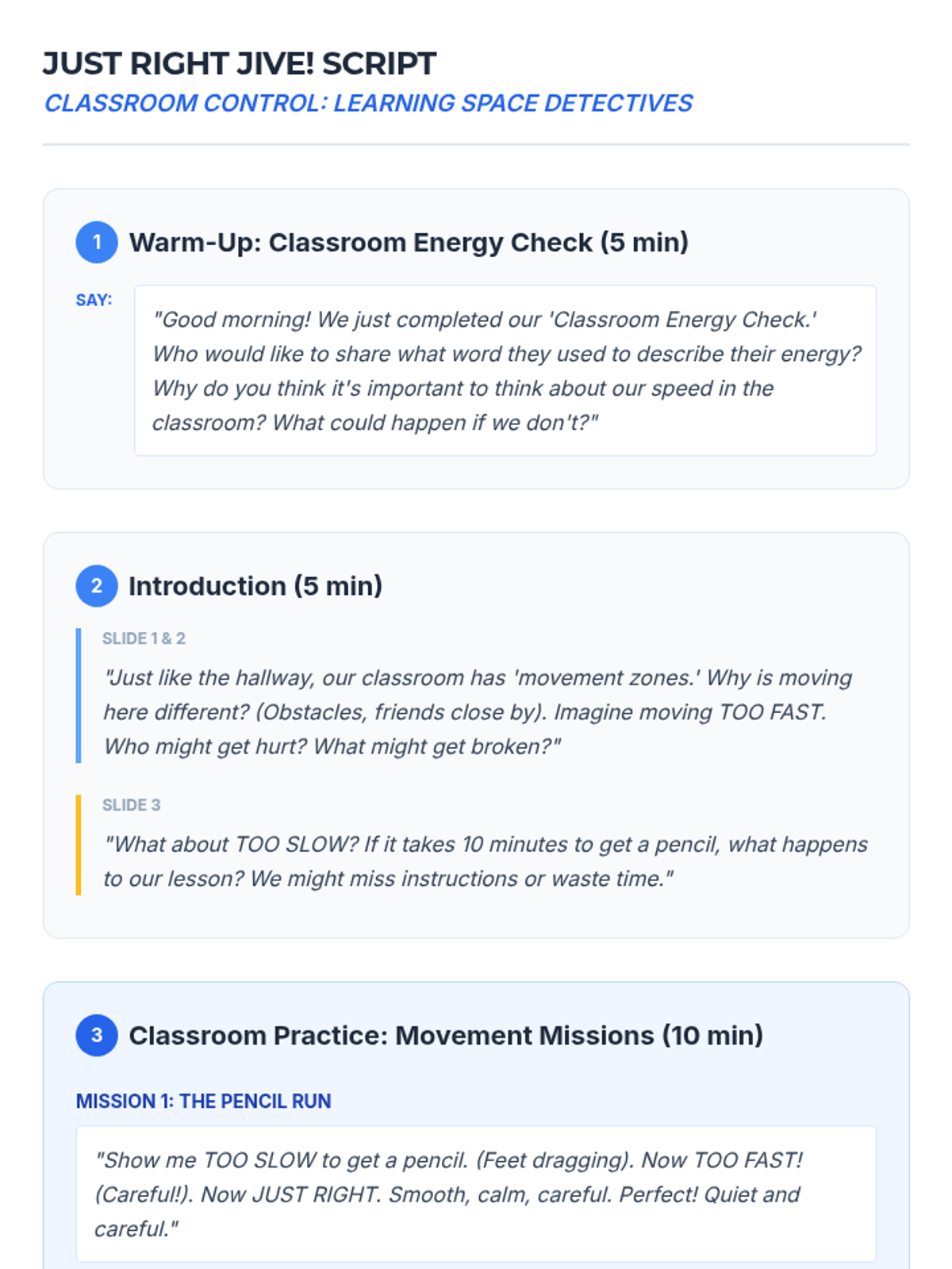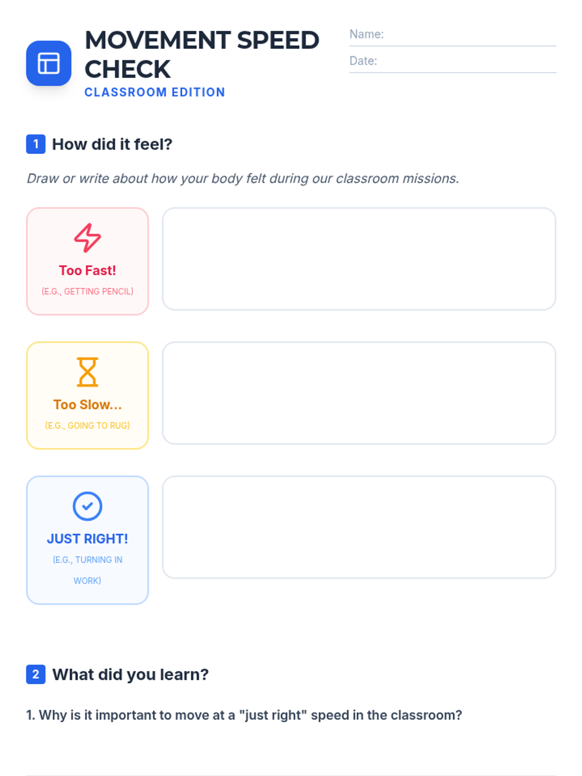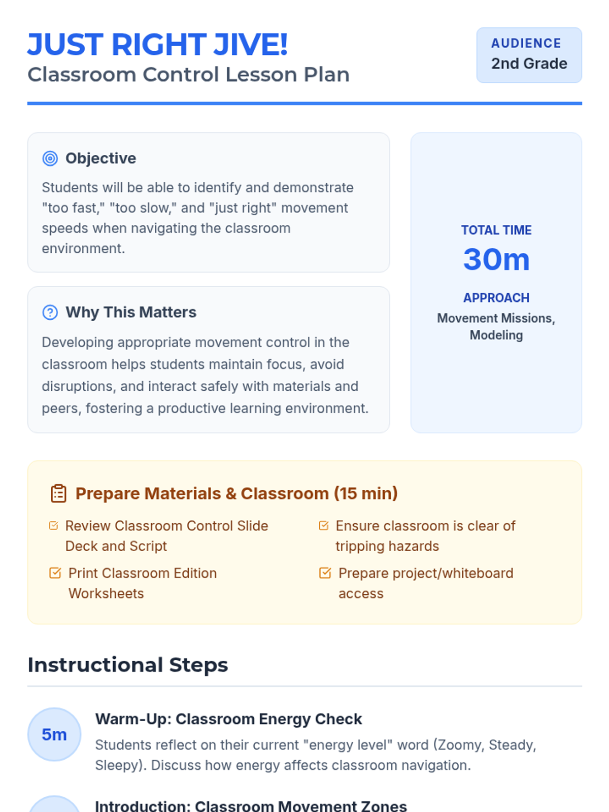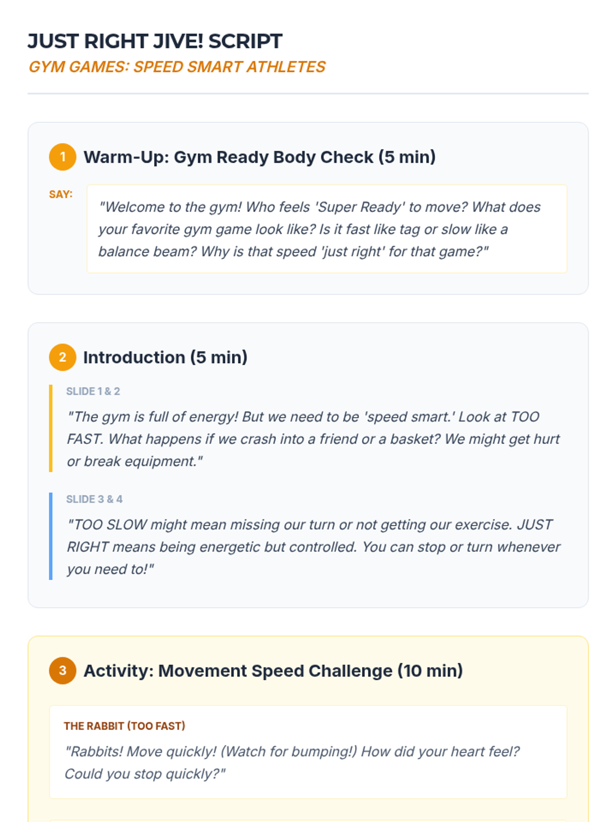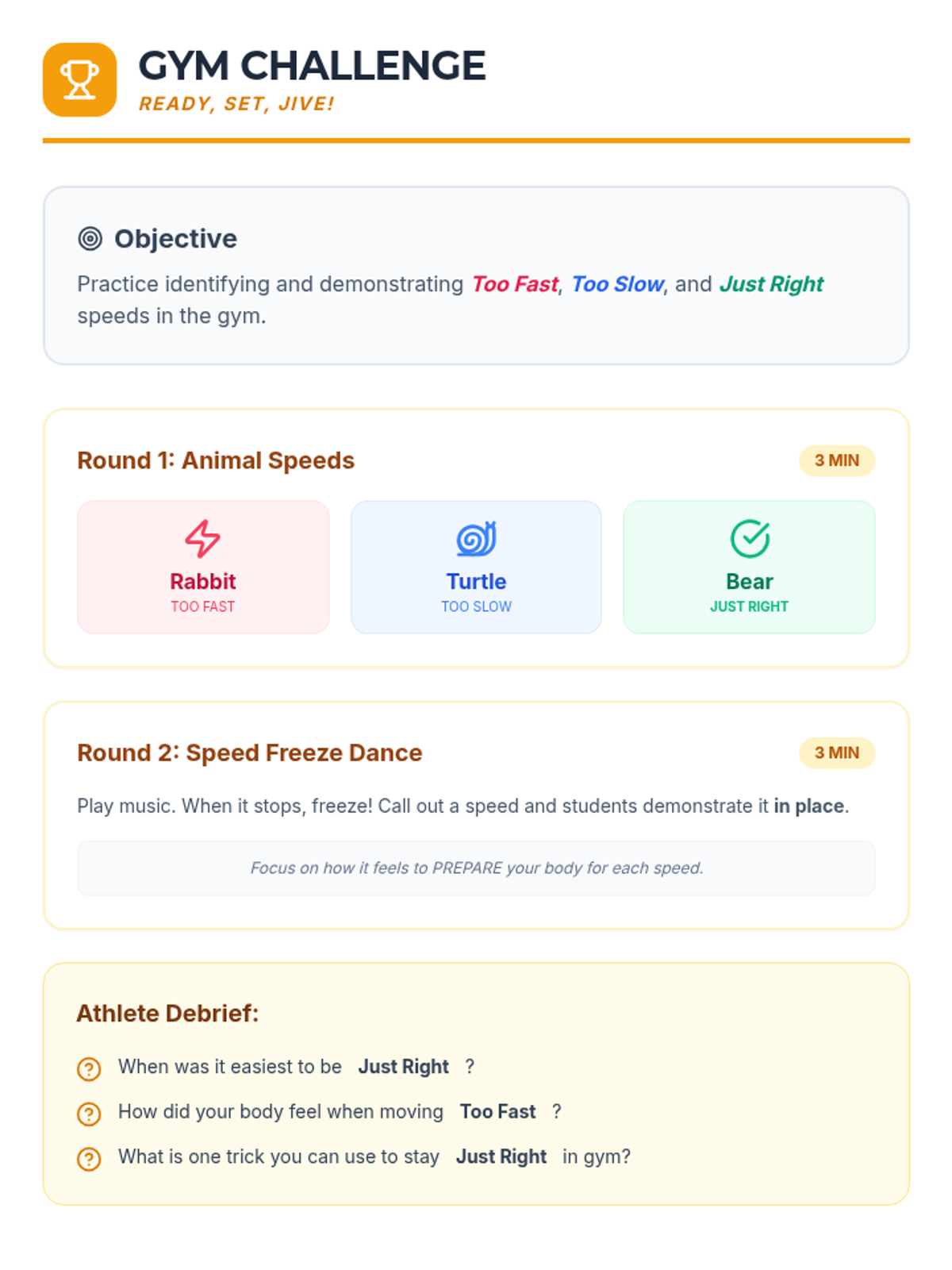 A comprehensive movement awareness sequence for 2nd-grade students, focusing on identifying and practicing appropriate speeds (too fast, too slow, and just right) across various school environments including hallways, classrooms, gyms, bathrooms, and counseling rooms.