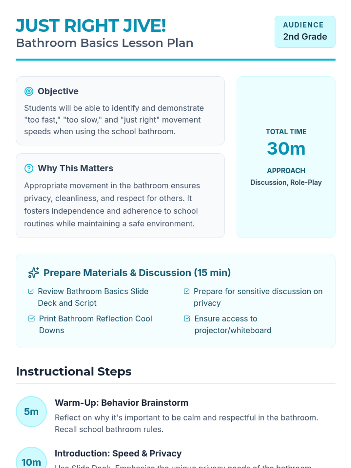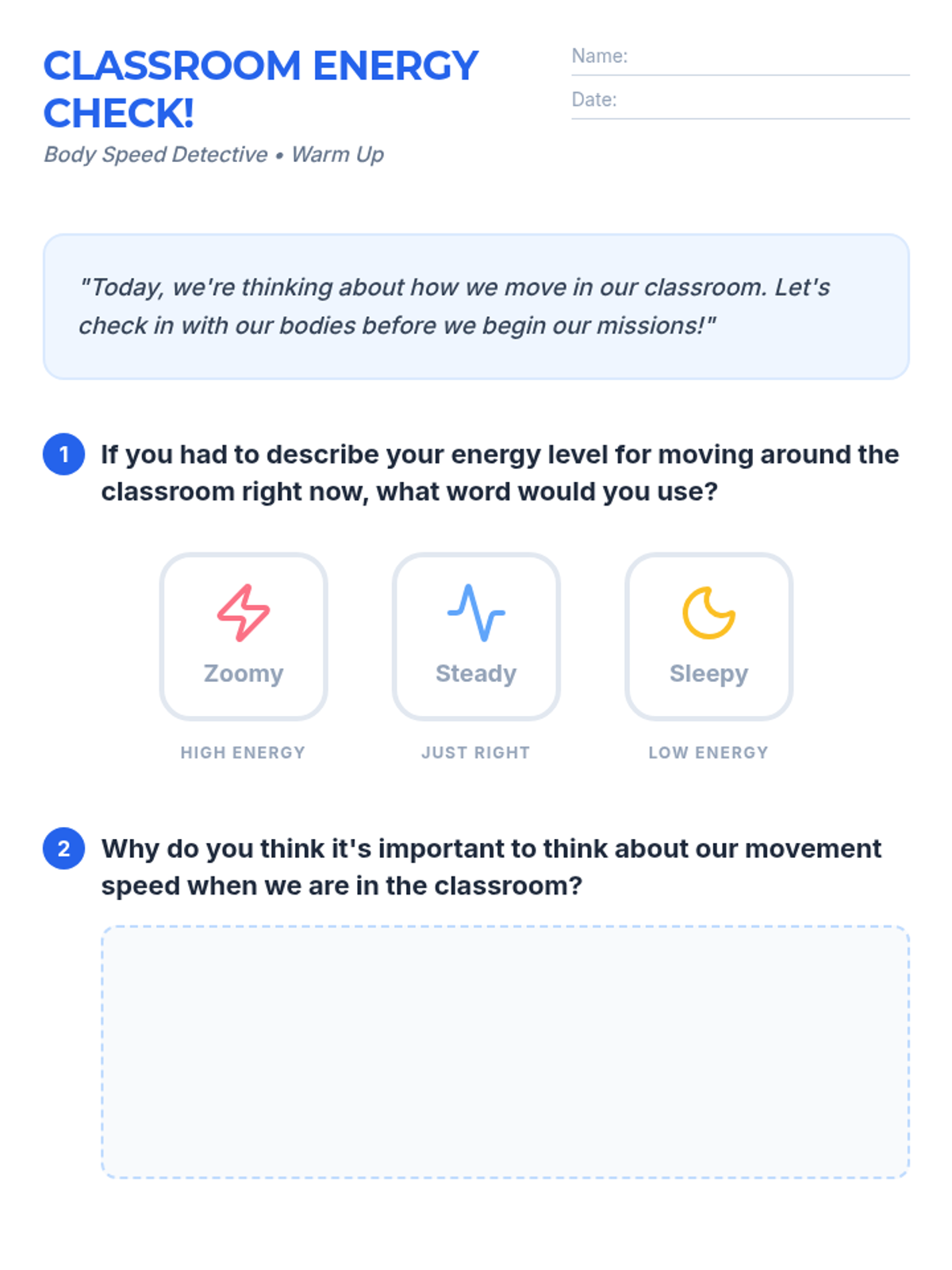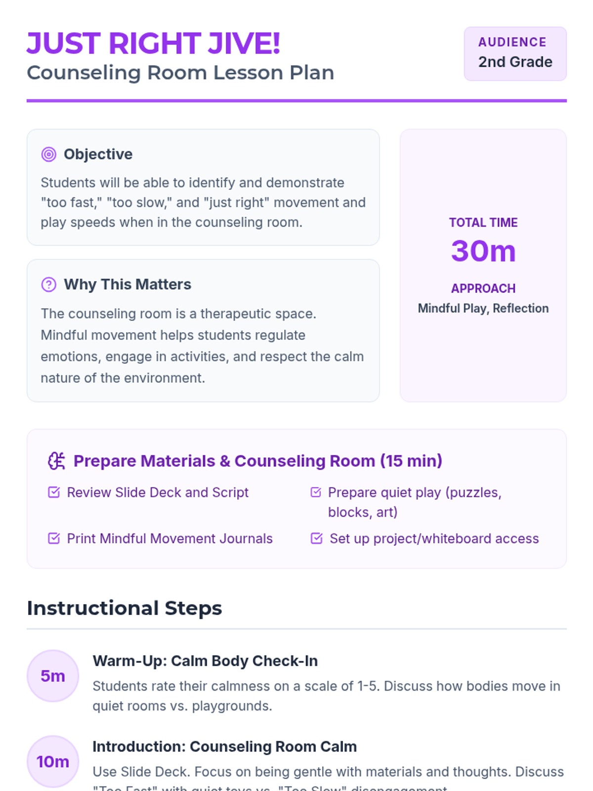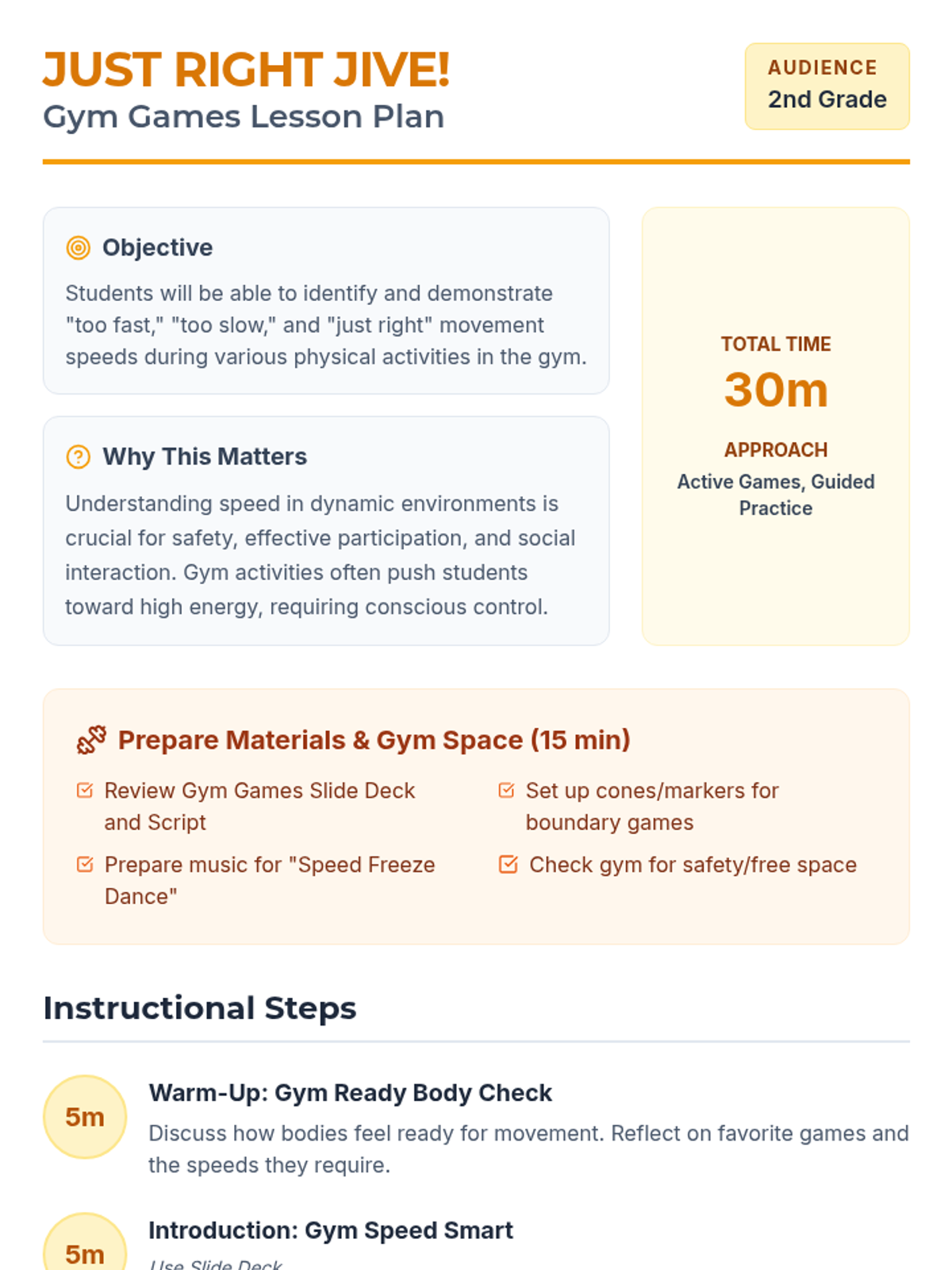A comprehensive movement awareness sequence for 2nd-grade students, focusing on identifying and practicing appropriate speeds (too fast, too slow, and just right) across various school environments including hallways, classrooms, gyms, bathrooms, and counseling rooms.