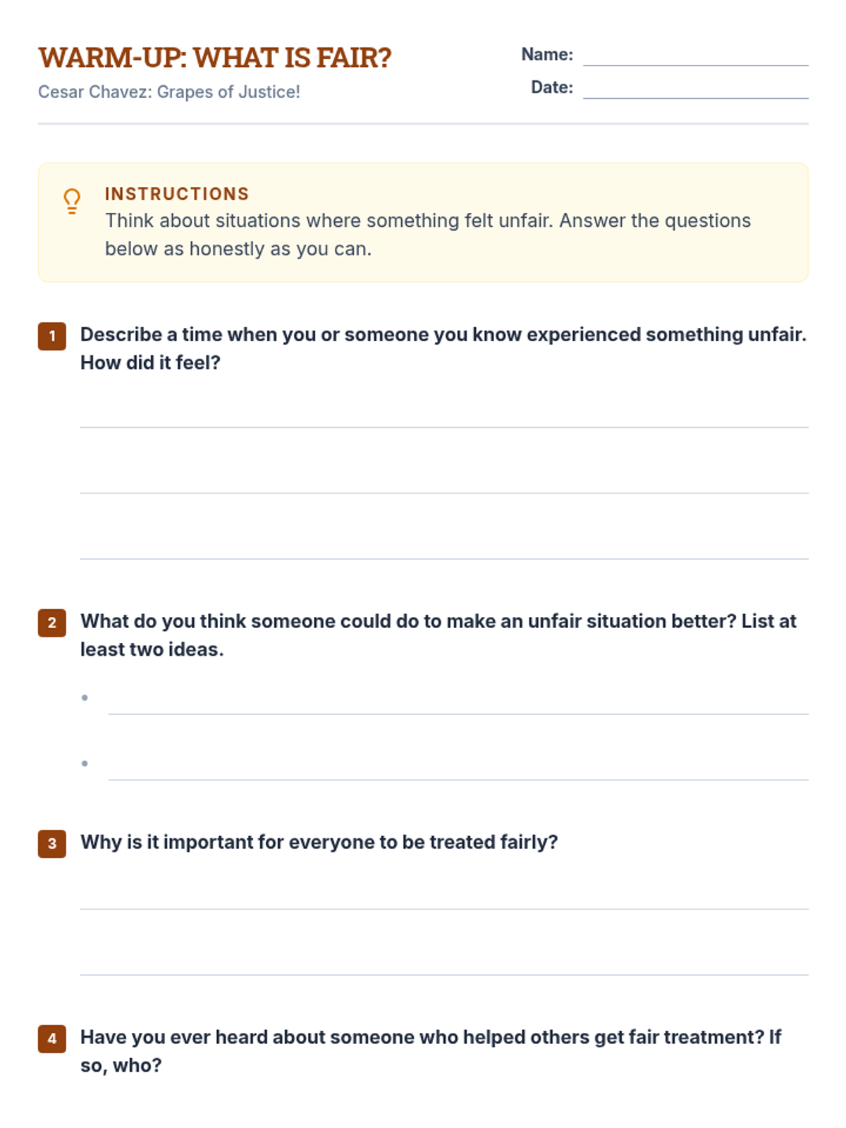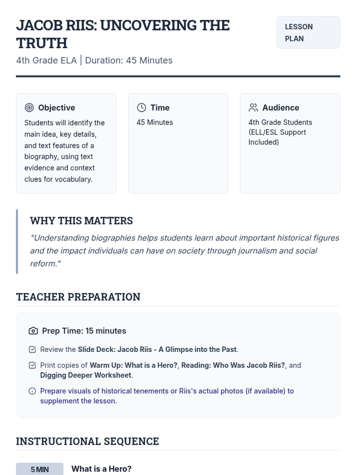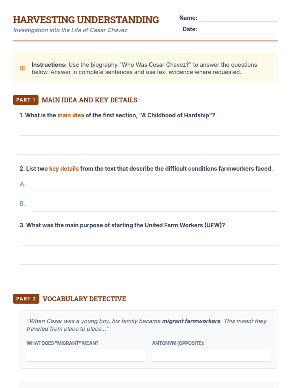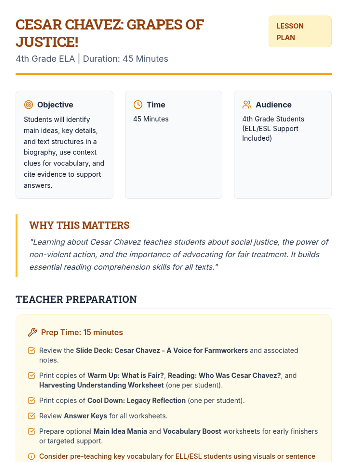 A comprehensive 4th-grade unit combining ELA biography studies on Cesar Chavez and Jacob Riis with a foundational math lesson on comparing fractions. Students explore social justice and investigative journalism while mastering main ideas, text structures, and fraction comparison strategies.