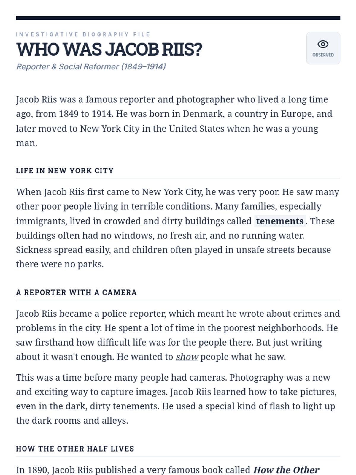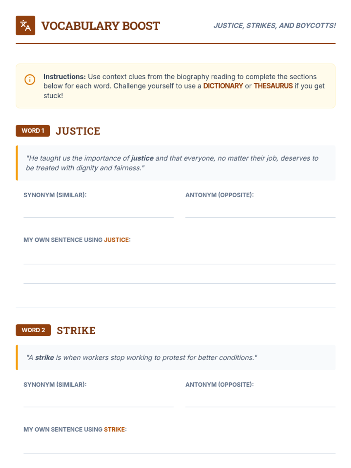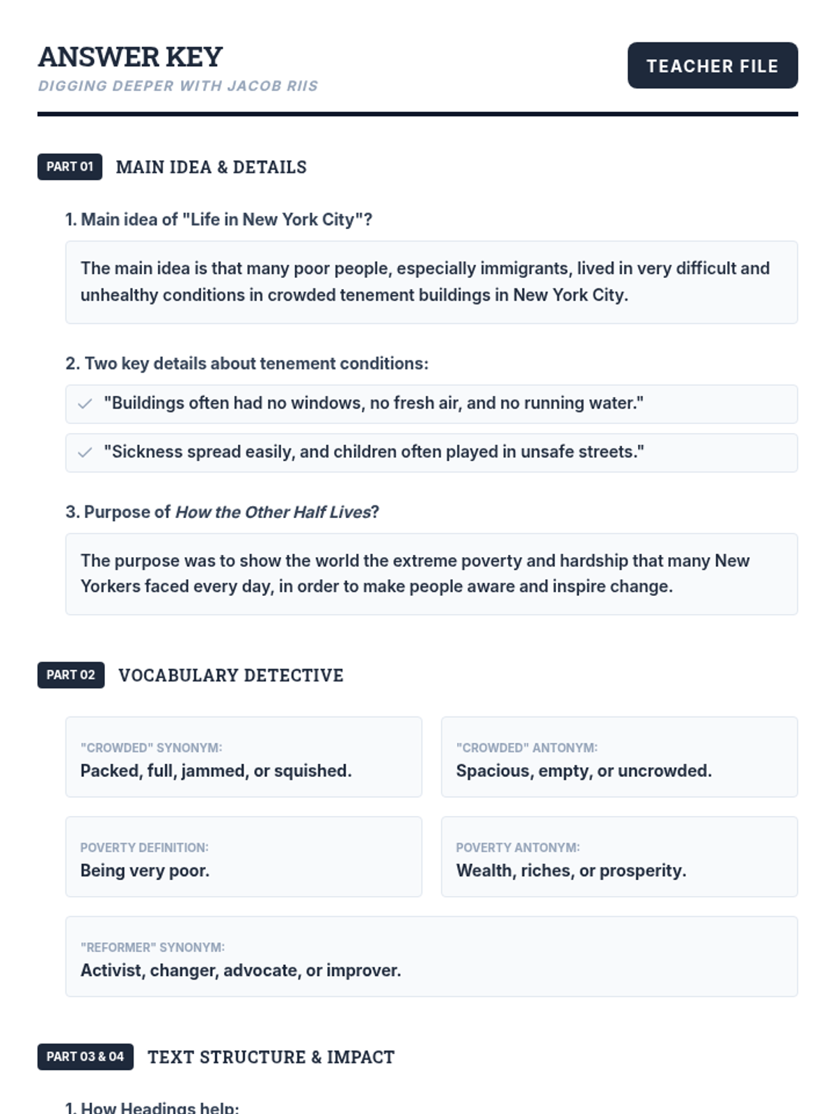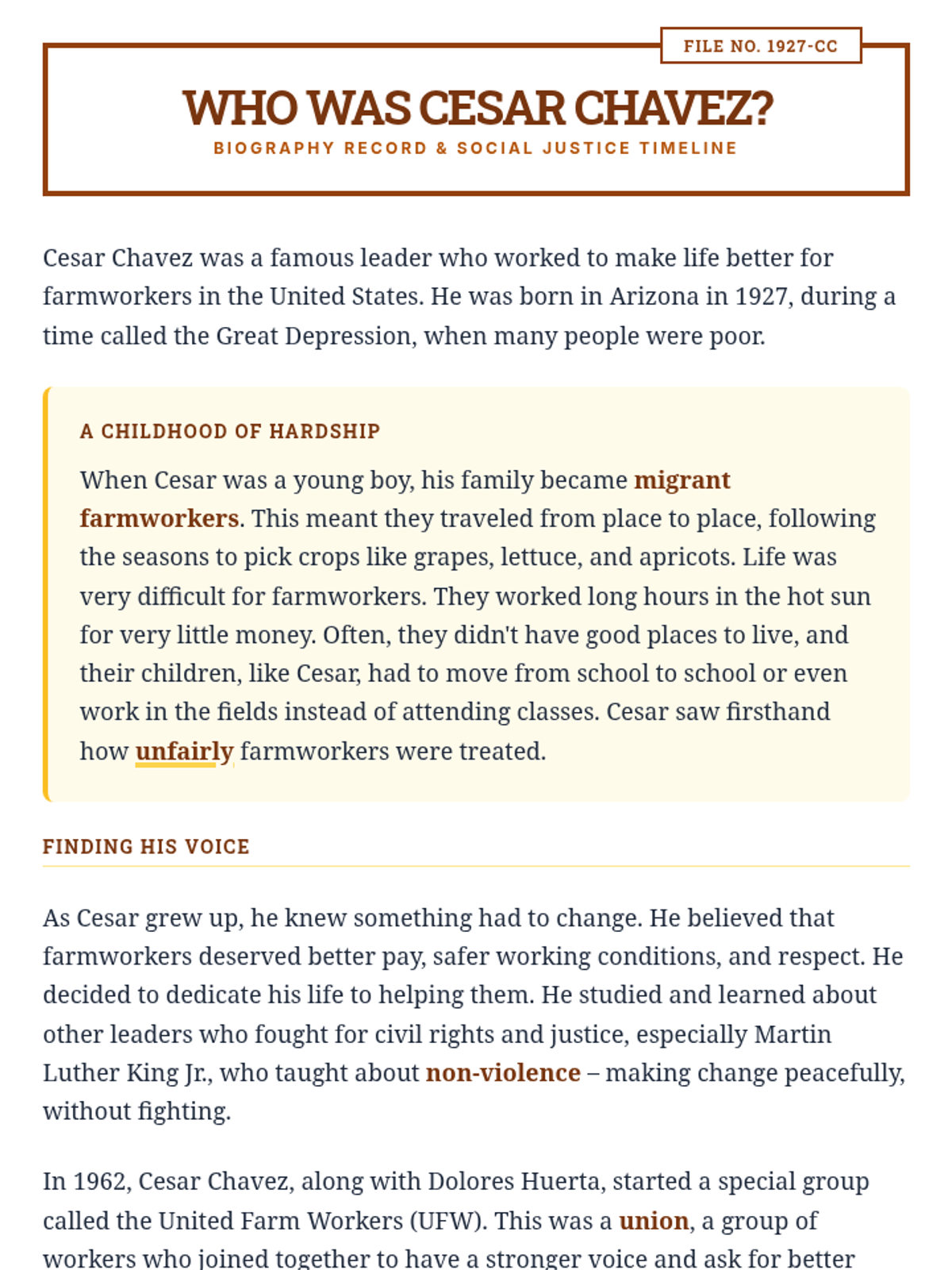 A comprehensive 4th-grade unit combining ELA biography studies on Cesar Chavez and Jacob Riis with a foundational math lesson on comparing fractions. Students explore social justice and investigative journalism while mastering main ideas, text structures, and fraction comparison strategies.
