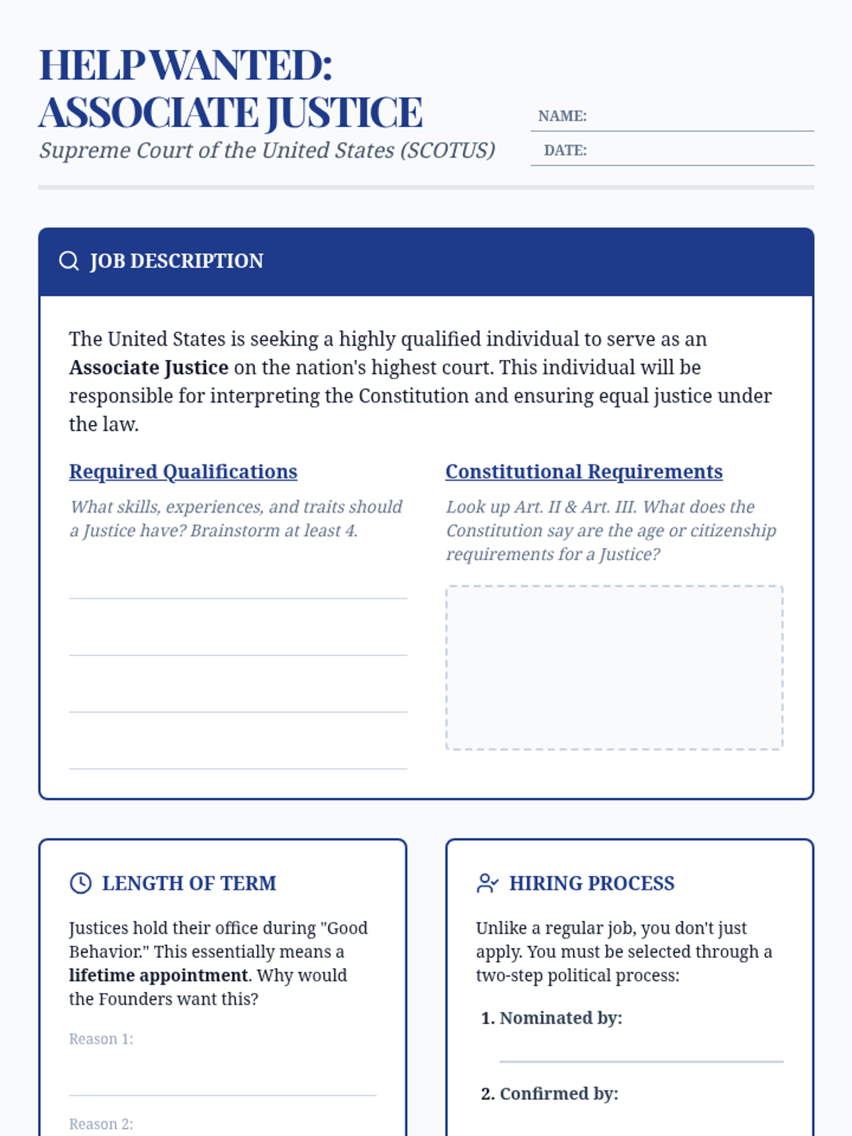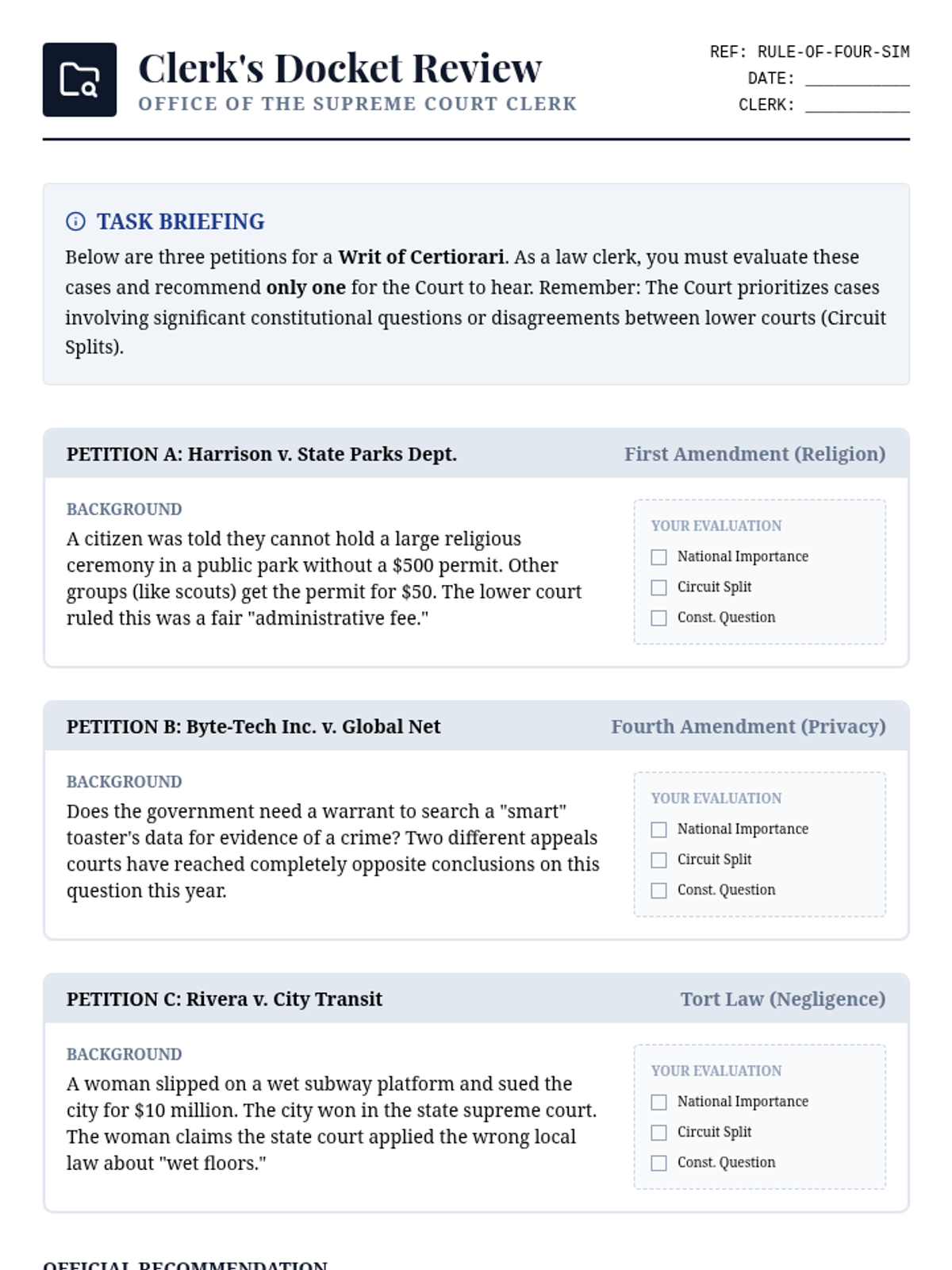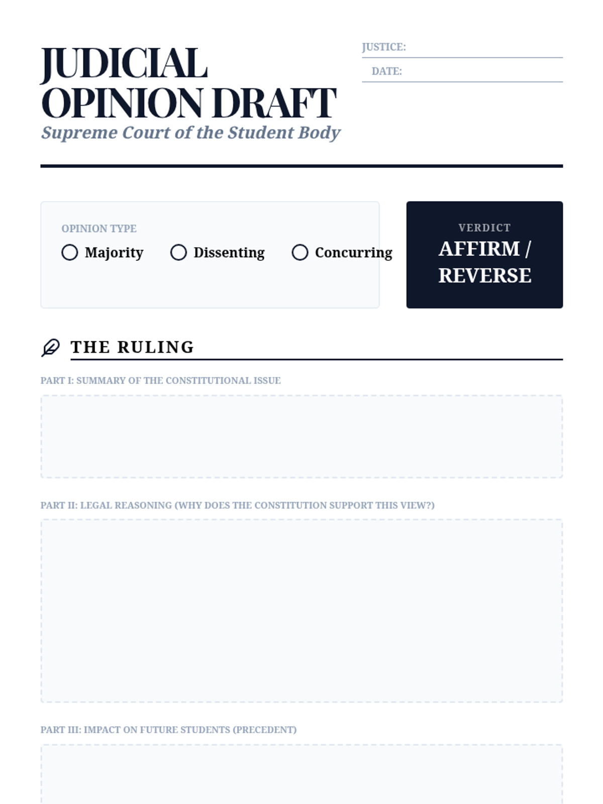 A deep dive into the operations of the Supreme Court, focusing on justice selection, case selection (certiorari), landmark student rights cases, oral arguments, and the writing of judicial opinions. Students participate in simulations and moot courts to understand how constitutional interpretation evolves over time.