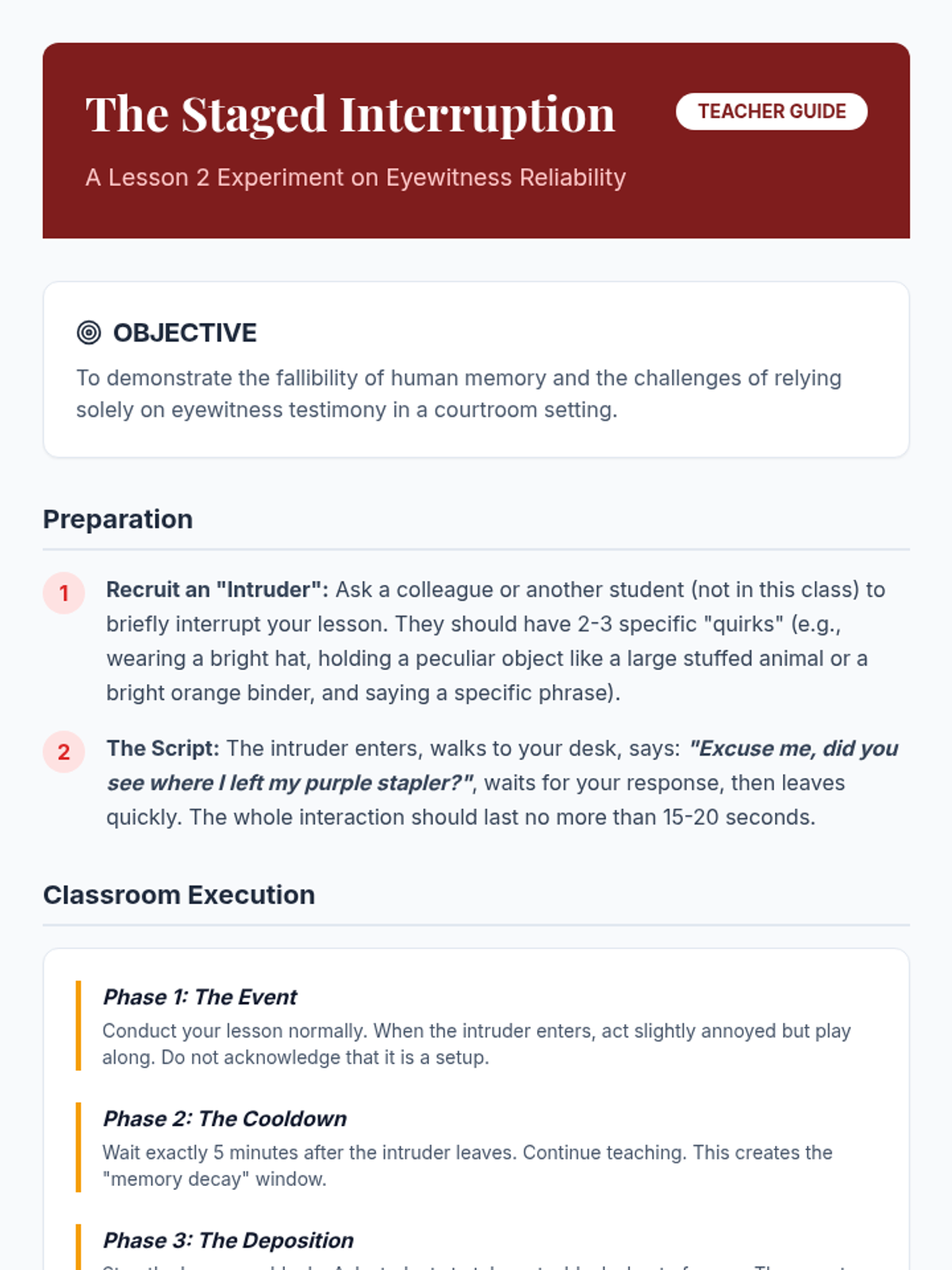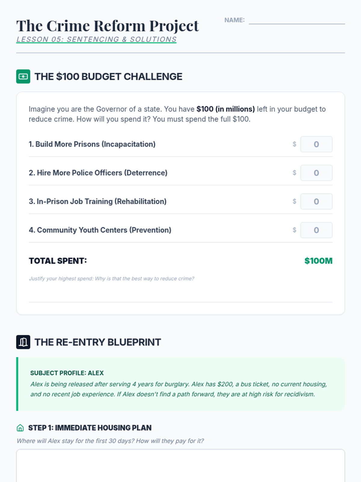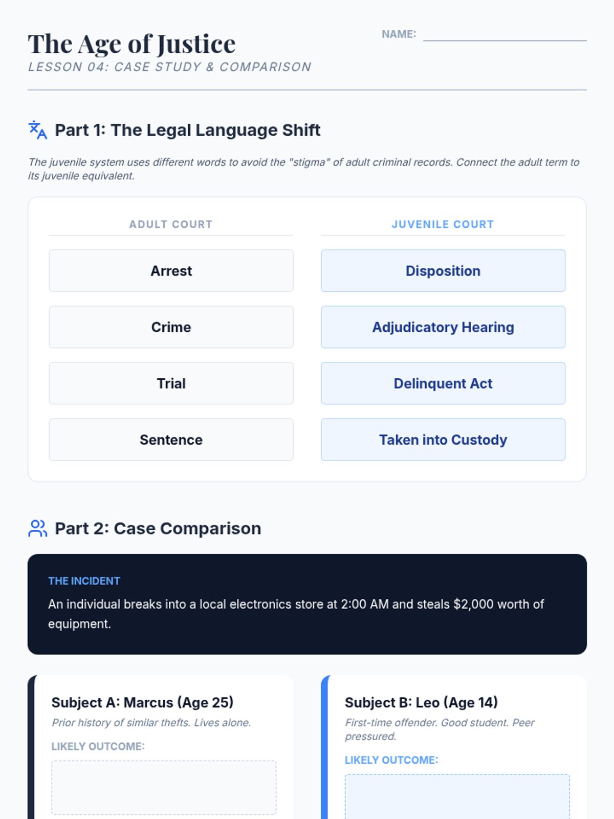 An 8th-grade civics sequence exploring the American judicial system through simulations, case studies, and critical analysis of the criminal justice process, from courtroom procedures to sentencing and juvenile justice.