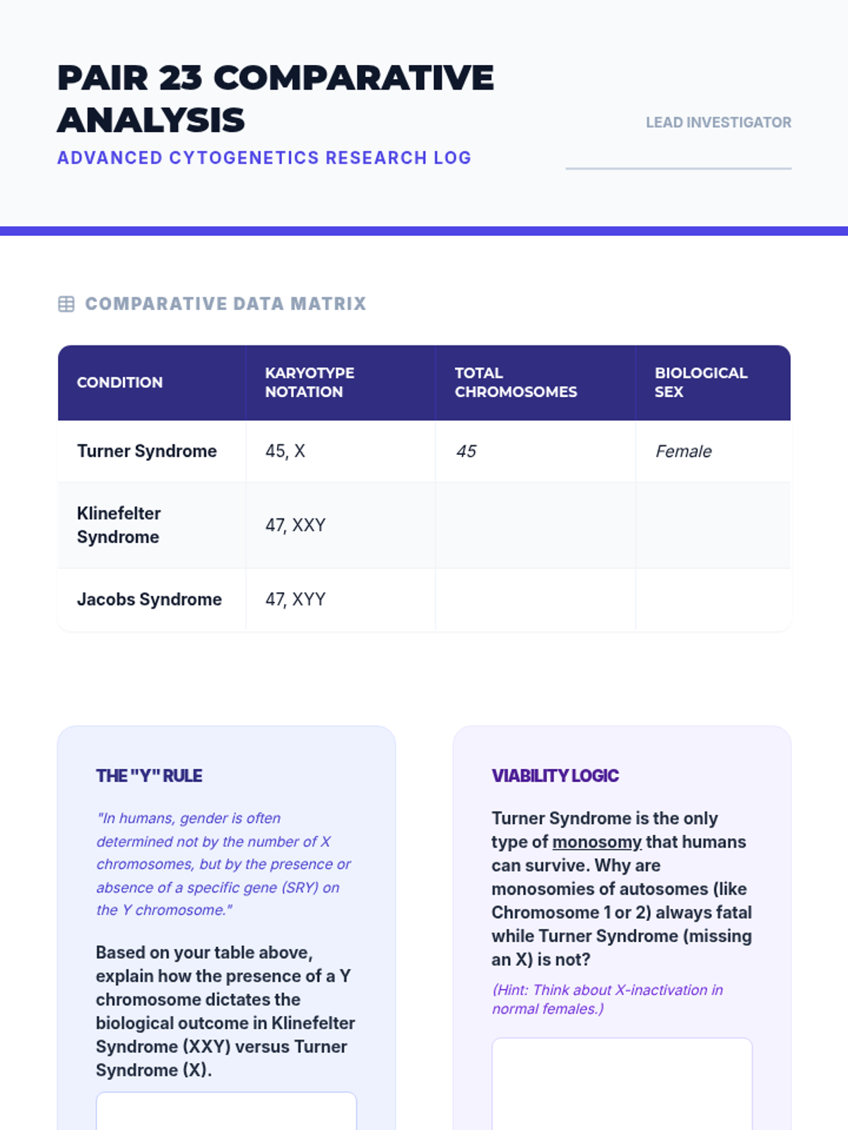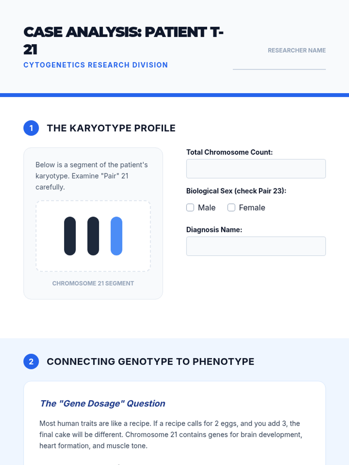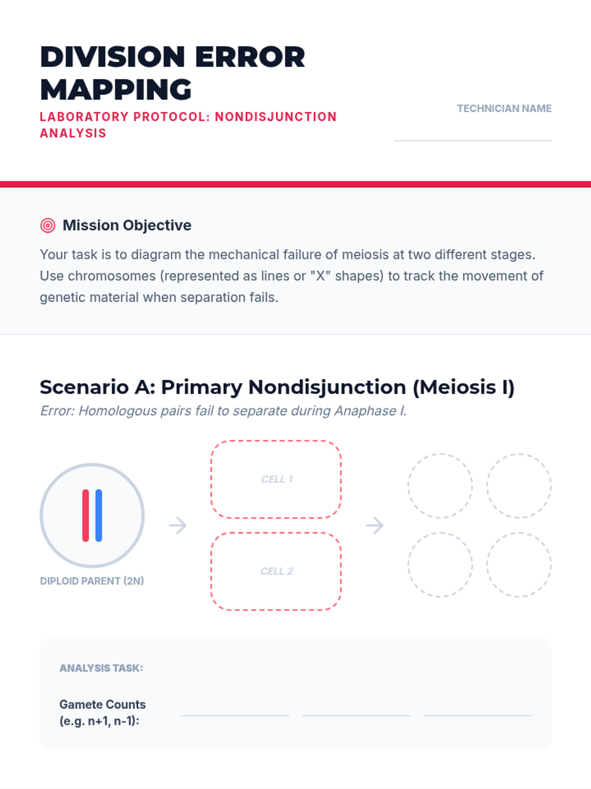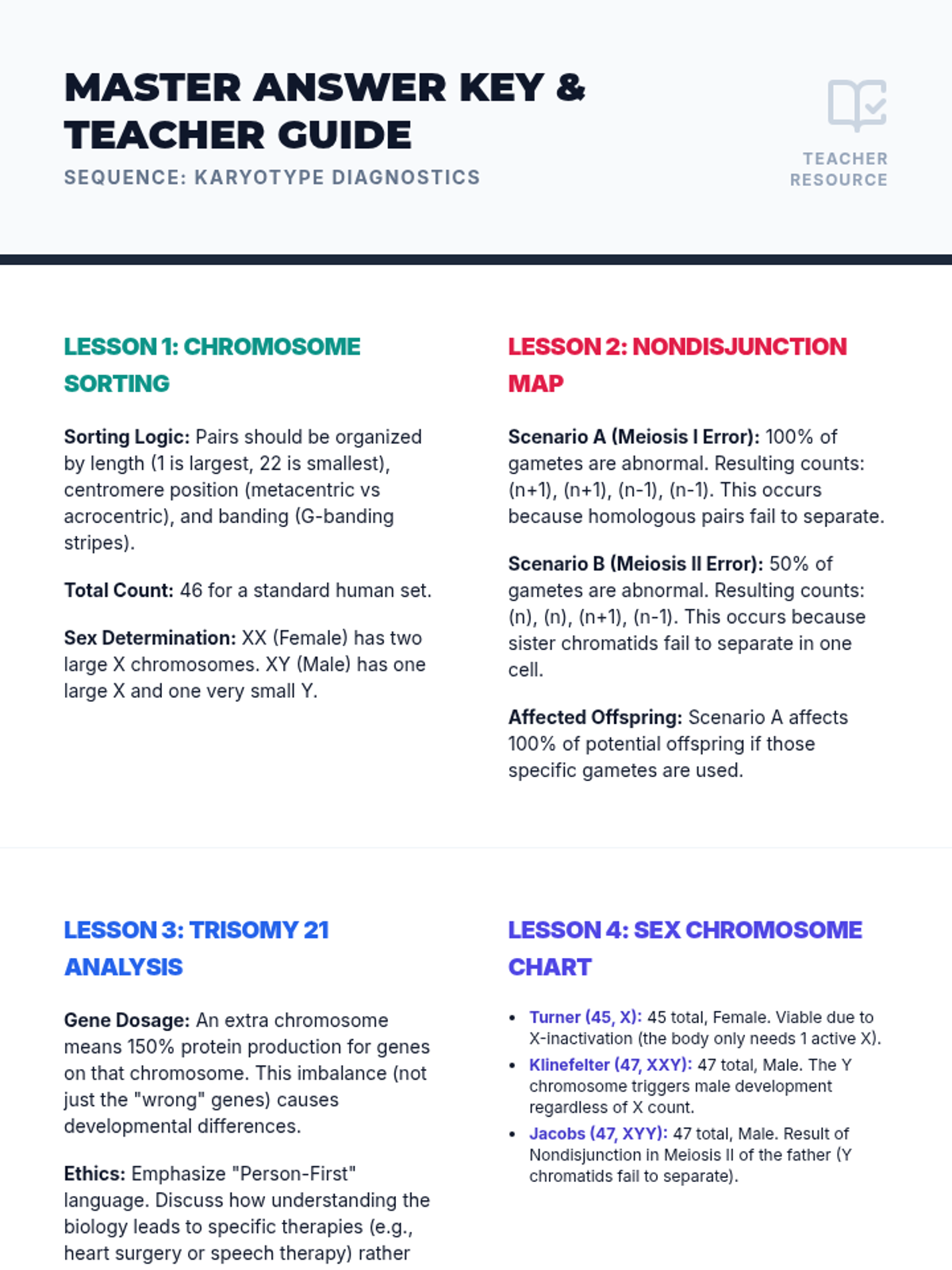 A comprehensive 8th-grade biology sequence where students act as cytogeneticists to investigate meiosis, karyotyping, and chromosomal abnormalities. Through case studies and a final lab simulation, students explore the consequences of nondisjunction and the biological basis of genetic conditions.